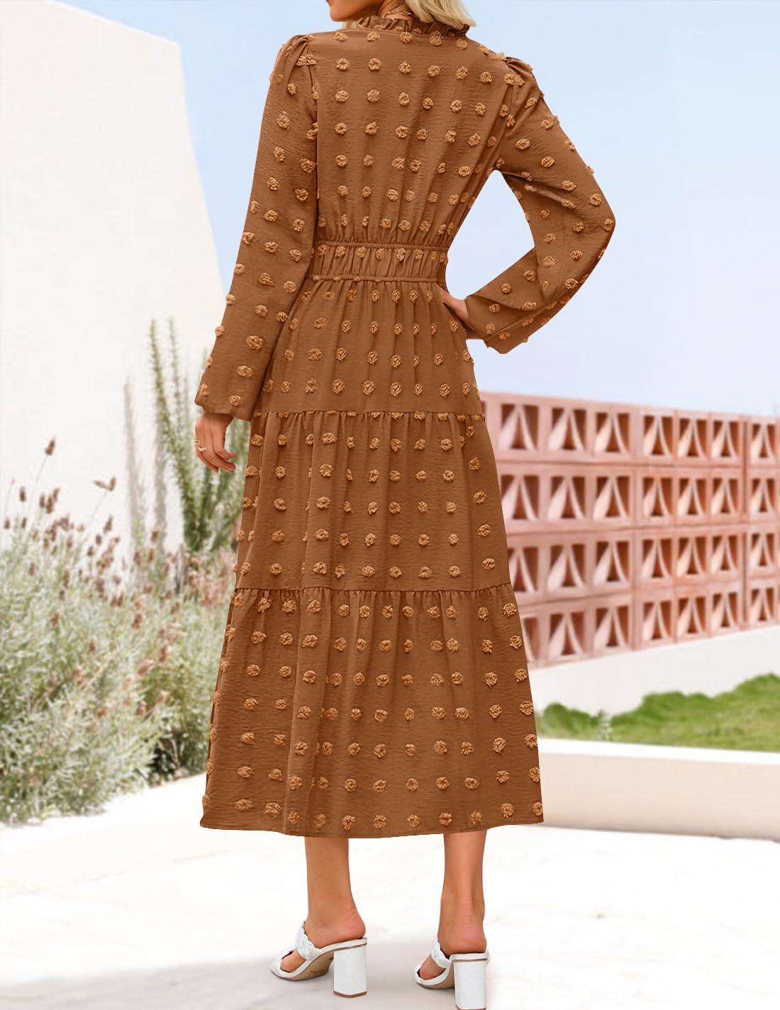 ZESICA Boho Fall Maxi Dresses for Women 2025 Dressy Casual Long Sleeve Swiss Dot Tiered Flowy Swing Wedding Guest Long Dress(Caramel)