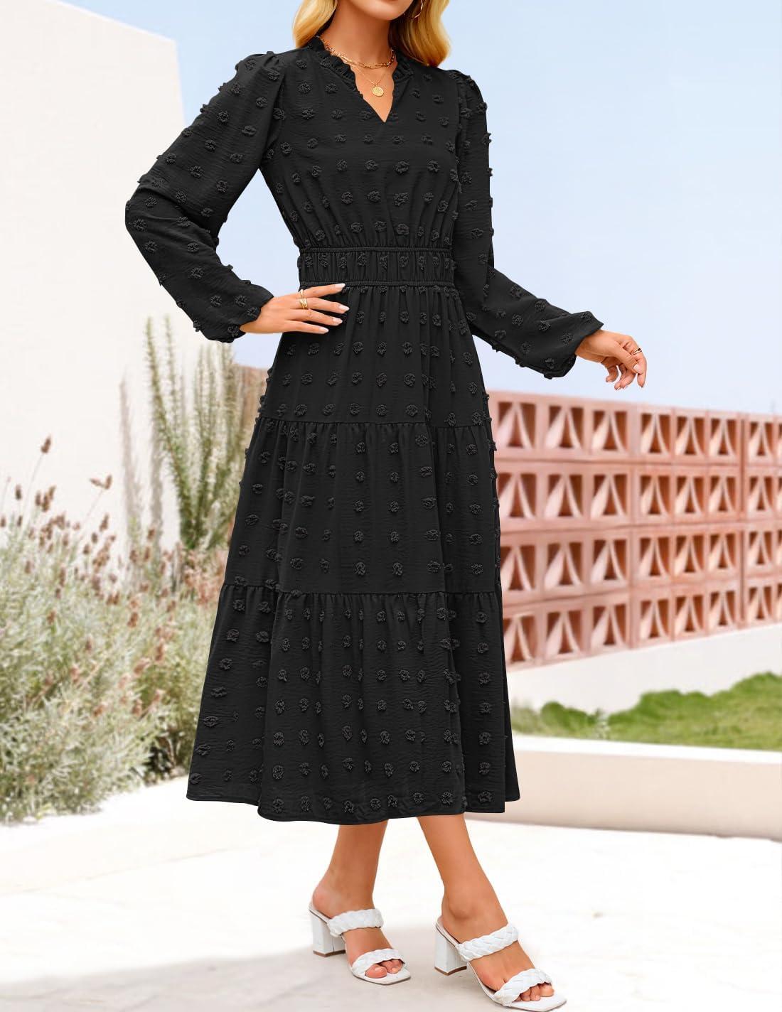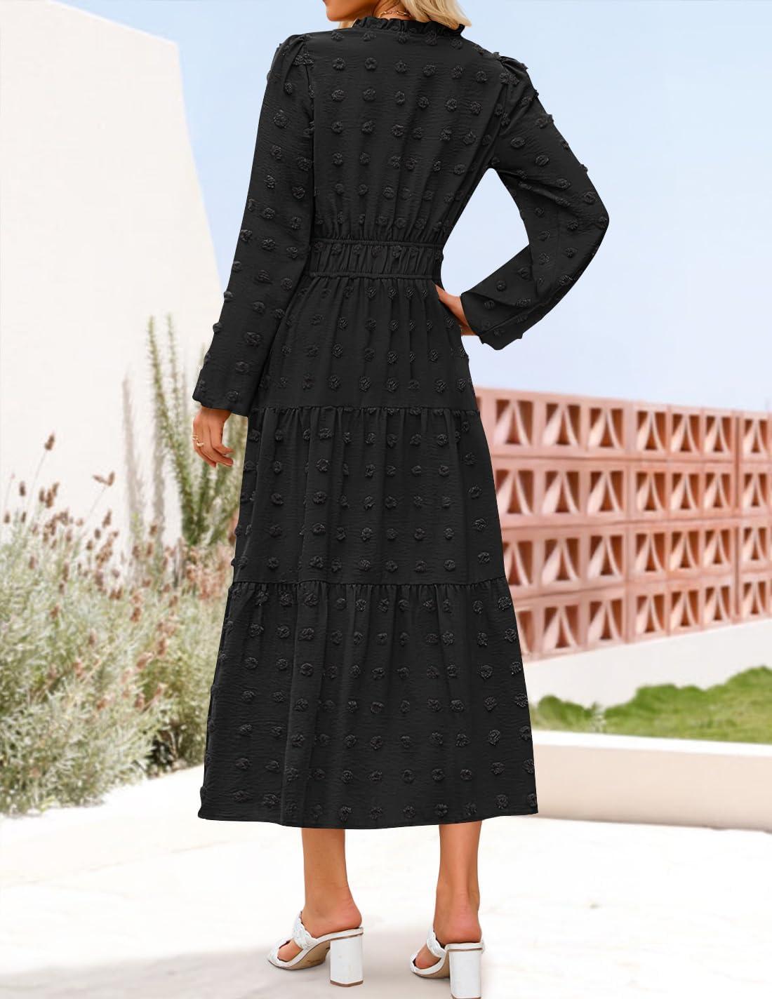 ZESICA Boho Fall Maxi Dresses for Women 2025 Dressy Casual Long Sleeve Swiss Dot Tiered Flowy Swing Wedding Guest Long Dress(Darkblack)