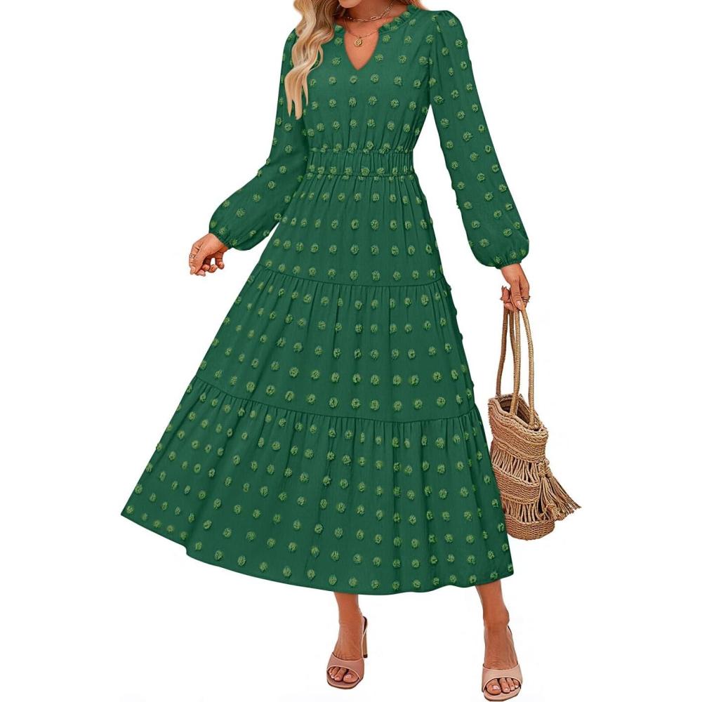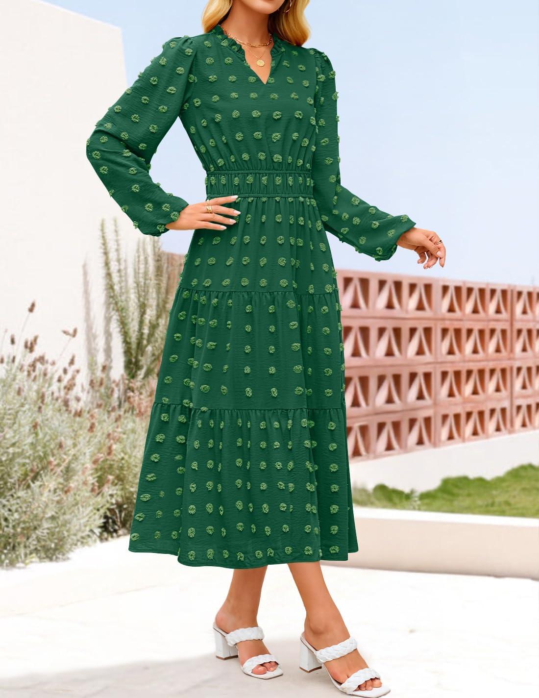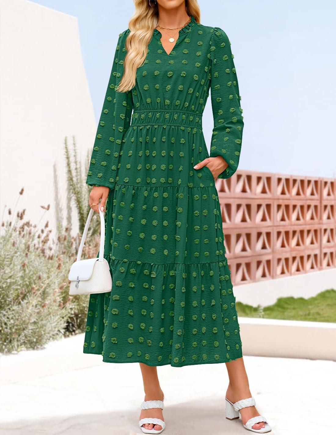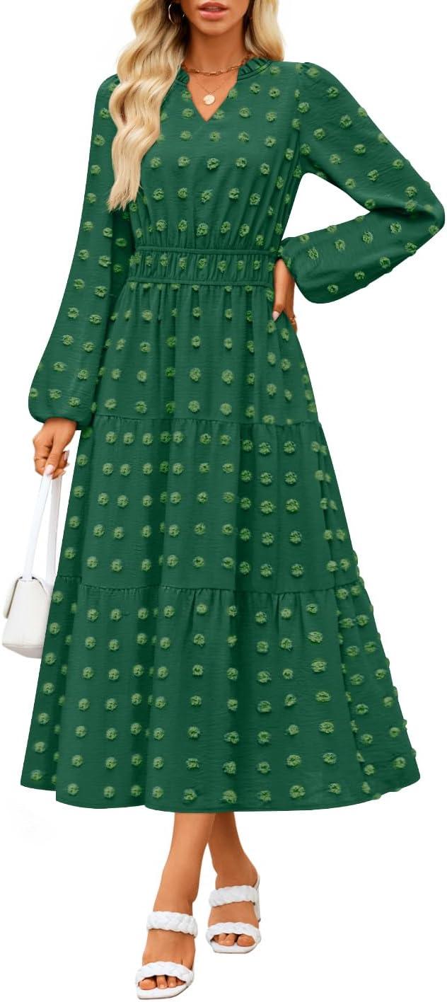 ZESICA Boho Fall Maxi Dresses for Women 2025 Dressy Casual Long Sleeve Swiss Dot Tiered Flowy Swing Wedding Guest Long Dress(Darkgreen)