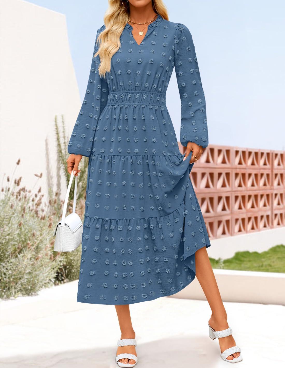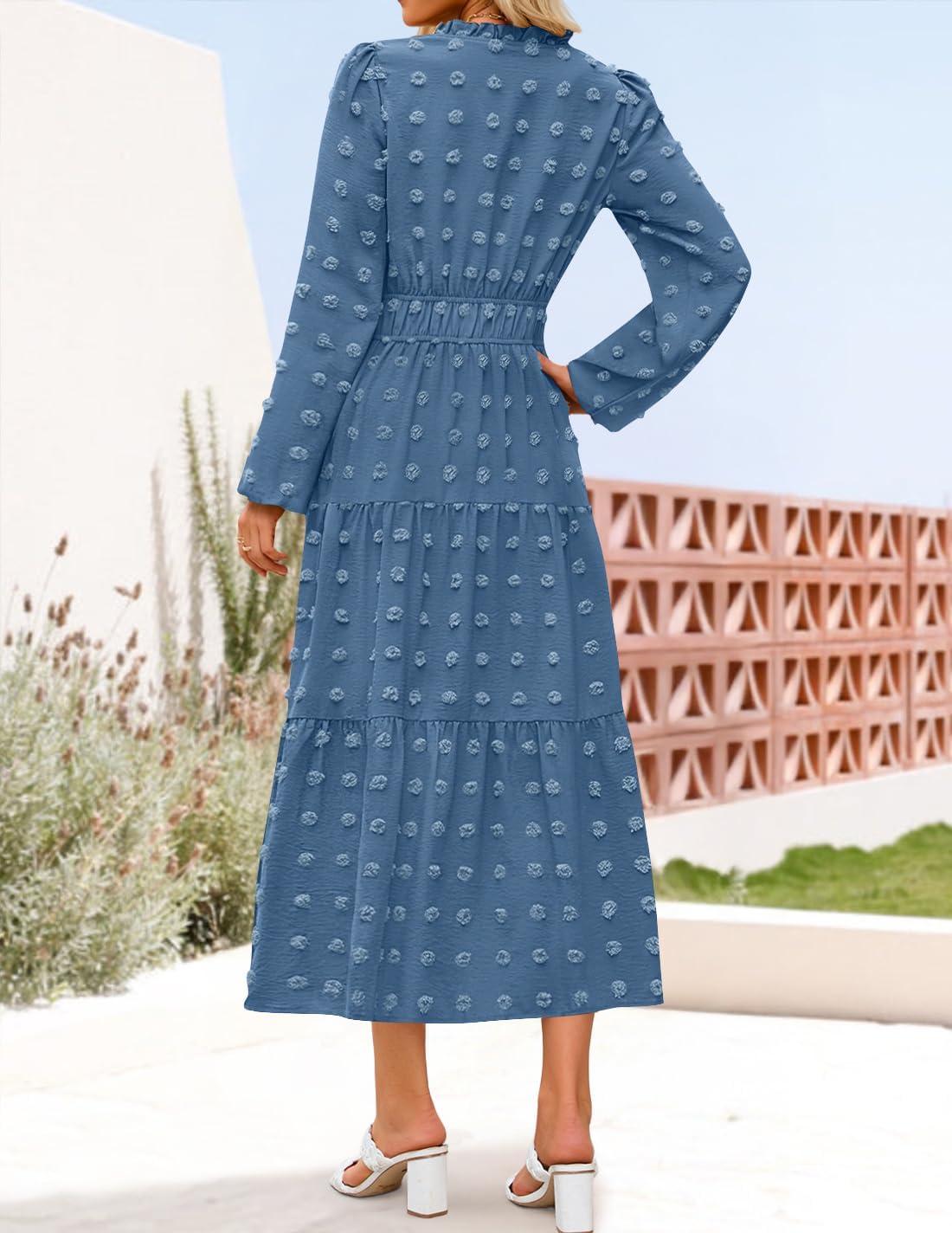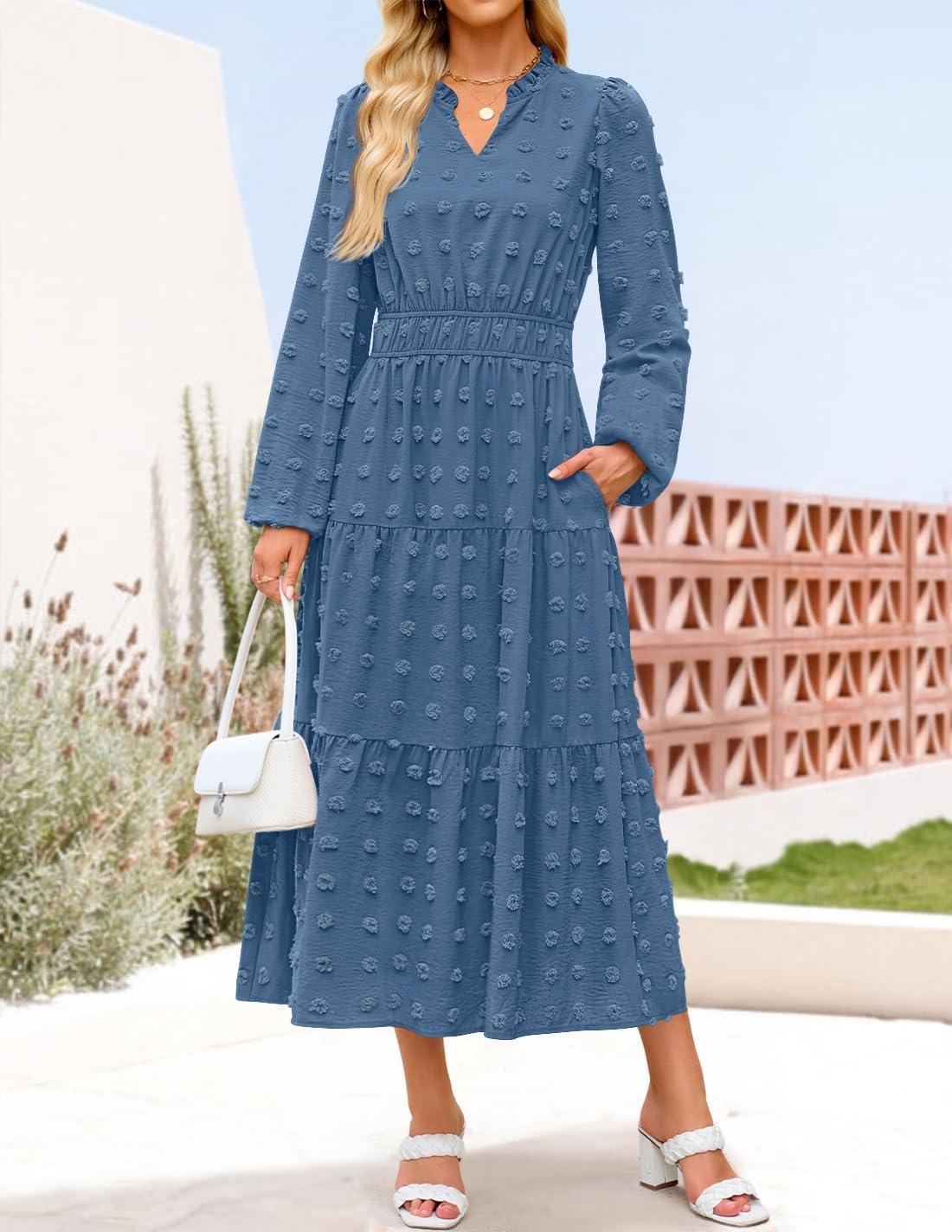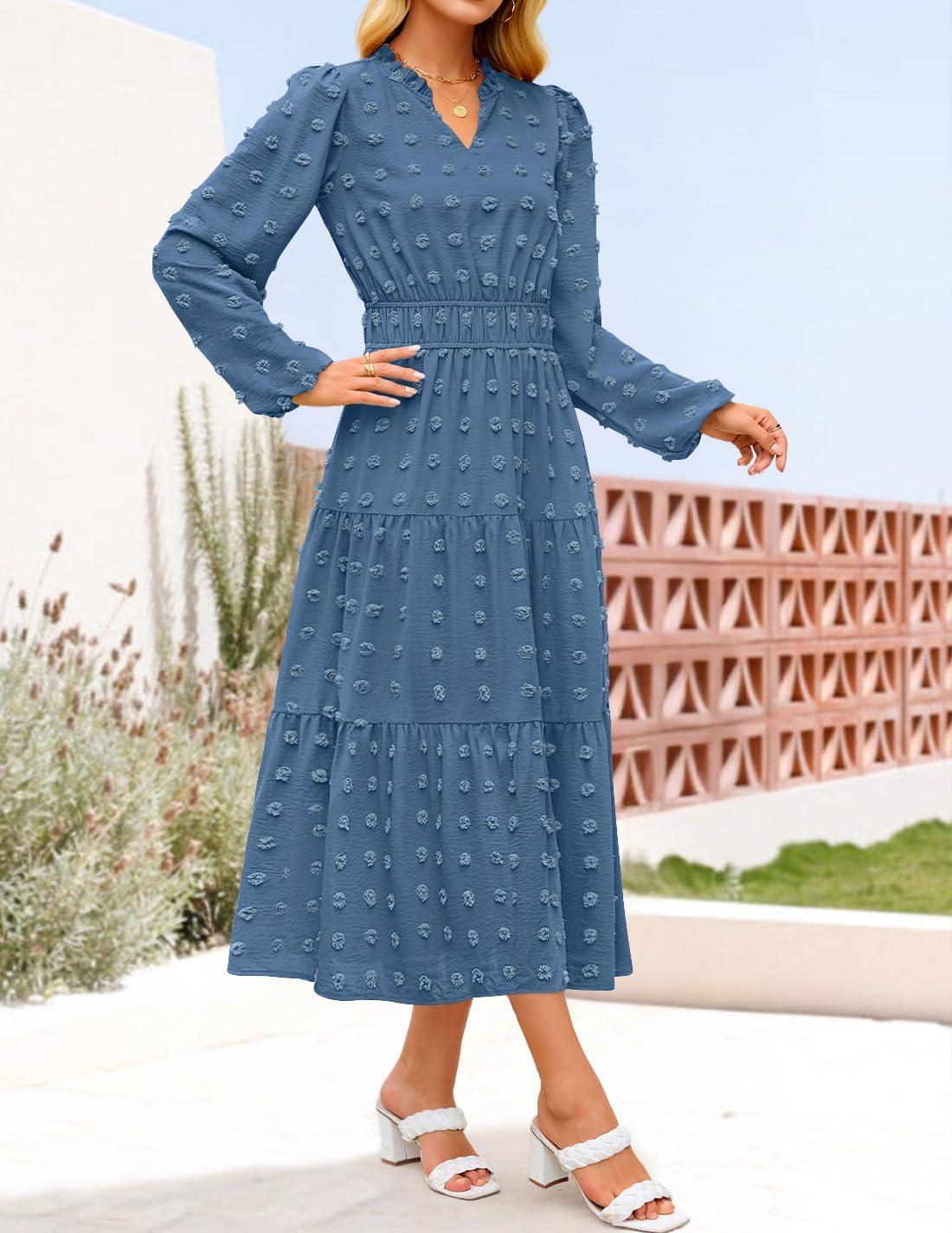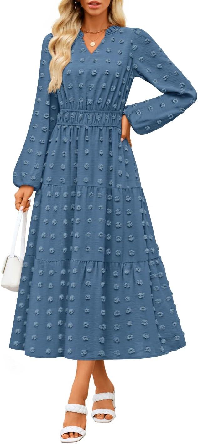 ZESICA Boho Fall Maxi Dresses for Women 2025 Dressy Casual Long Sleeve Swiss Dot Tiered Flowy Swing Wedding Guest Long Dress(Dustyblue)