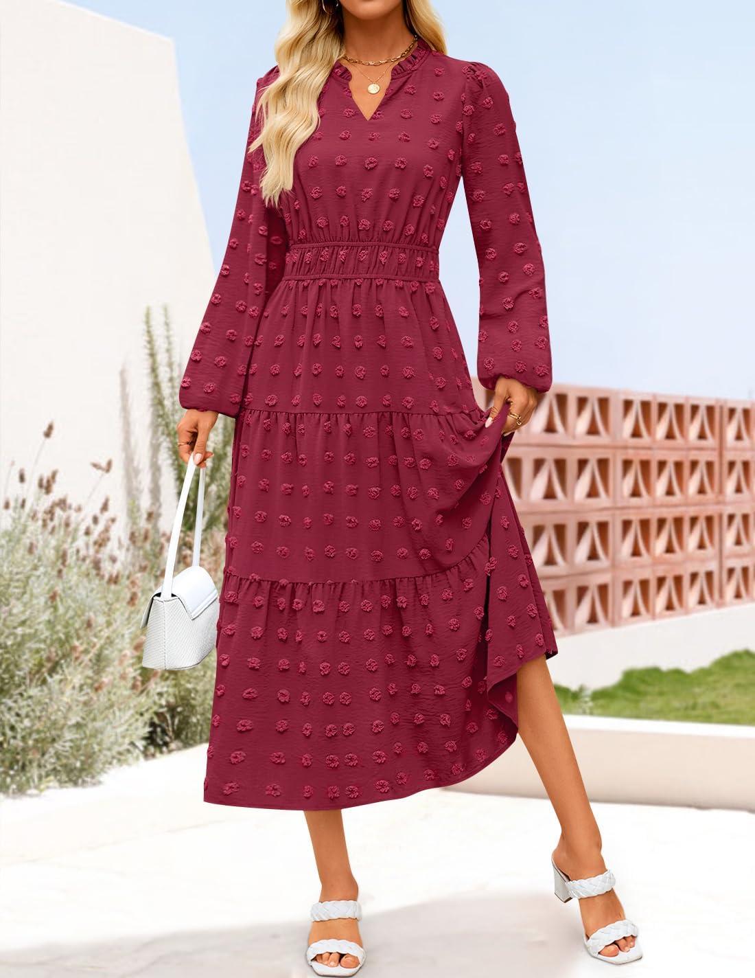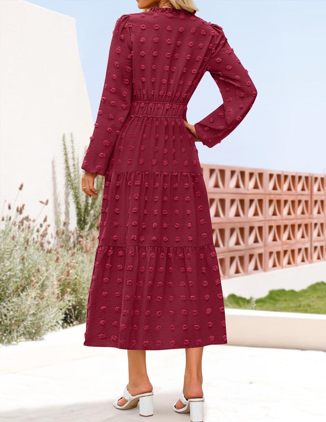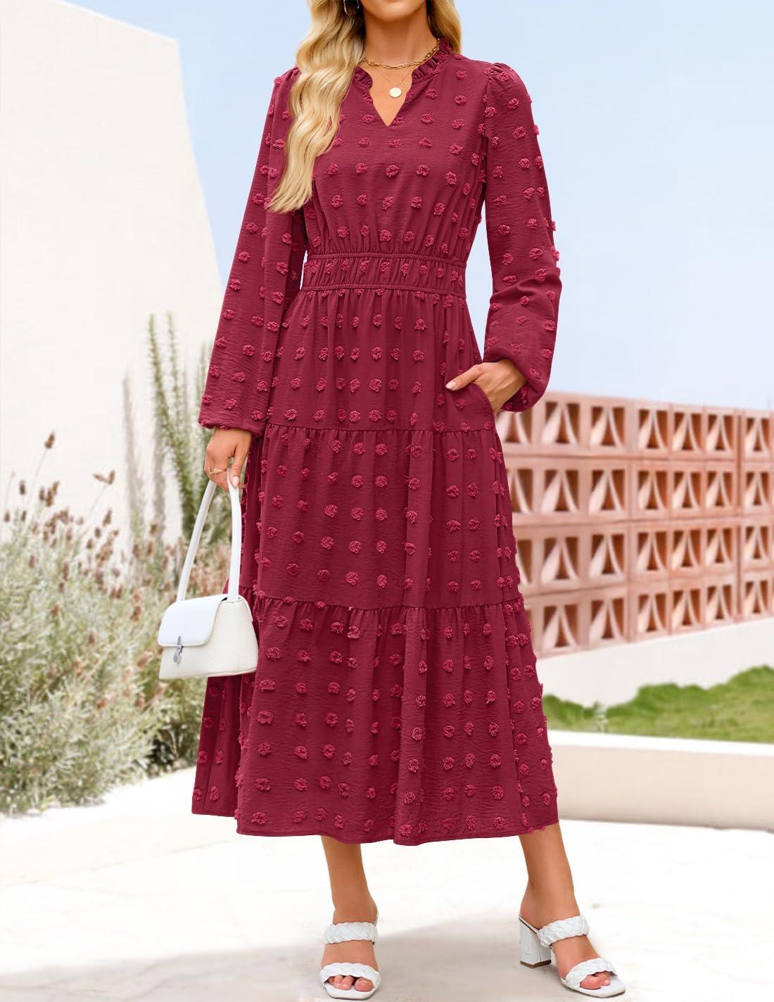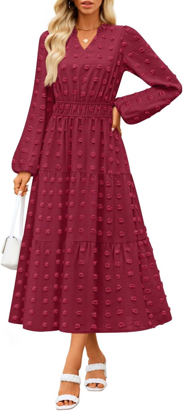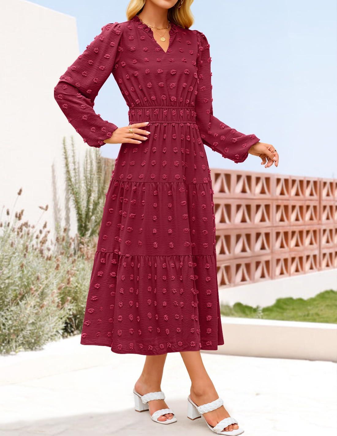 ZESICA Boho Fall Maxi Dresses for Women 2025 Dressy Casual Long Sleeve Swiss Dot Tiered Flowy Swing Wedding Guest Long Dress(Winered)