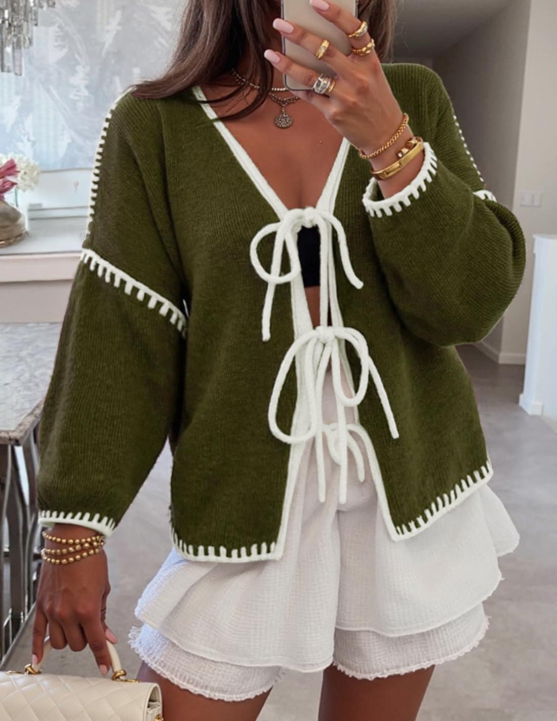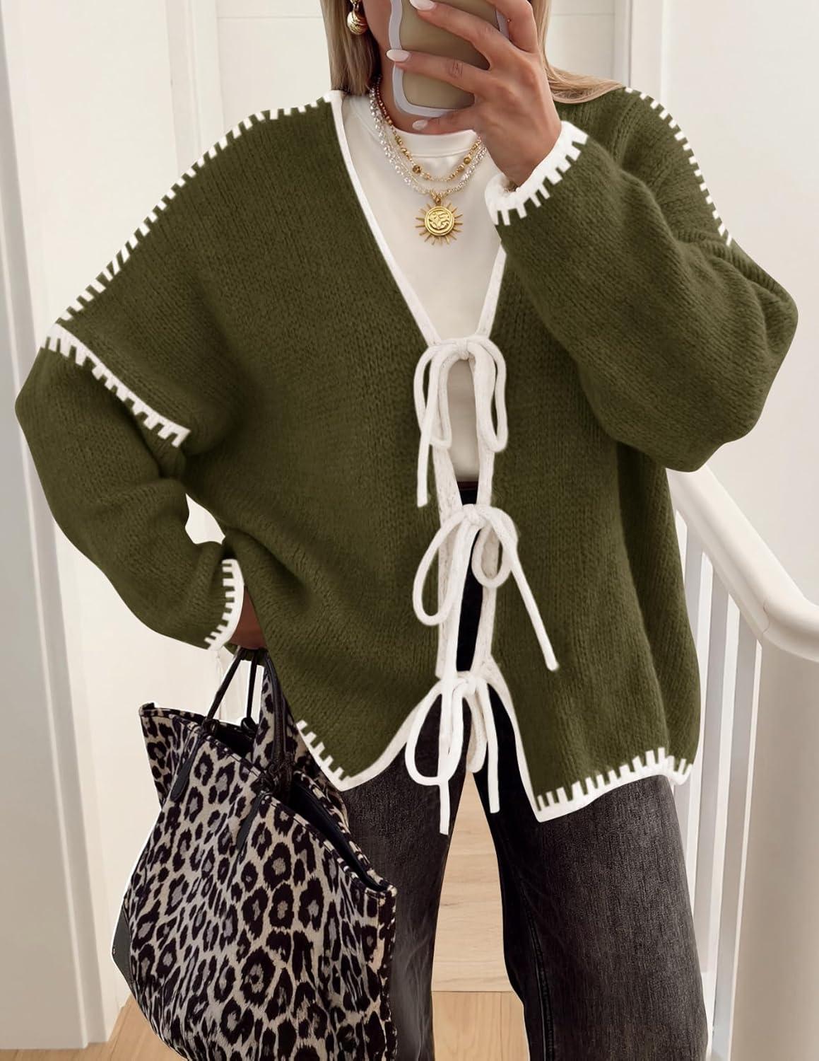 ZESICA Crdigans for Women Trendy 2025 Tie Front Bow Sweaters Casual Long Sleeve Winter Clothing Coats(Armygreen)