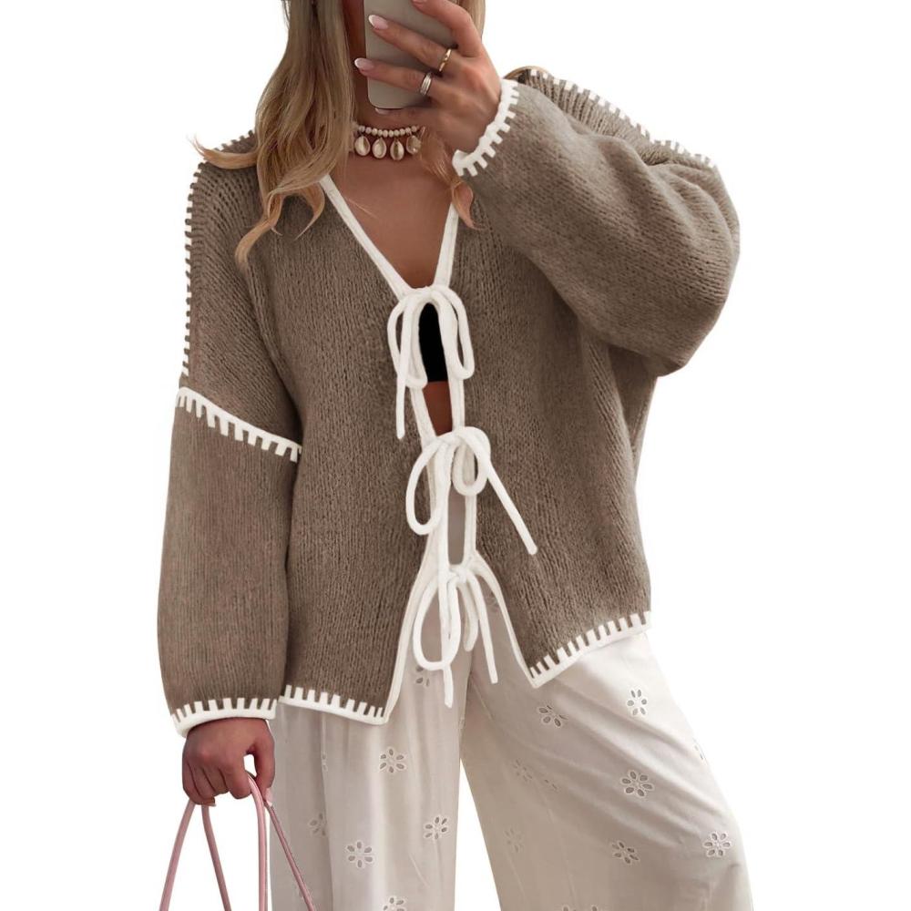ZESICA Crdigans for Women Trendy 2025 Tie Front Bow Sweaters Casual Long Sleeve Winter Clothing Coats(Caramel)