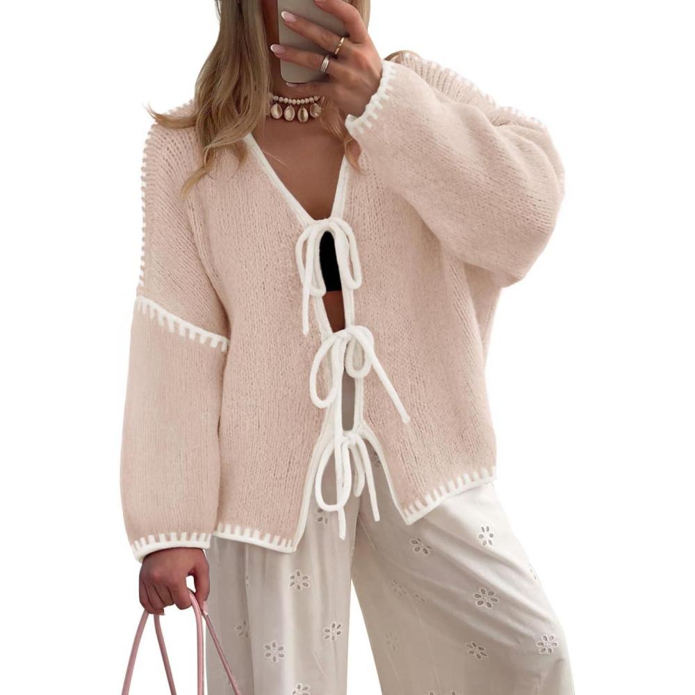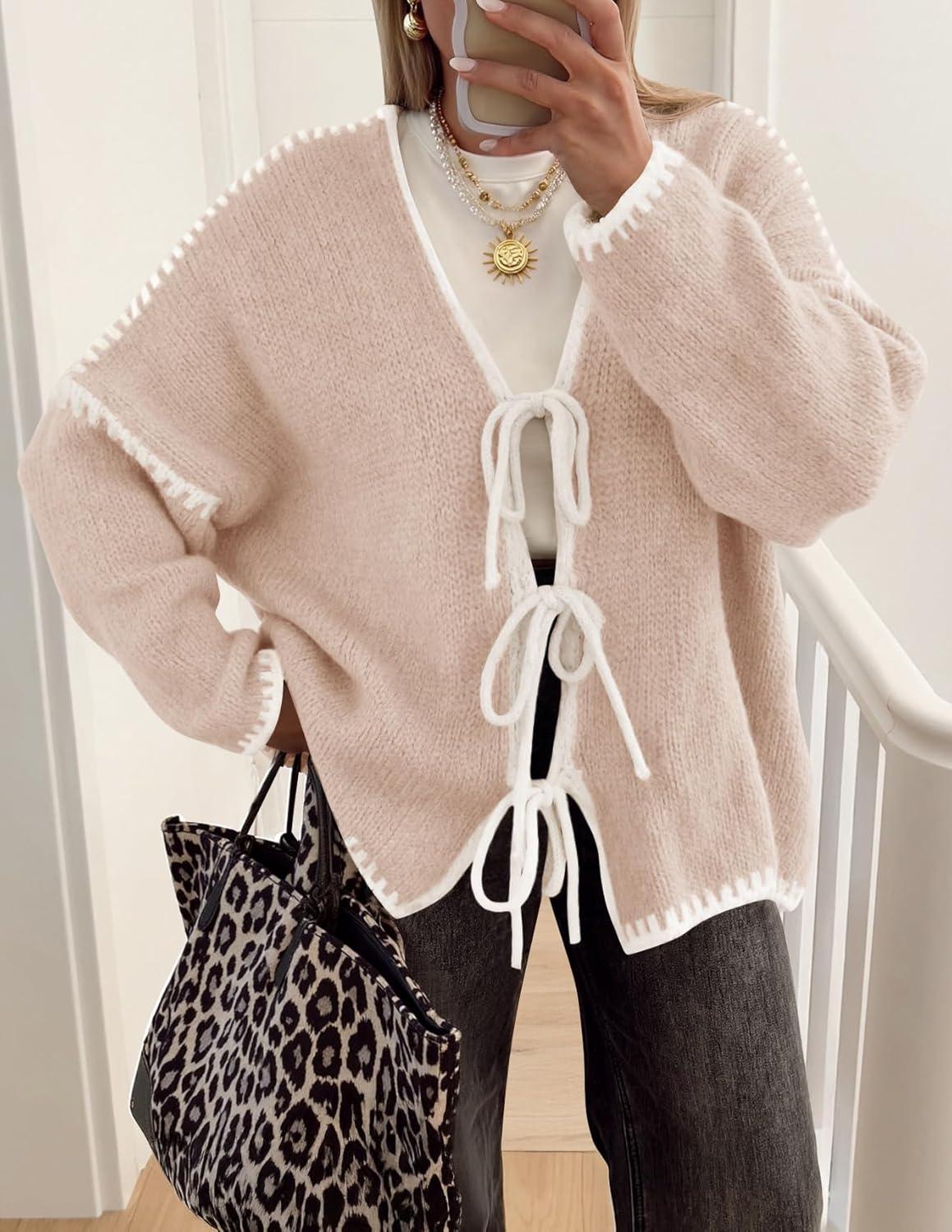 ZESICA Crdigans for Women Trendy 2025 Tie Front Bow Sweaters Casual Long Sleeve Winter Clothing Coats(Oats)