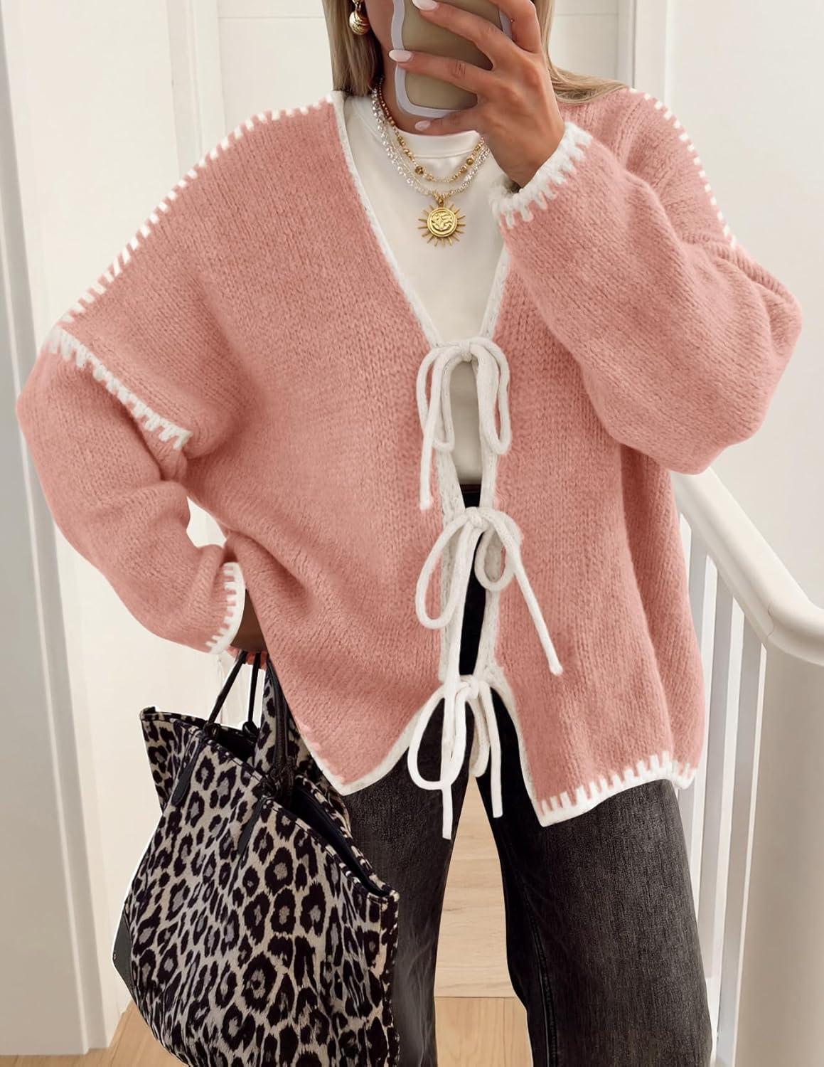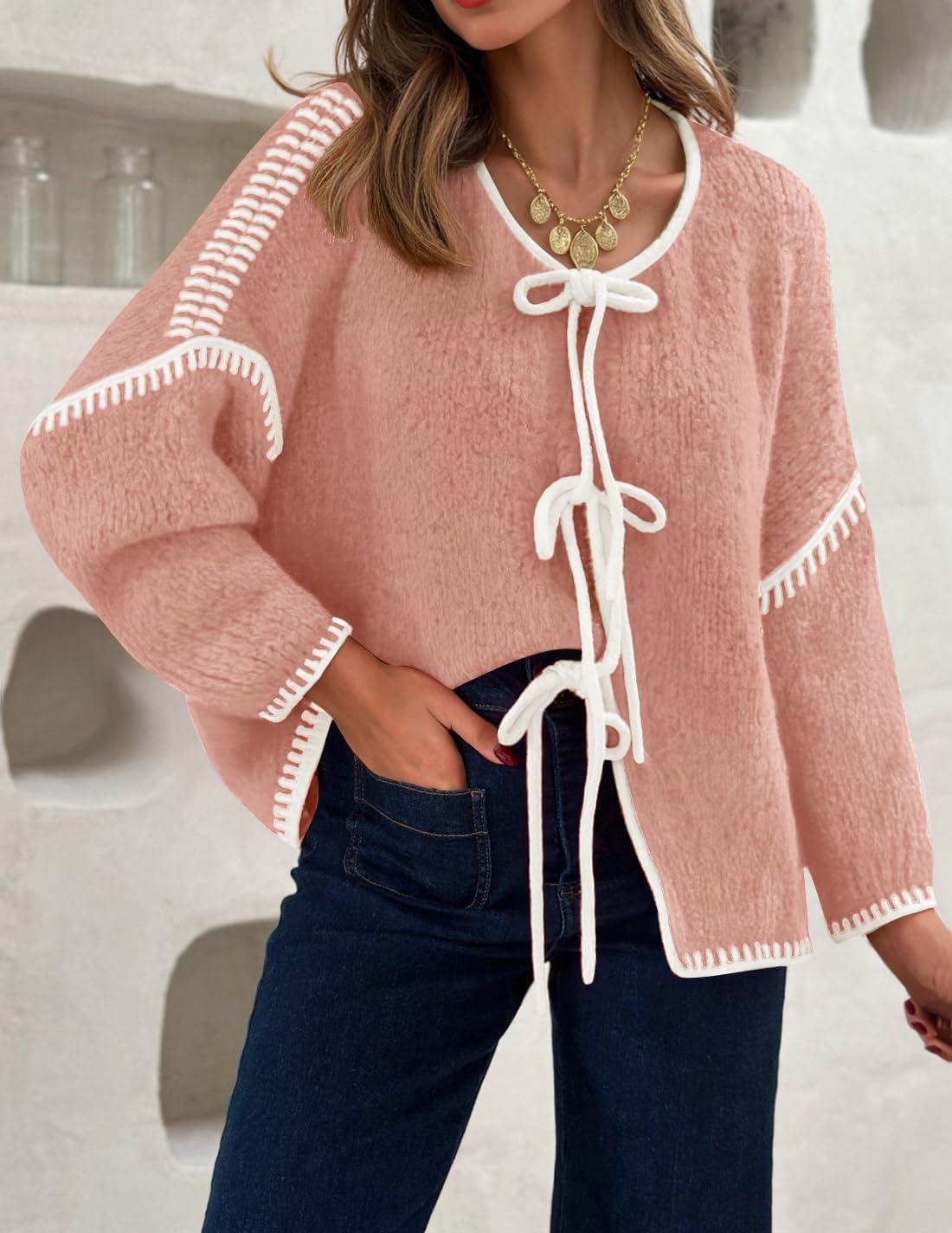 ZESICA Crdigans for Women Trendy 2025 Tie Front Bow Sweaters Casual Long Sleeve Winter Clothing Coats(Pink)