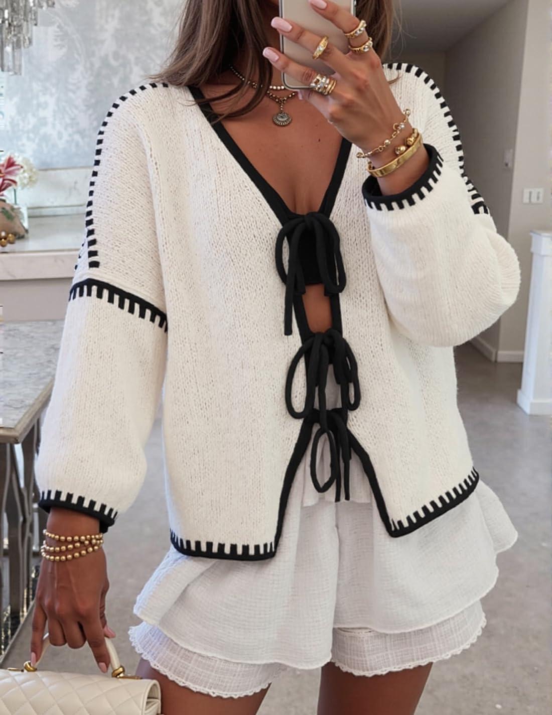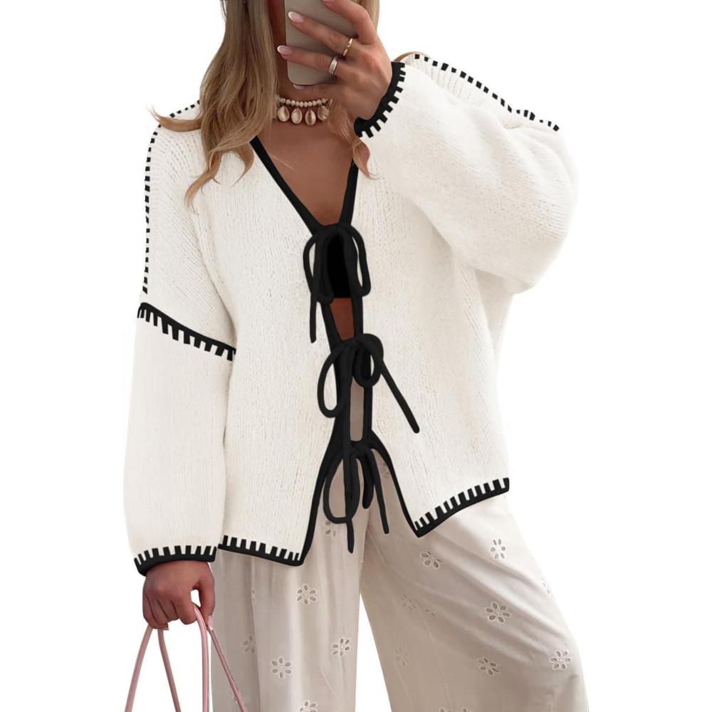 ZESICA Crdigans for Women Trendy 2025 Tie Front Bow Sweaters Casual Long Sleeve Winter Clothing Coats(White)