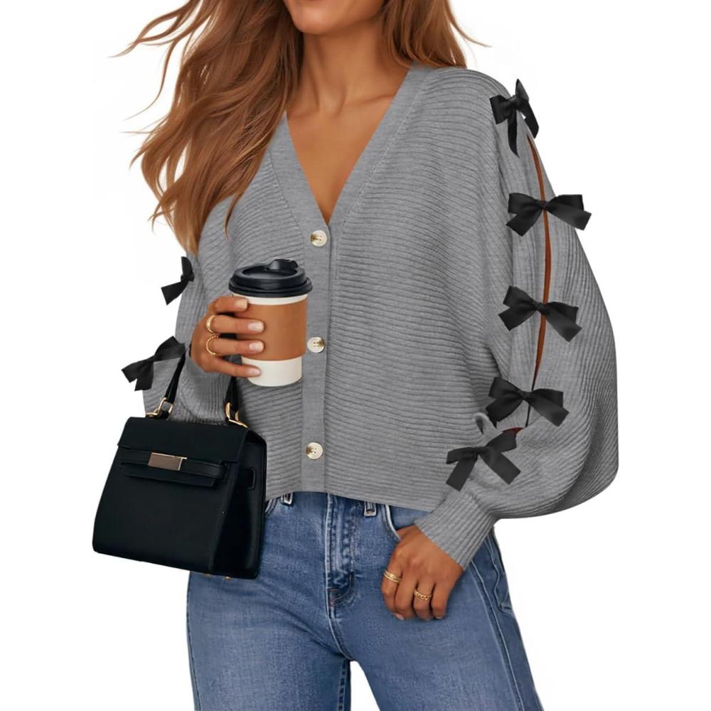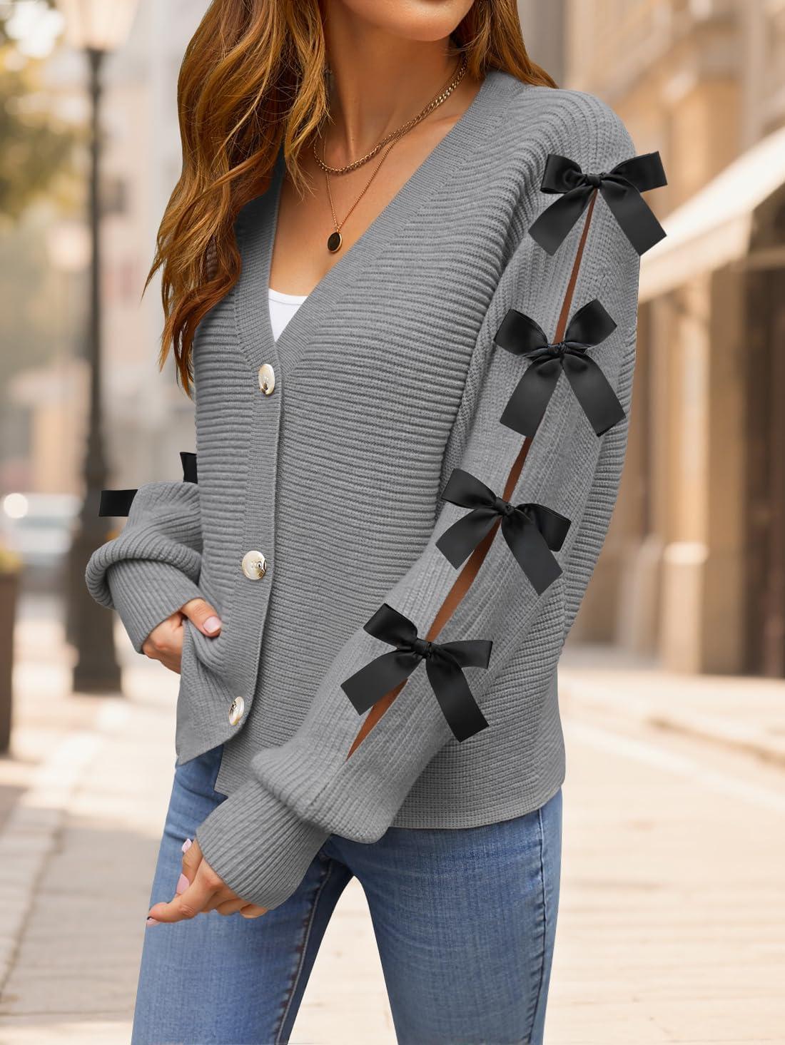ZESICA Fall Bow Cardigans for Women Trendy 2025 Casual Long Sleeve Button V Neck Knit Sweater Outerwear Coats(Gray)