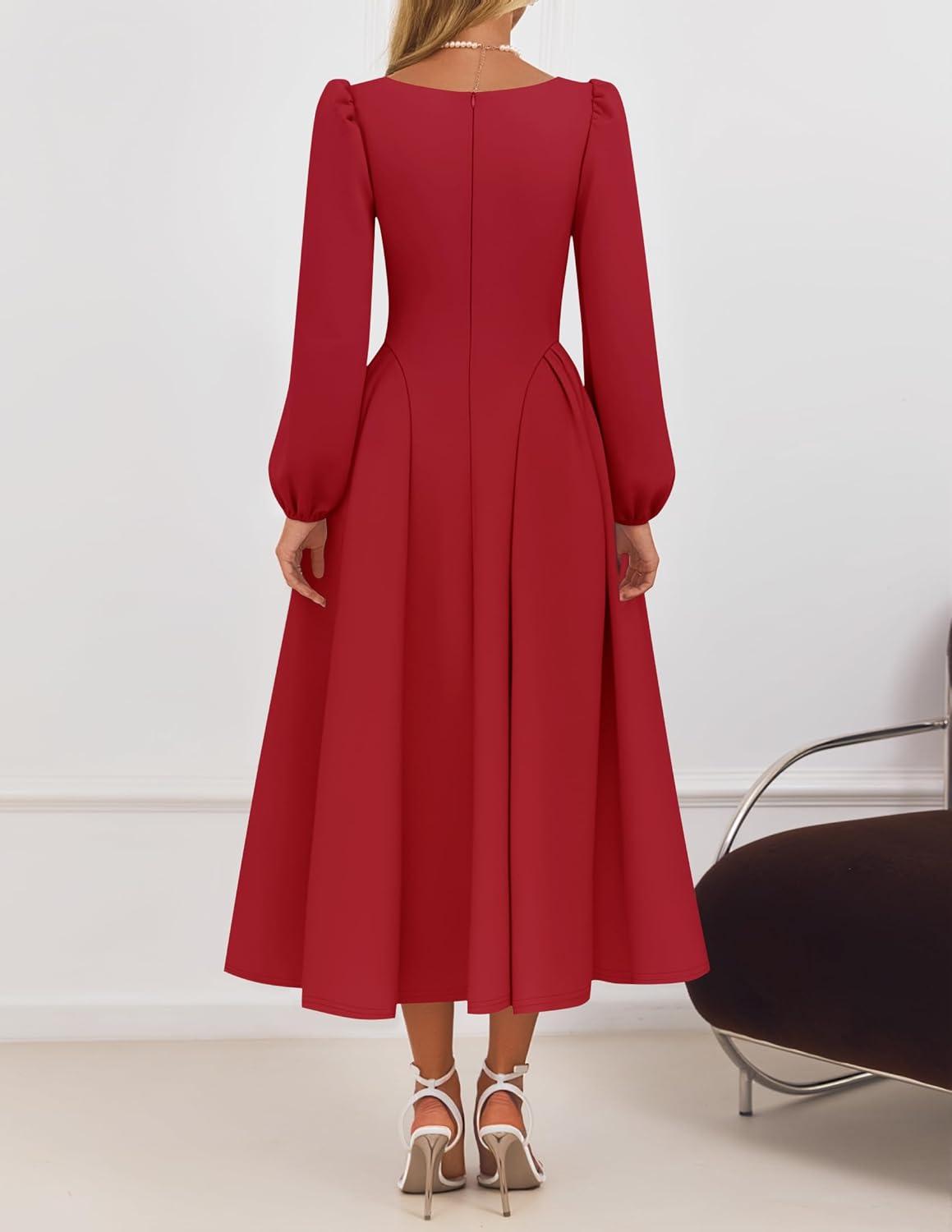 ZESICA Fall Cocktail Dresses for Women Wedding Guest 2025 Elegant Long Sleeve Square Neck Swing Evening Prom Midi Dress(Red)