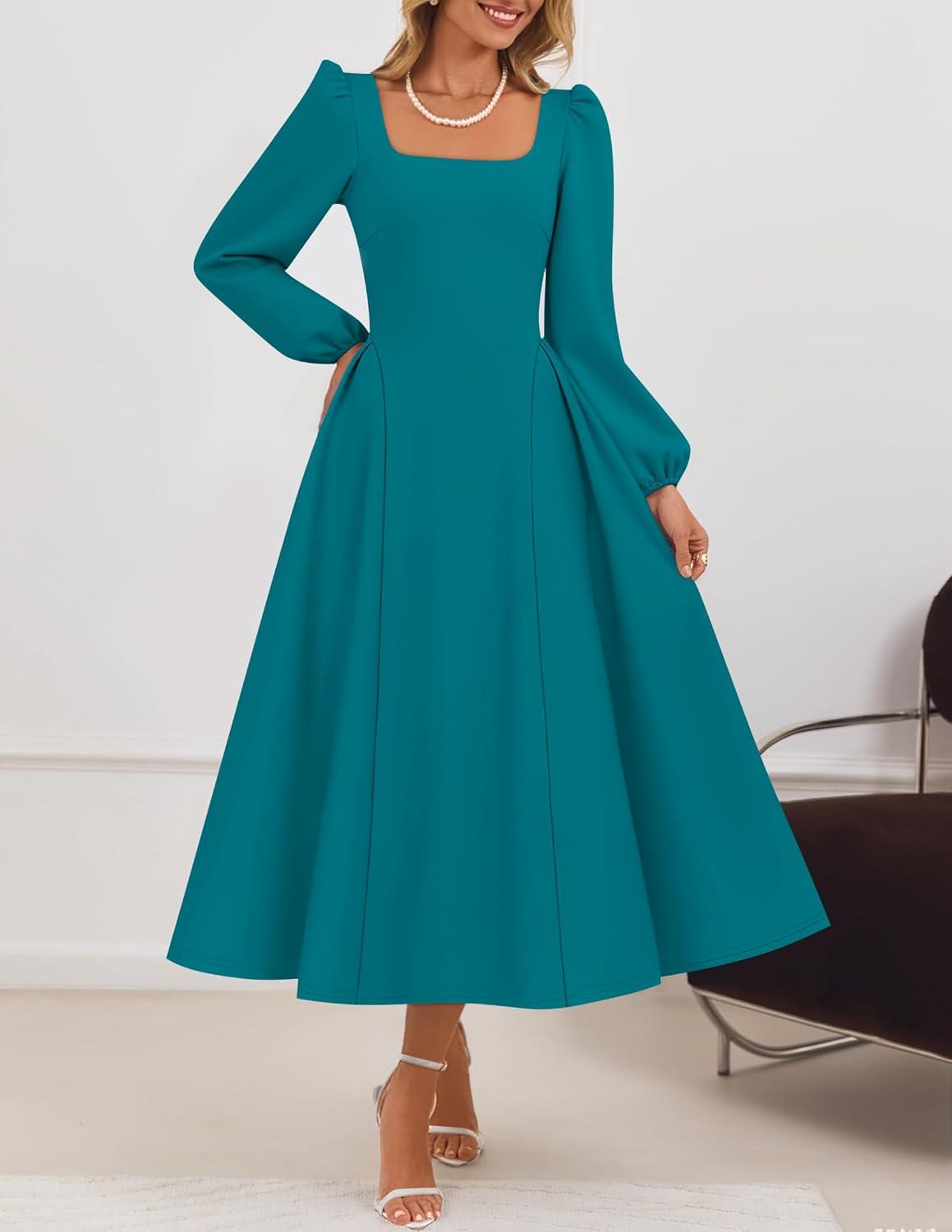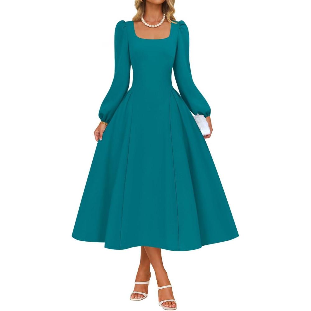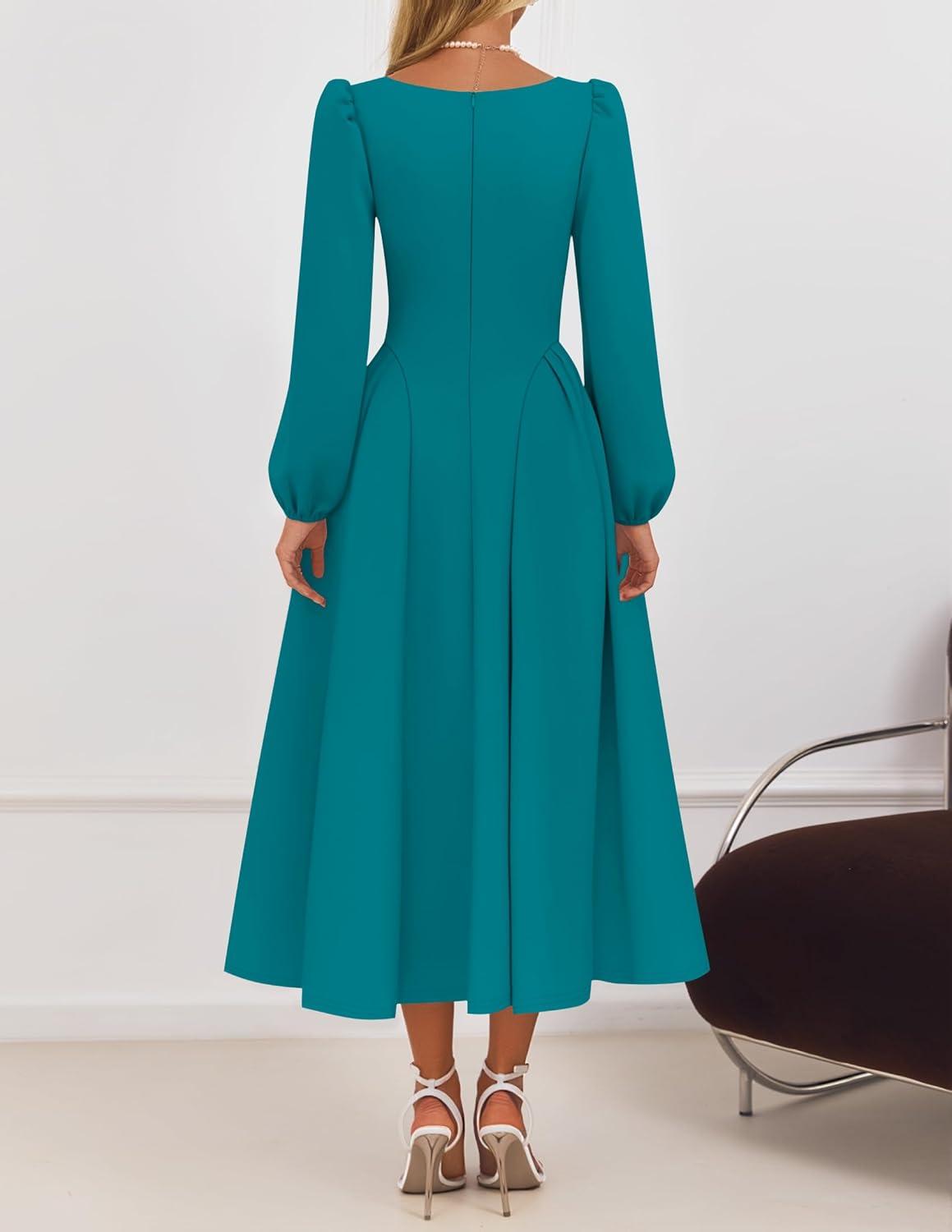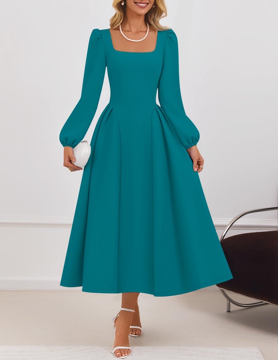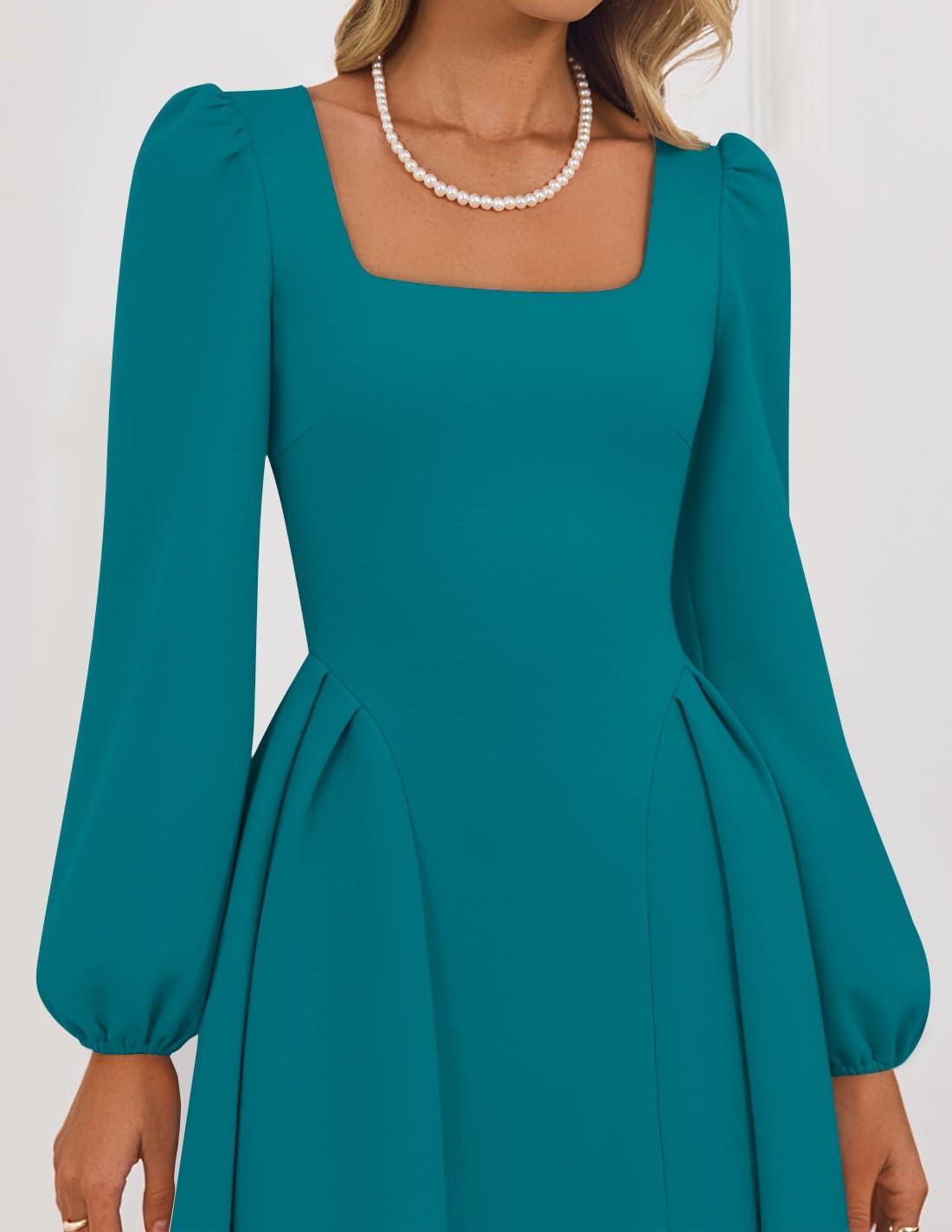 ZESICA Fall Cocktail Dresses for Women Wedding Guest 2025 Elegant Long Sleeve Square Neck Swing Evening Prom Midi Dress(Teal)