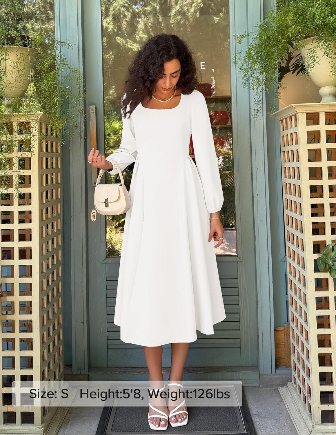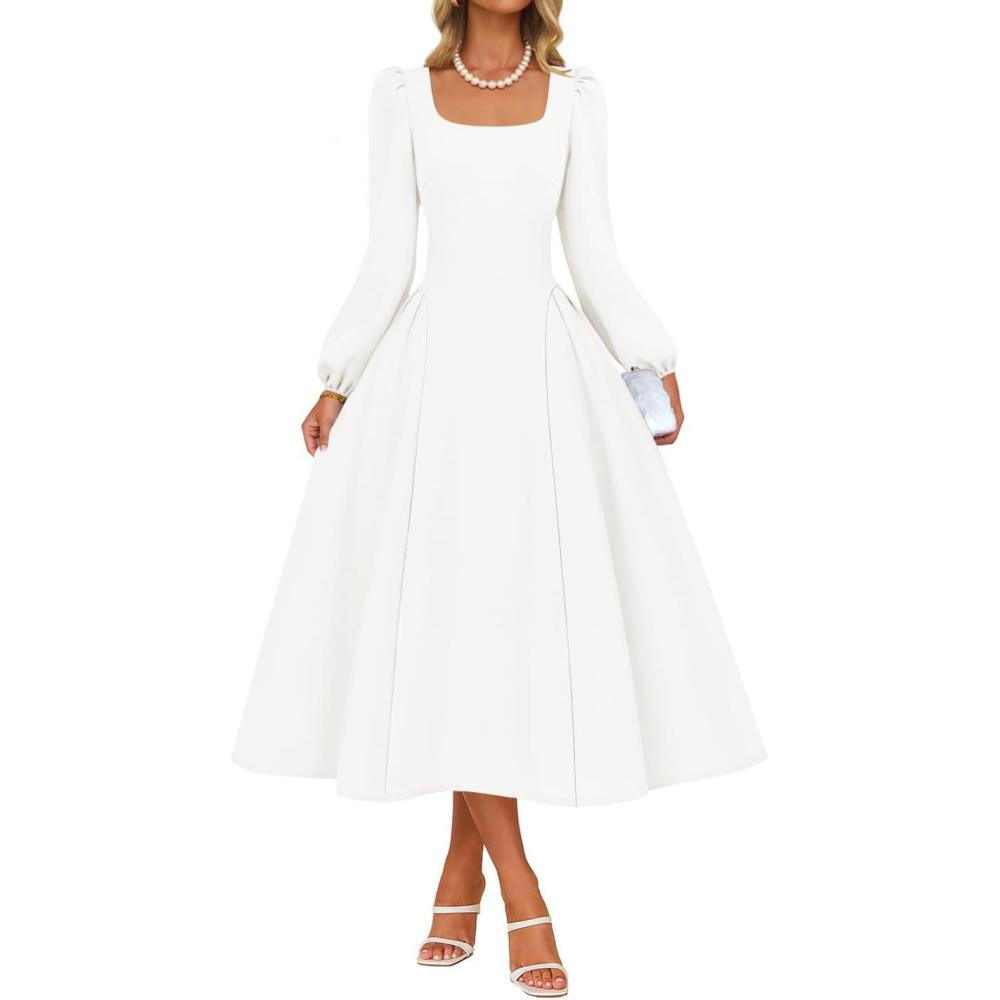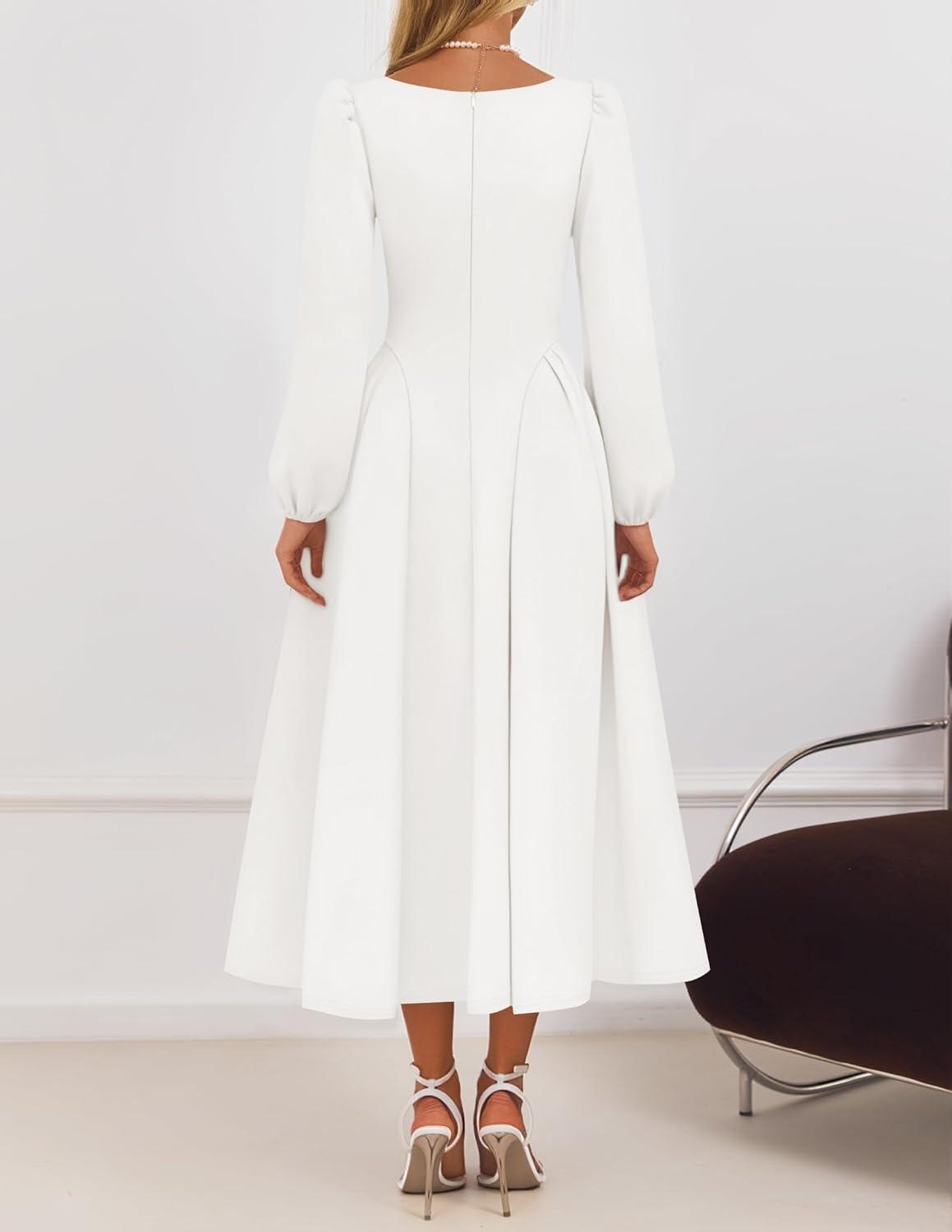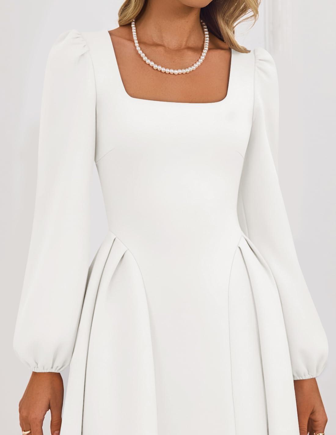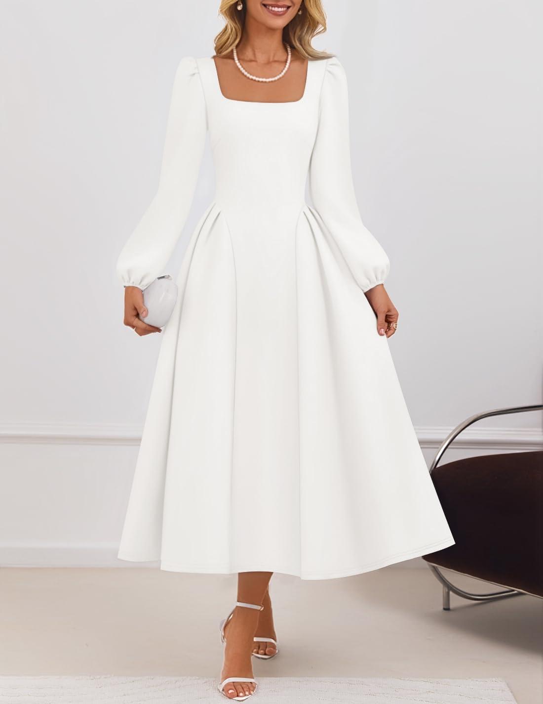 ZESICA Fall Cocktail Dresses for Women Wedding Guest 2025 Elegant Long Sleeve Square Neck Swing Evening Prom Midi Dress(White)