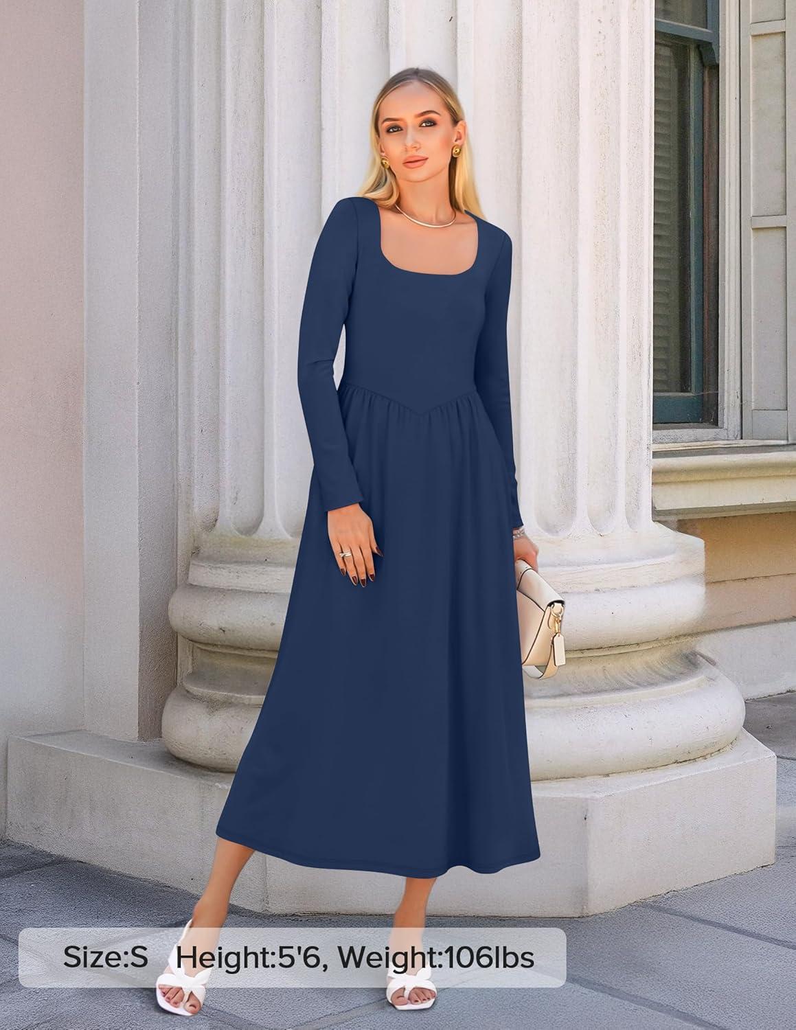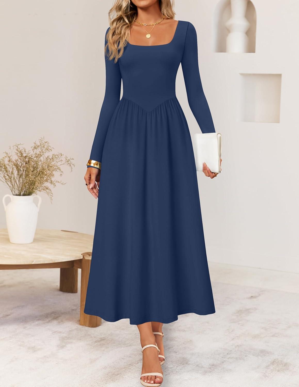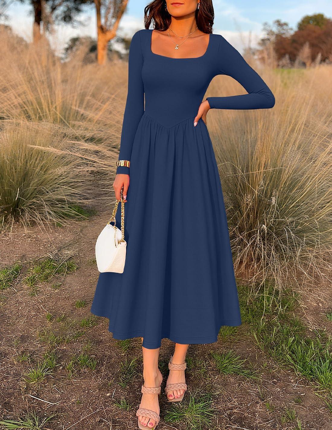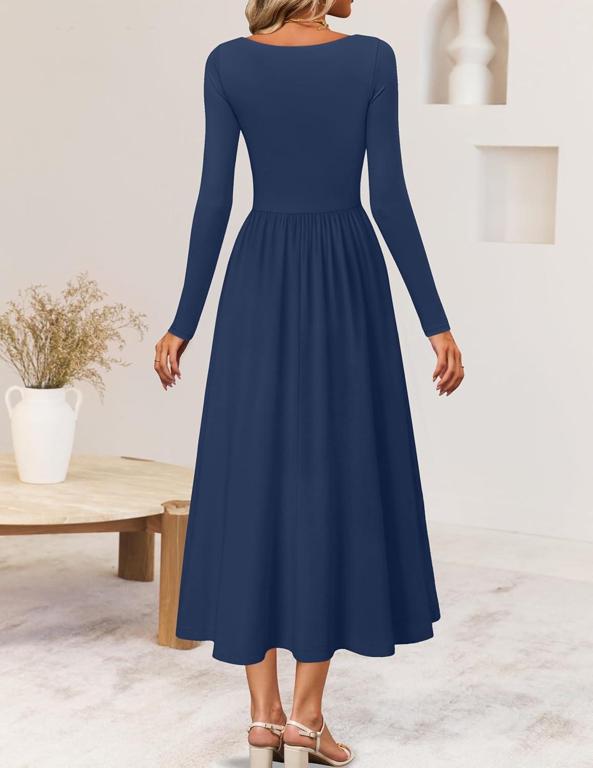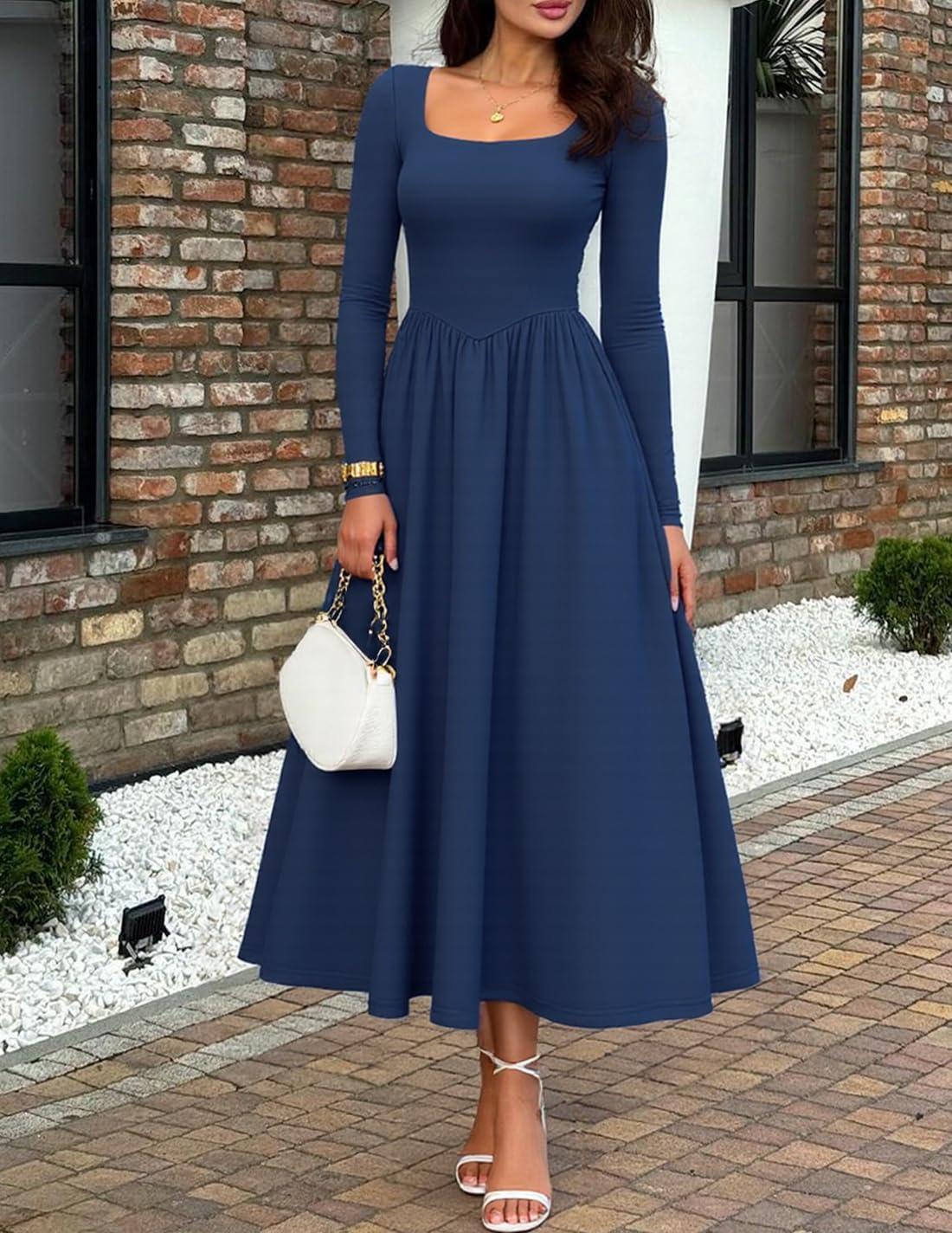 ZESICA Fall Dresses for Women 2025 Elegant Classy Square Neck Long Sleeve Flowy Wedding Guest Party Midi Dress(Navy)