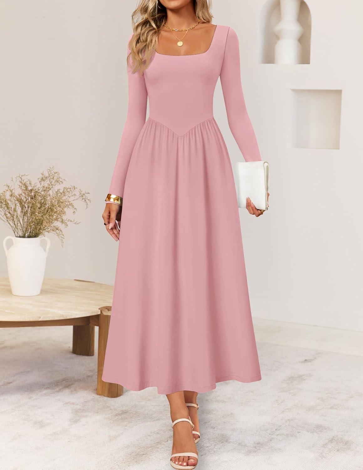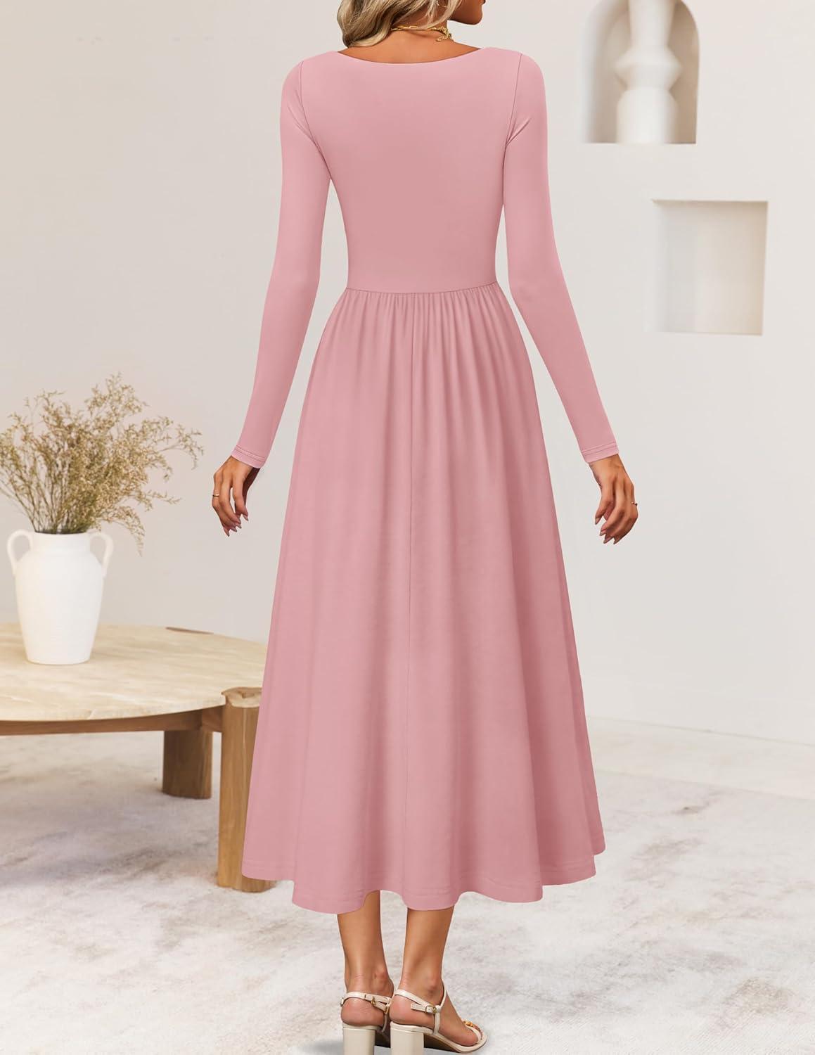 ZESICA Fall Dresses for Women 2025 Elegant Classy Square Neck Long Sleeve Flowy Wedding Guest Party Midi Dress(Pink)