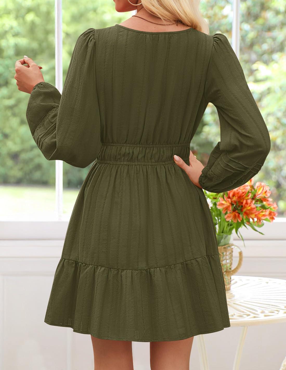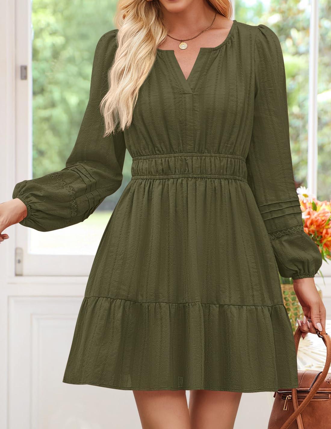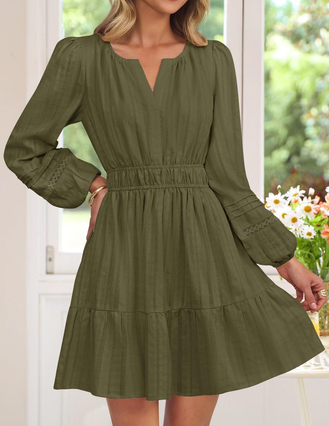 ZESICA Fall Long Sleeve Mini Dresses for Women 2025 Lightweight V Neck High Waist A Line Flowy Swing Casual Party Dress(Armygreen)