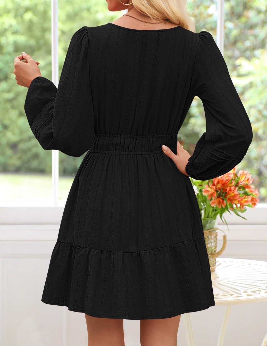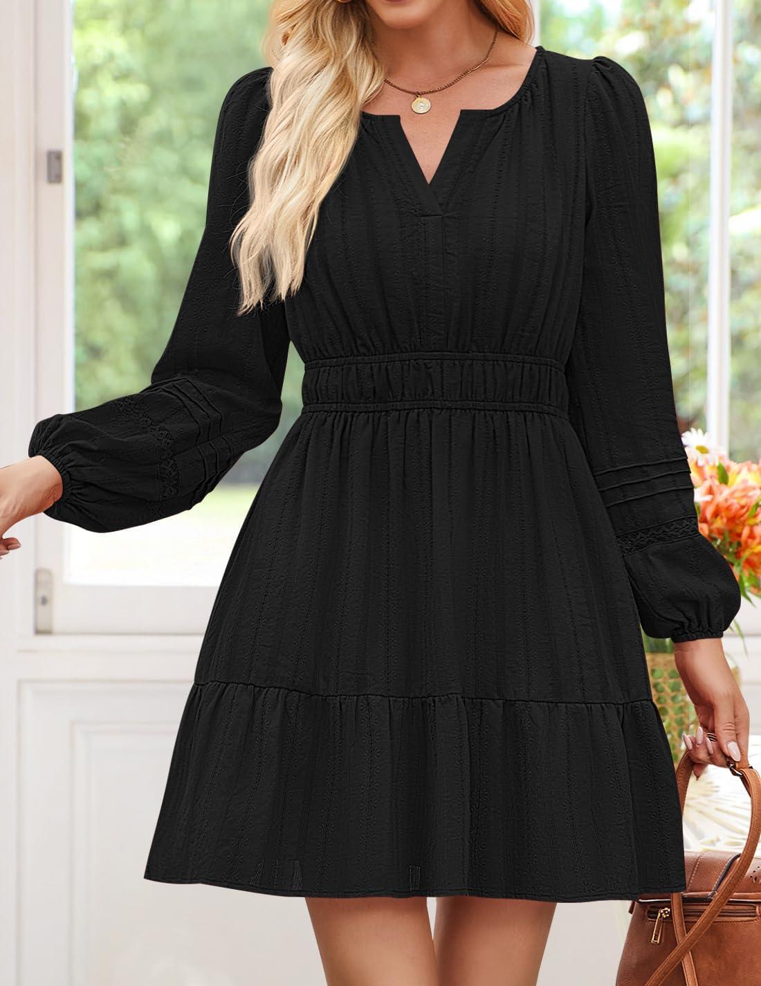 ZESICA Fall Long Sleeve Mini Dresses for Women 2025 Lightweight V Neck High Waist A Line Flowy Swing Casual Party Dress(Black)