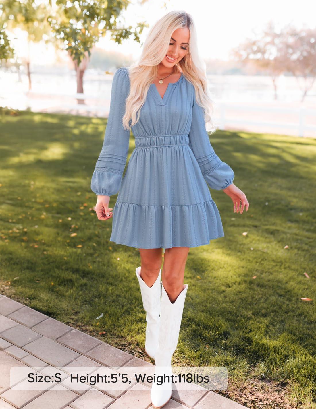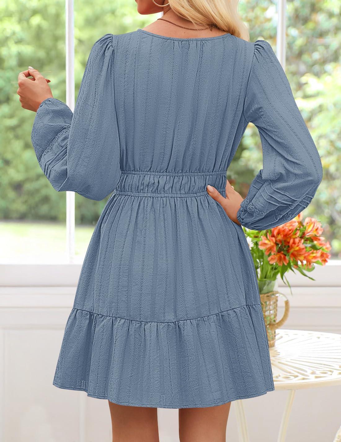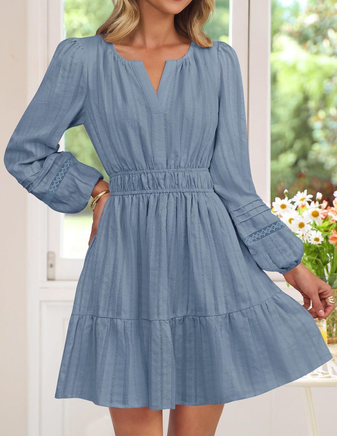 ZESICA Fall Long Sleeve Mini Dresses for Women 2025 Lightweight V Neck High Waist A Line Flowy Swing Casual Party Dress(Dustyblue)
