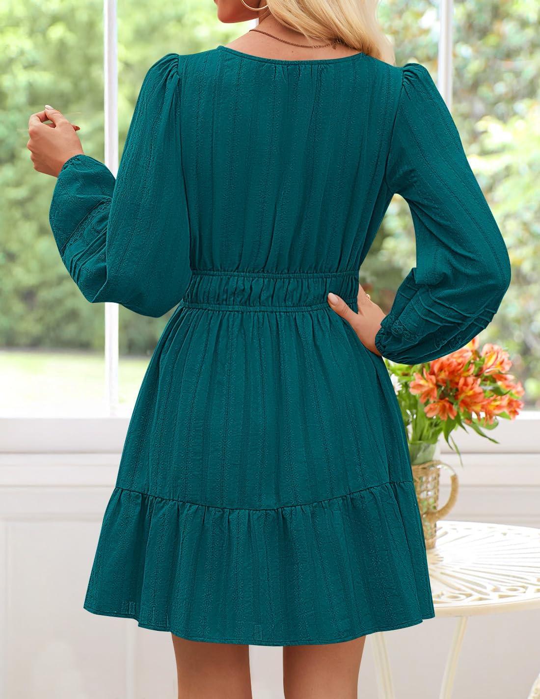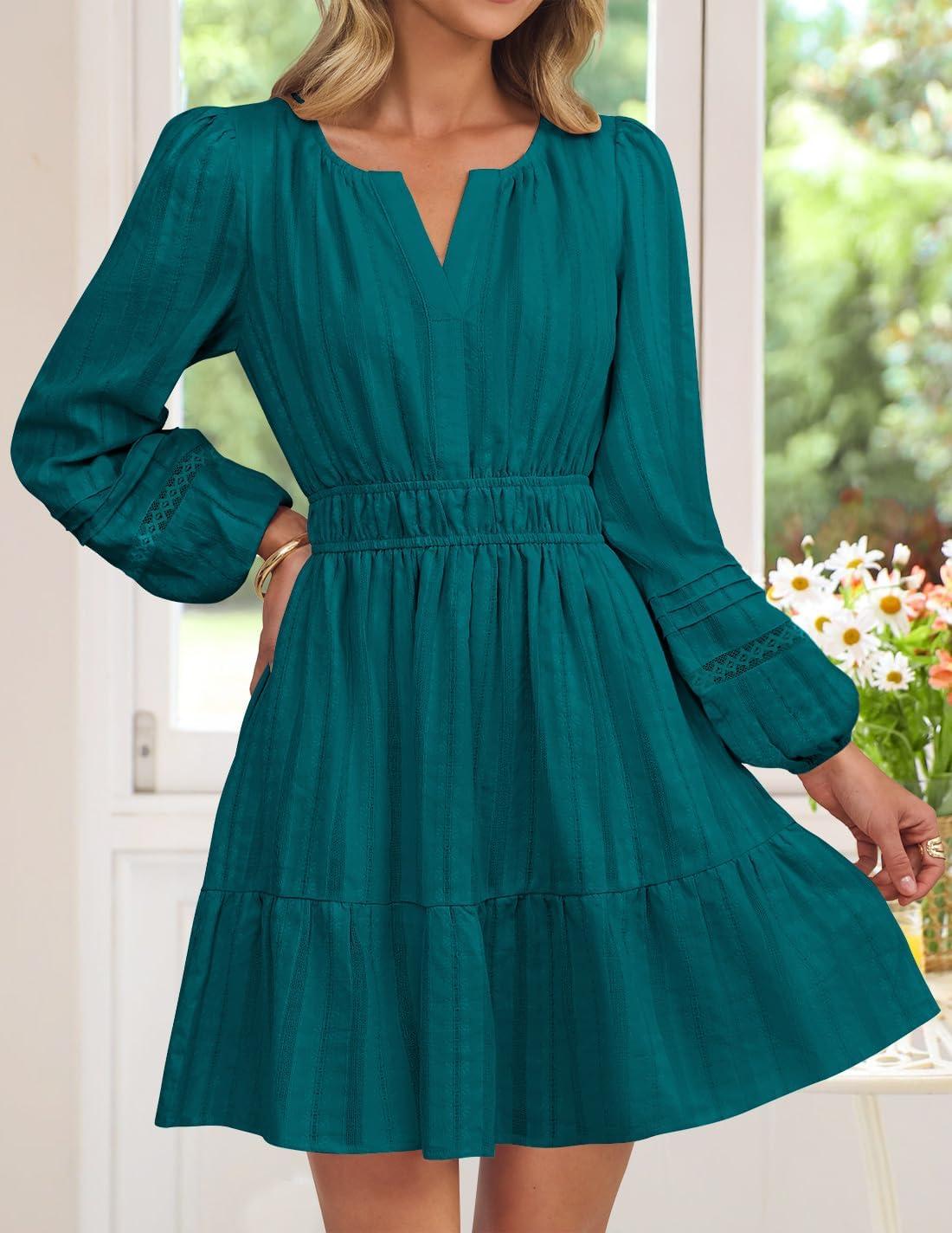 ZESICA Fall Long Sleeve Mini Dresses for Women 2025 Lightweight V Neck High Waist A Line Flowy Swing Casual Party Dress(Teal)