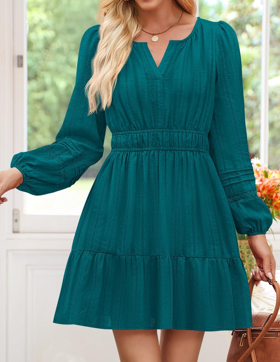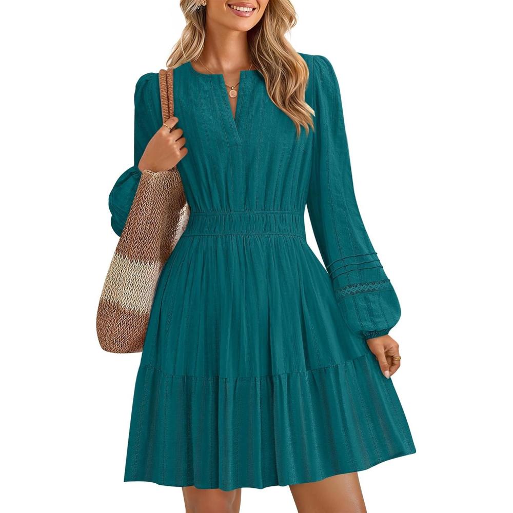imageZESICA Fall Long Sleeve Mini Dresses for Women 2025 Lightweight V Neck High Waist A Line Flowy Swing Casual Party DressTeal