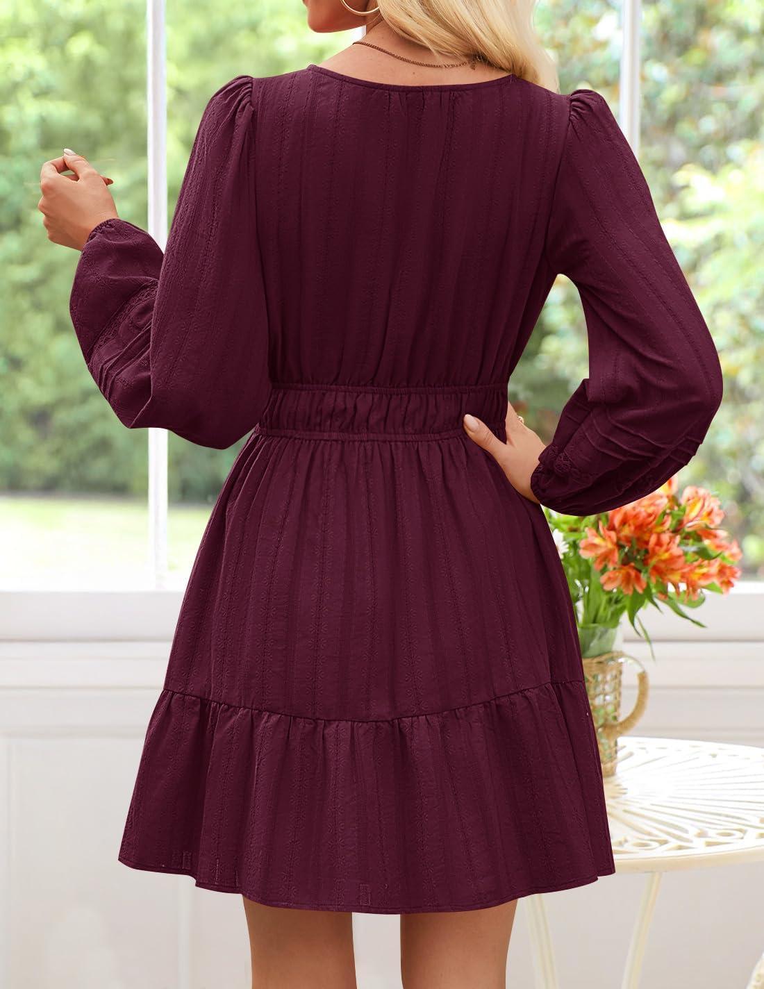 ZESICA Fall Long Sleeve Mini Dresses for Women 2025 Lightweight V Neck High Waist A Line Flowy Swing Casual Party Dress(Wine)