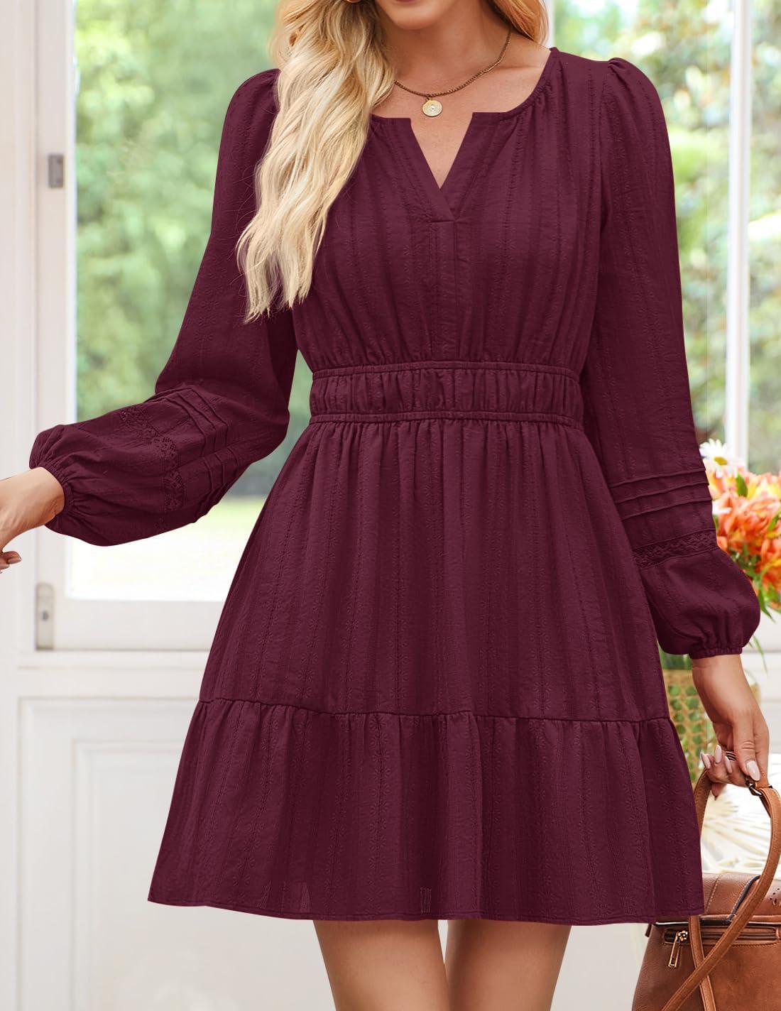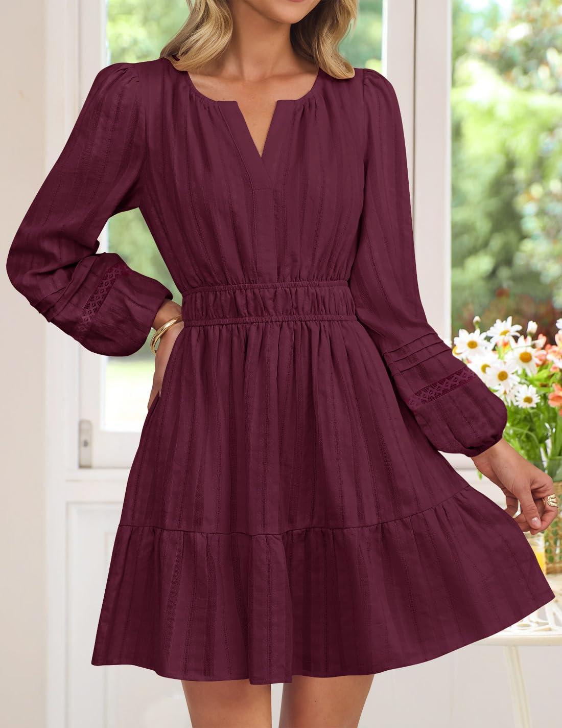 imageZESICA Fall Long Sleeve Mini Dresses for Women 2025 Lightweight V Neck High Waist A Line Flowy Swing Casual Party DressWine