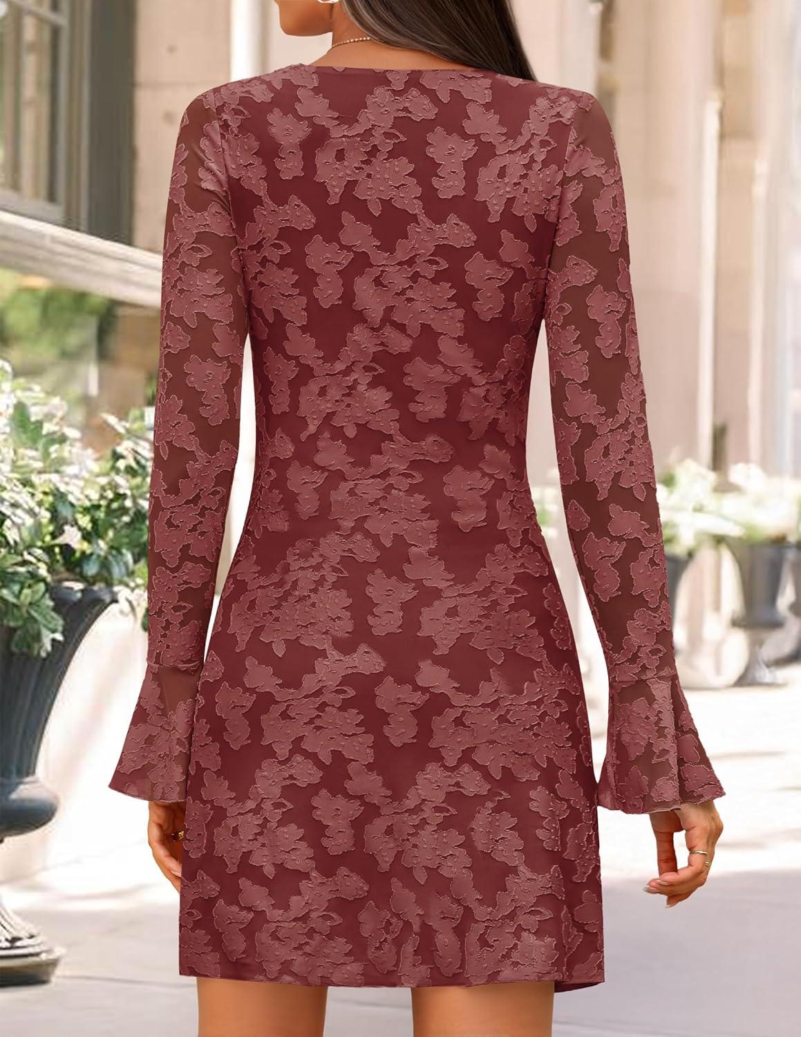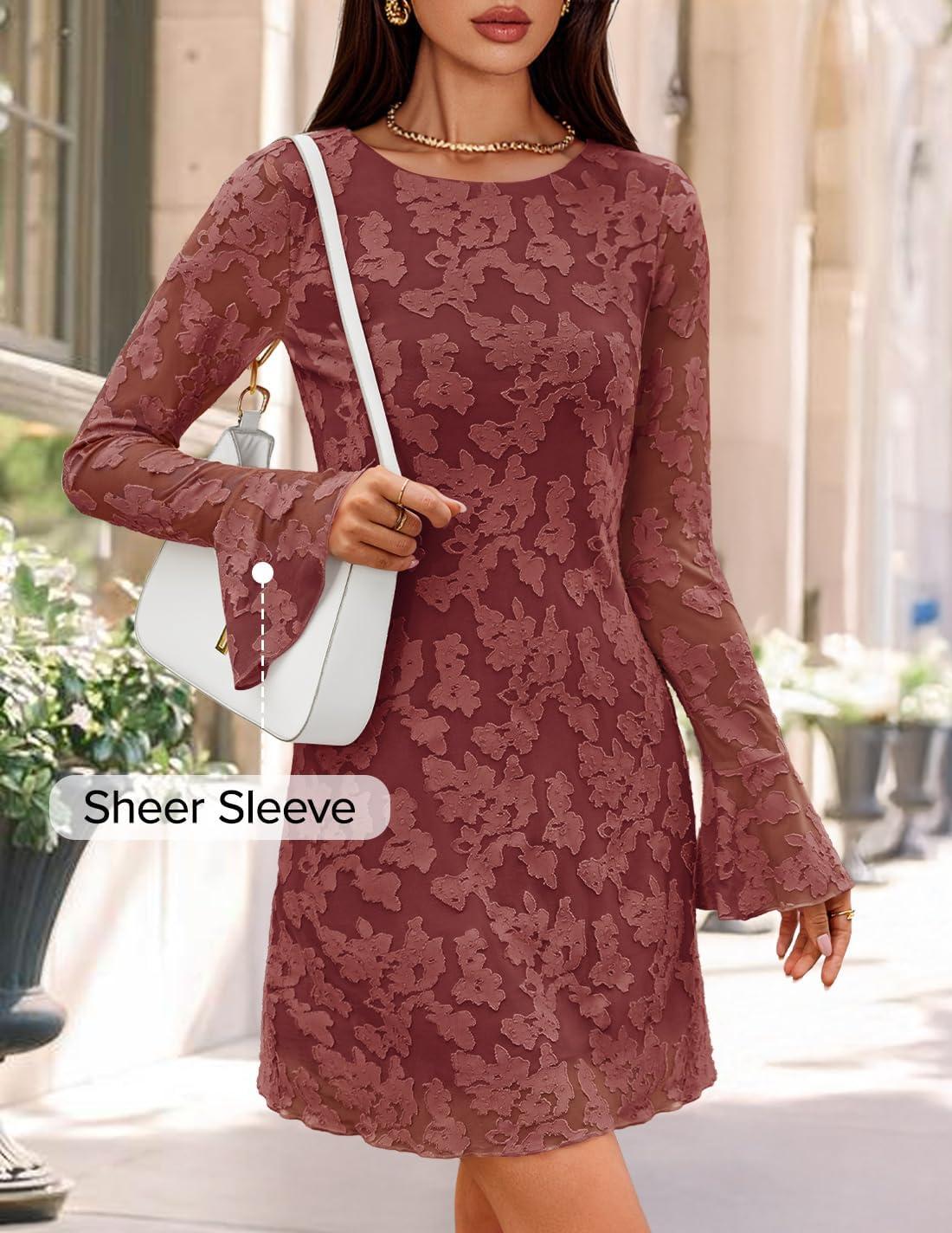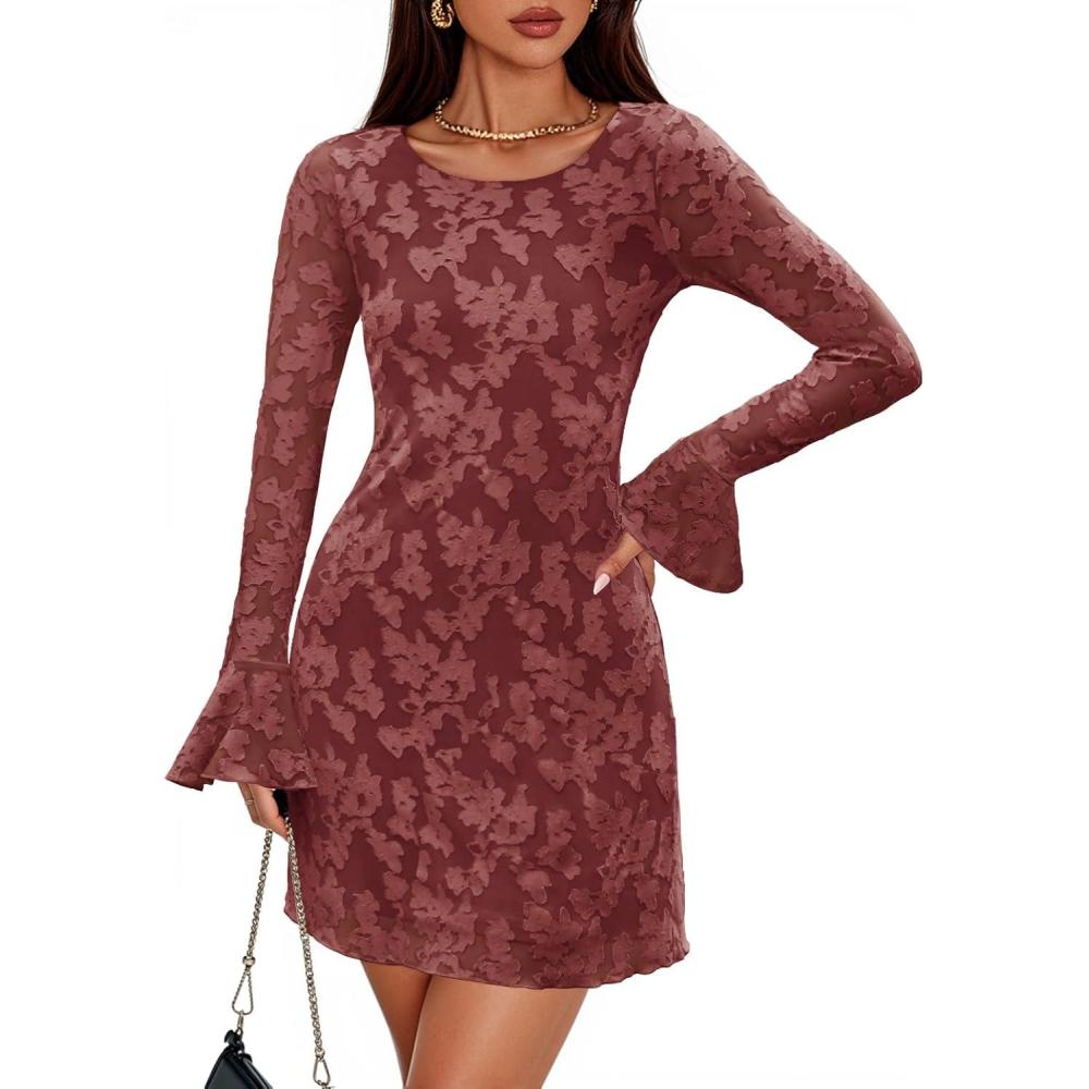 ZESICA Fall Mini Dresses for Women 2025 Long Sleeve Floral Mesh Crewneck Bodycon Cocktail Party Club Short Dress(Brick Red)