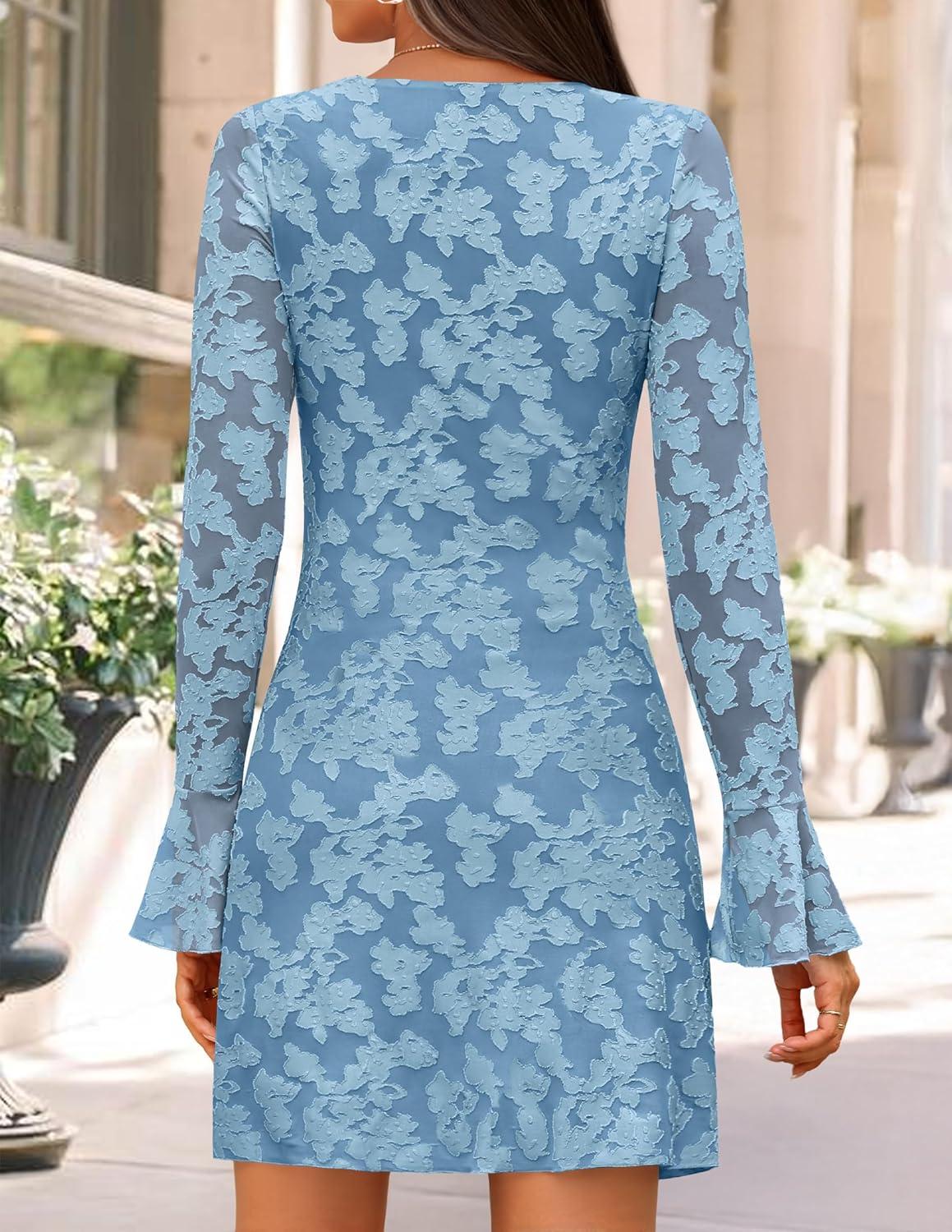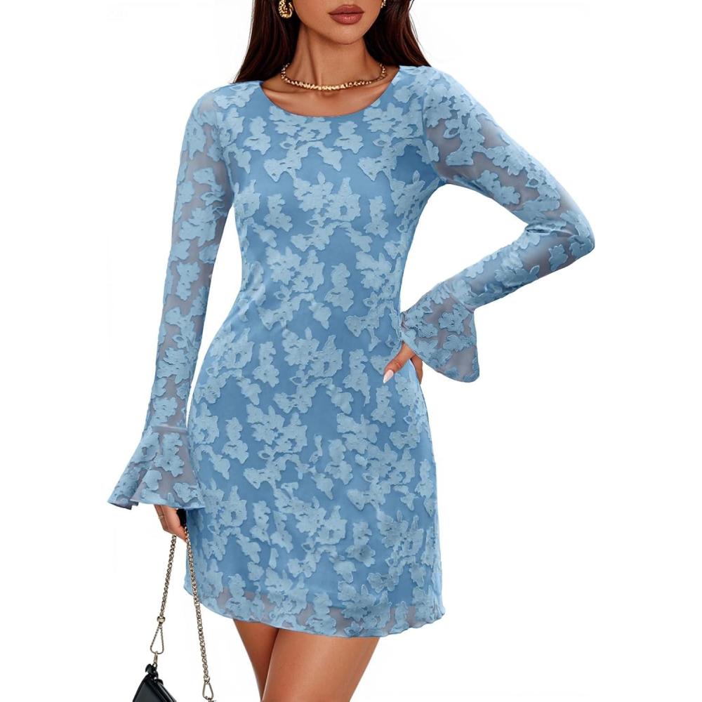 ZESICA Fall Mini Dresses for Women 2025 Long Sleeve Floral Mesh Crewneck Bodycon Cocktail Party Club Short Dress(Dusty Blue)