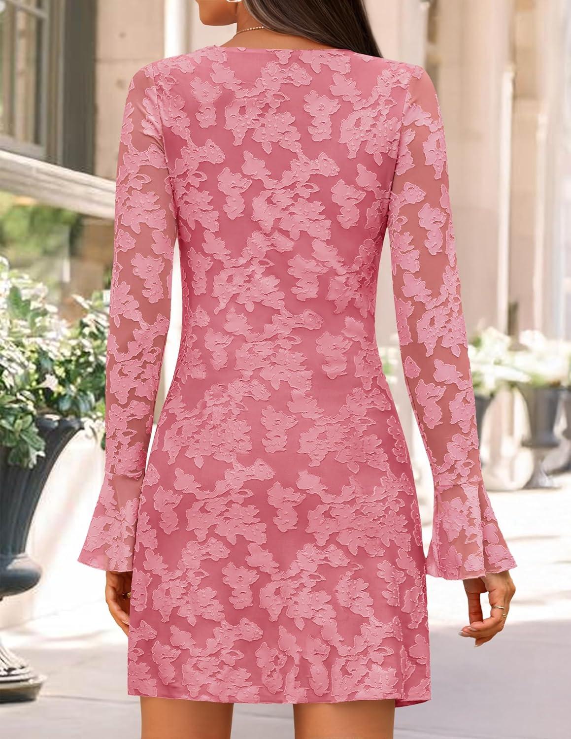ZESICA Fall Mini Dresses for Women 2025 Long Sleeve Floral Mesh Crewneck Bodycon Cocktail Party Club Short Dress(Pink)