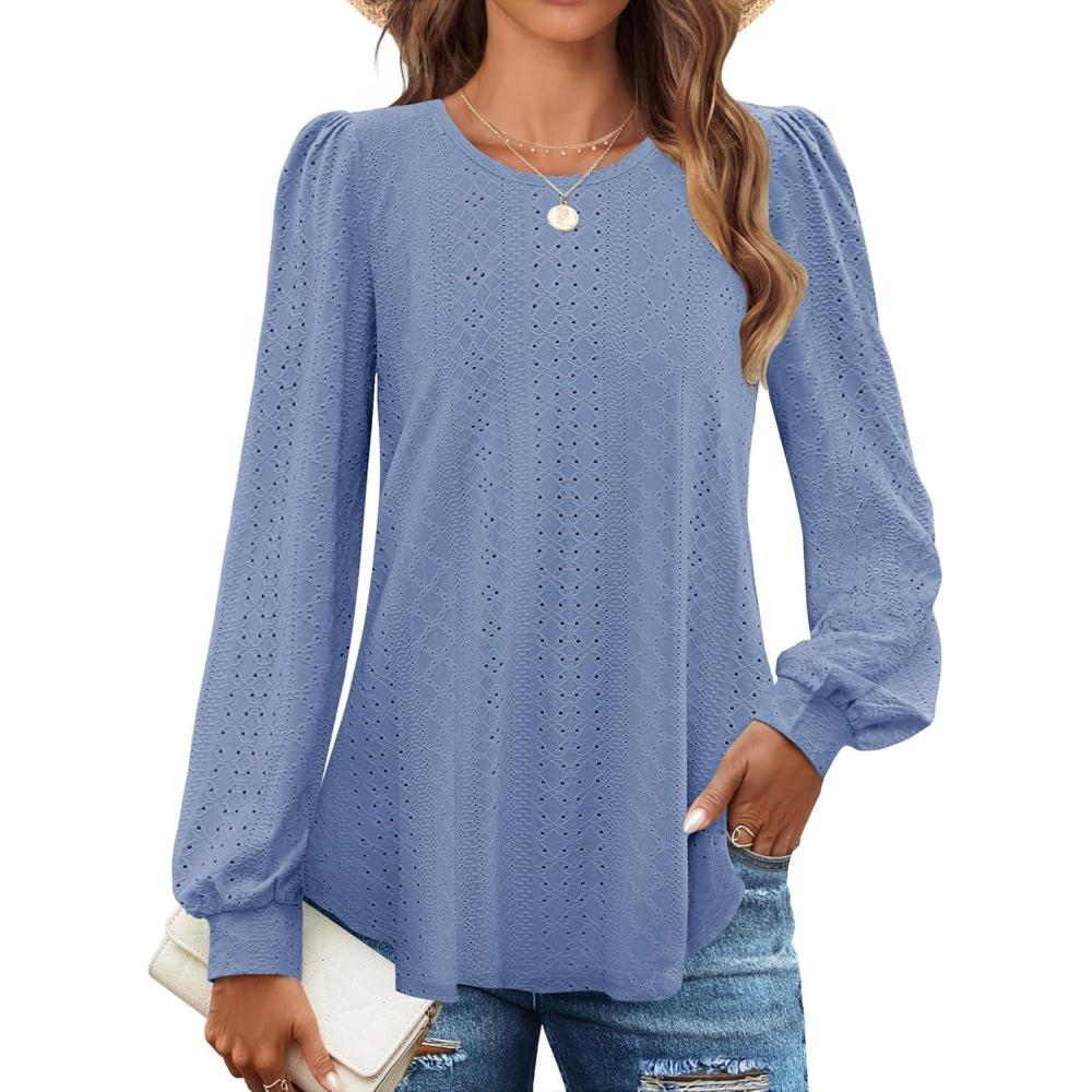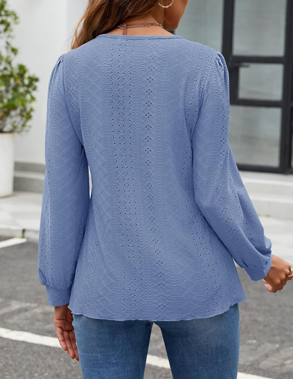 ZESICA Long Sleeve Eyelet Tops for Womens Crew Neck Fall Shirts Casual Loose Blouses 2024 Trendy Clothes(Blue)