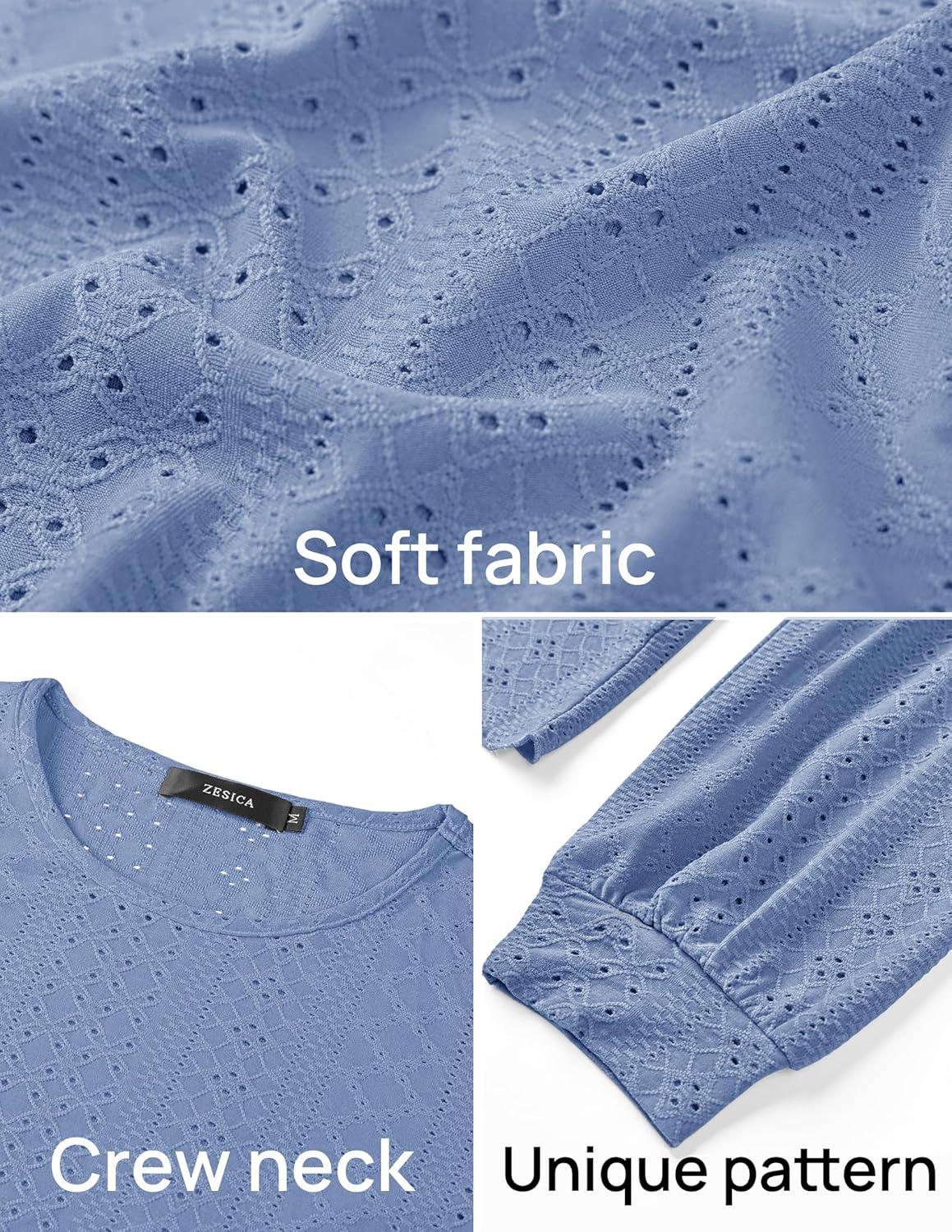 imageZESICA Long Sleeve Eyelet Tops for Womens Crew Neck Fall Shirts Casual Loose Blouses 2024 Trendy ClothesBlue