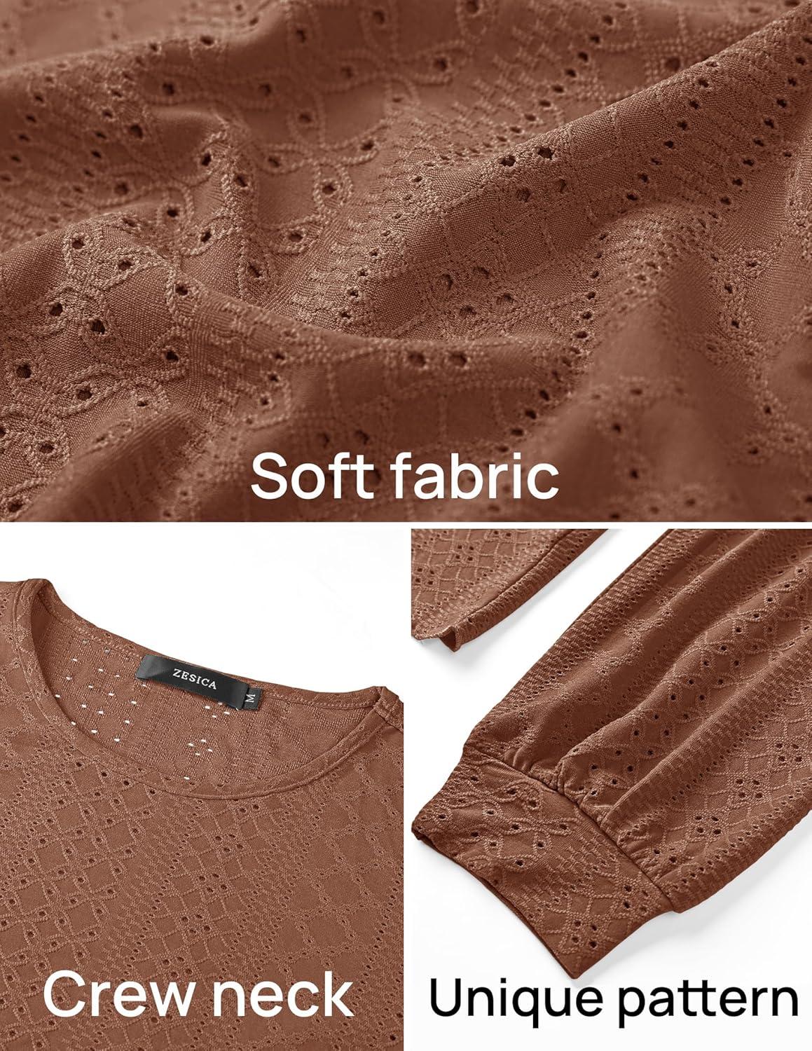 imageZESICA Long Sleeve Eyelet Tops for Womens Crew Neck Fall Shirts Casual Loose Blouses 2024 Trendy ClothesCaramel
