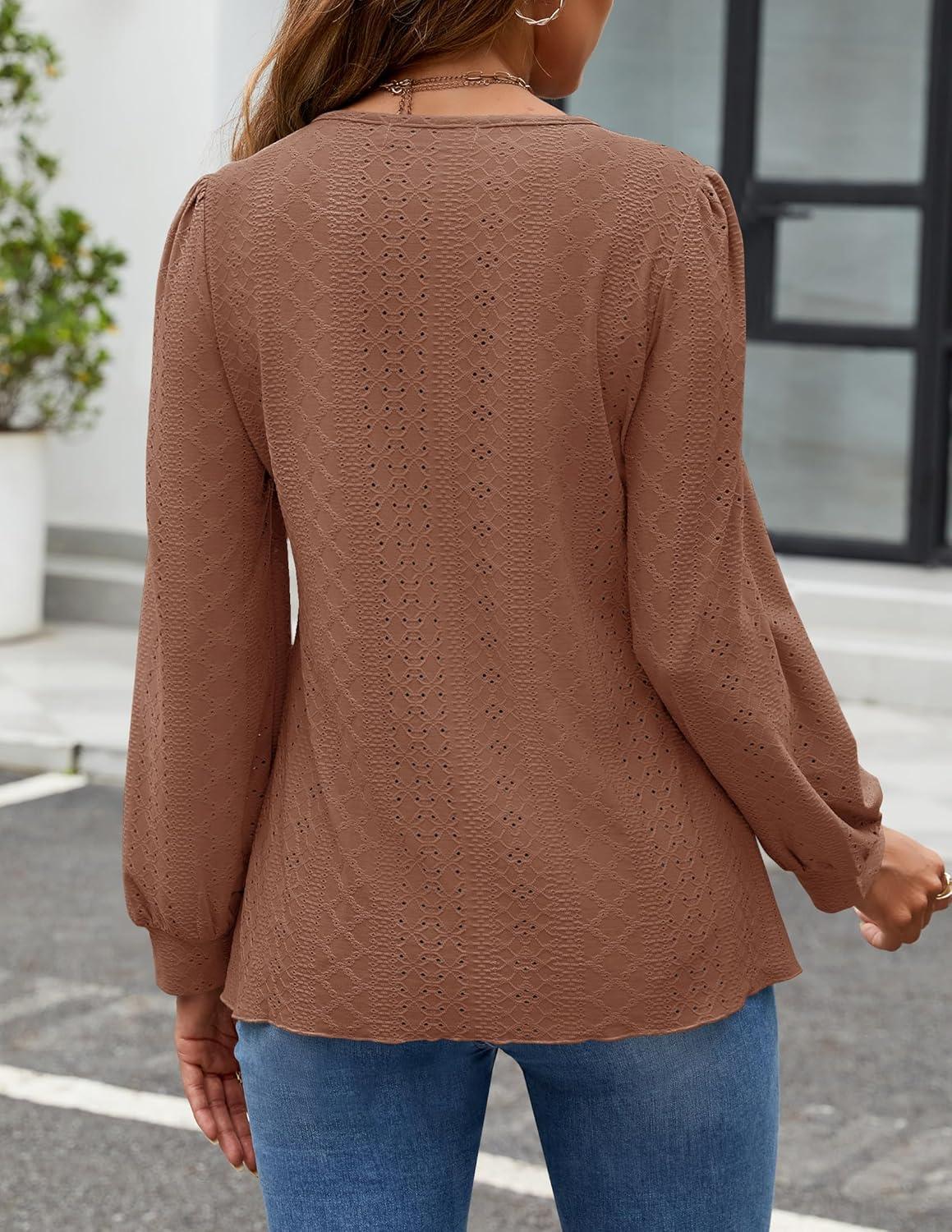 ZESICA Long Sleeve Eyelet Tops for Womens Crew Neck Fall Shirts Casual Loose Blouses 2024 Trendy Clothes(Caramel)