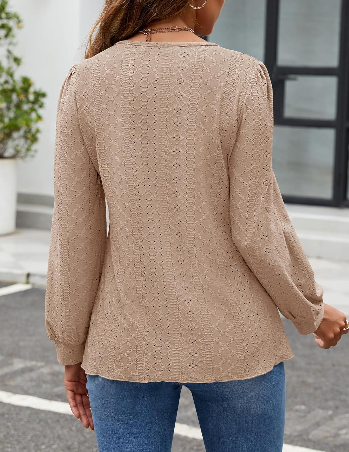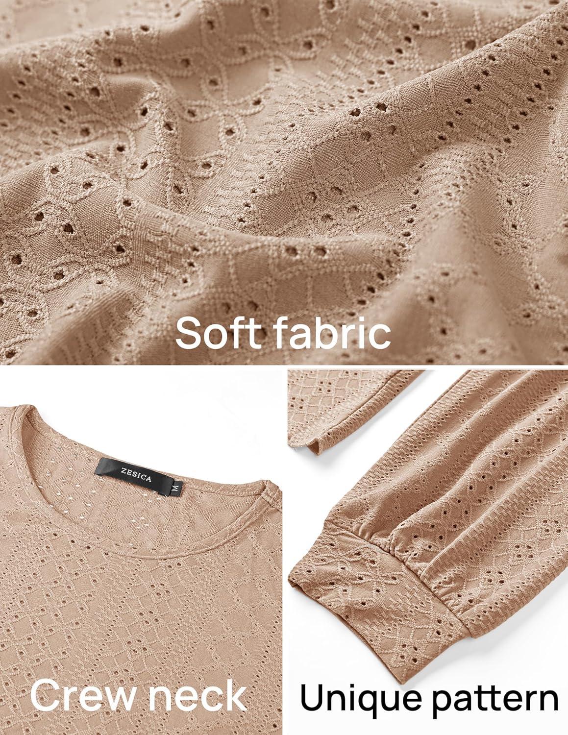 ZESICA Long Sleeve Eyelet Tops for Womens Crew Neck Fall Shirts Casual Loose Blouses 2024 Trendy Clothes(Khaki)
