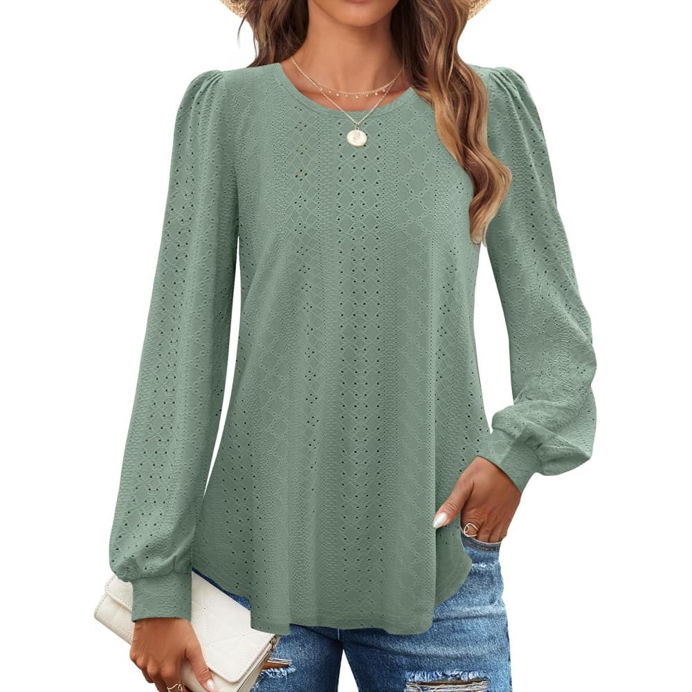 ZESICA Long Sleeve Eyelet Tops for Womens Crew Neck Fall Shirts Casual Loose Blouses 2024 Trendy Clothes(Sage)