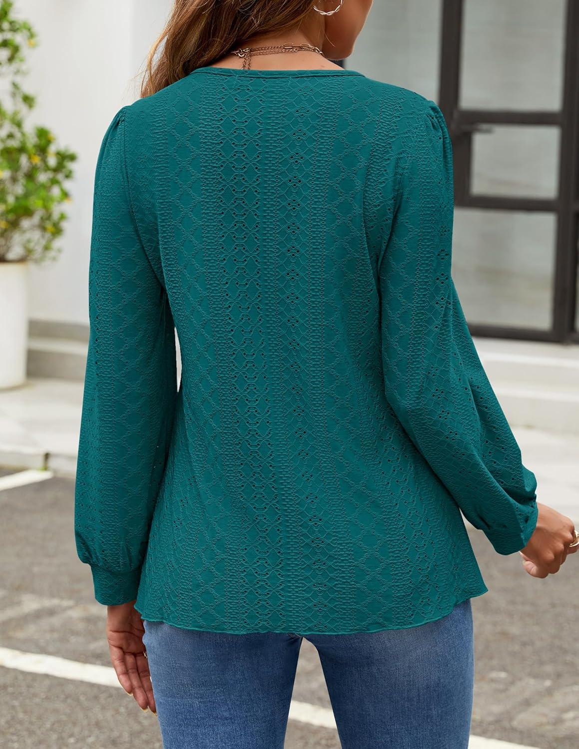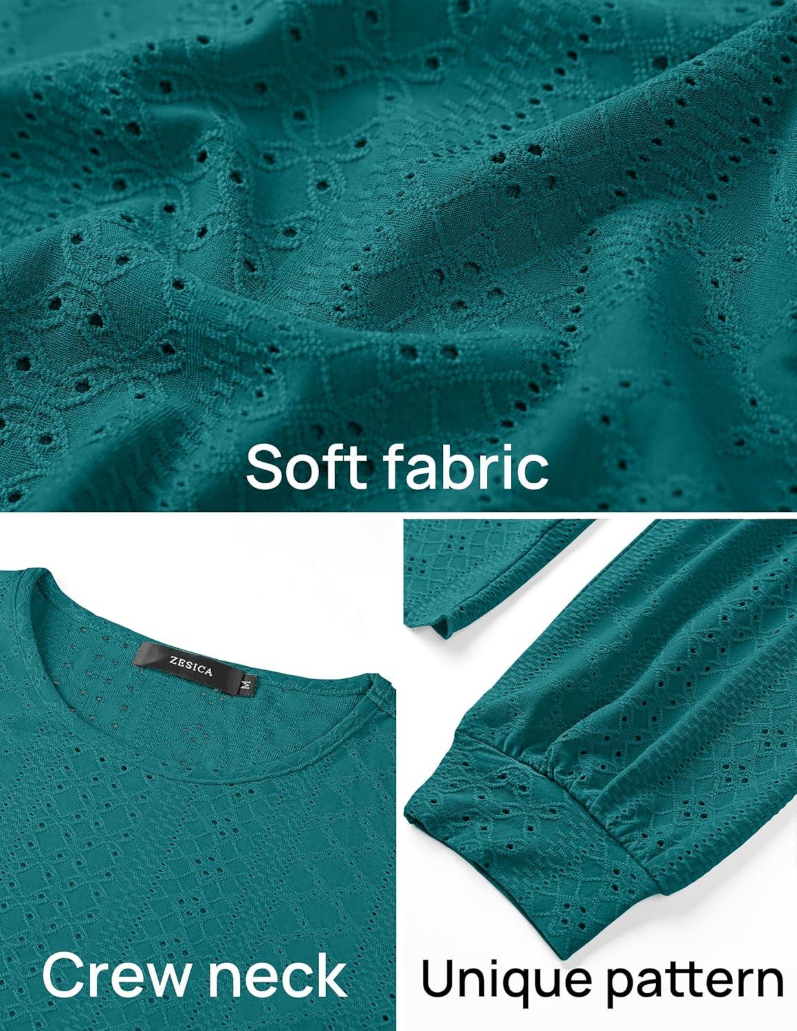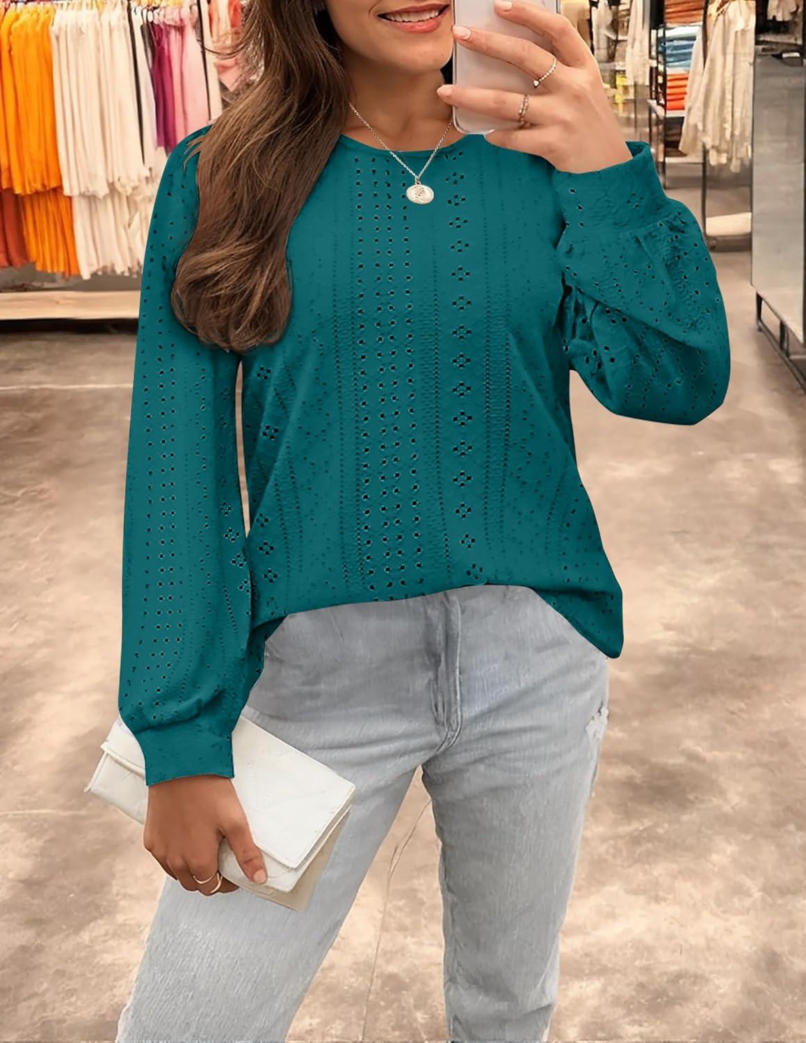 ZESICA Long Sleeve Eyelet Tops for Womens Crew Neck Fall Shirts Casual Loose Blouses 2024 Trendy Clothes(Tealgreen)