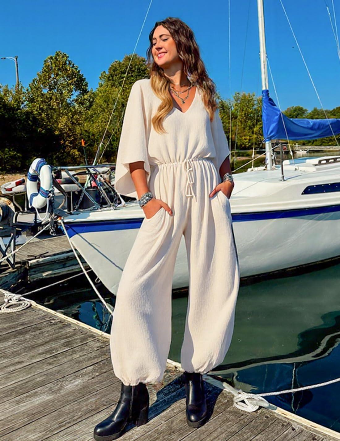 ZESICA One Piece Jumpsuits for Women Summer Casual Short Sleeve V Neck Overalls Drawstring Waist Romper with Pockets(Apricot)