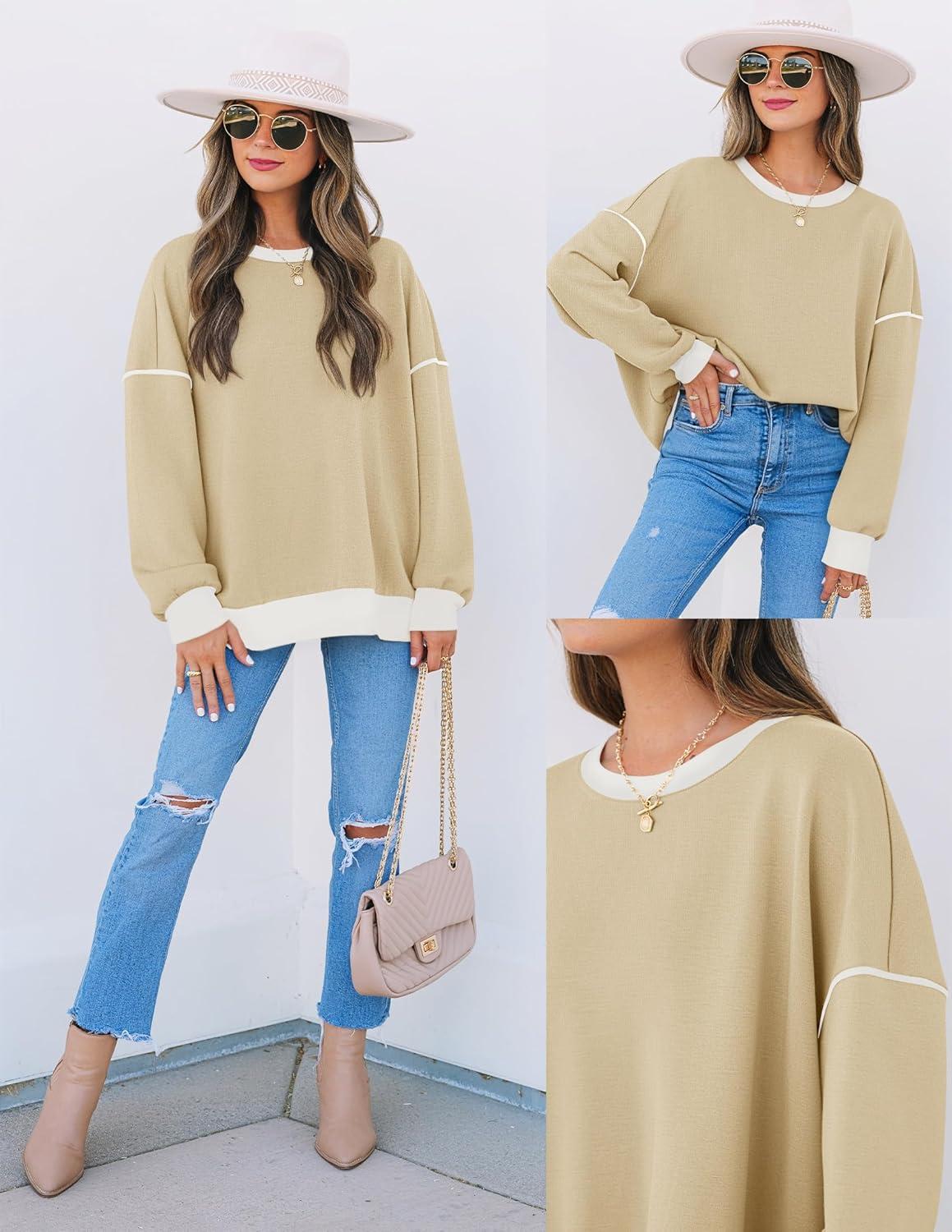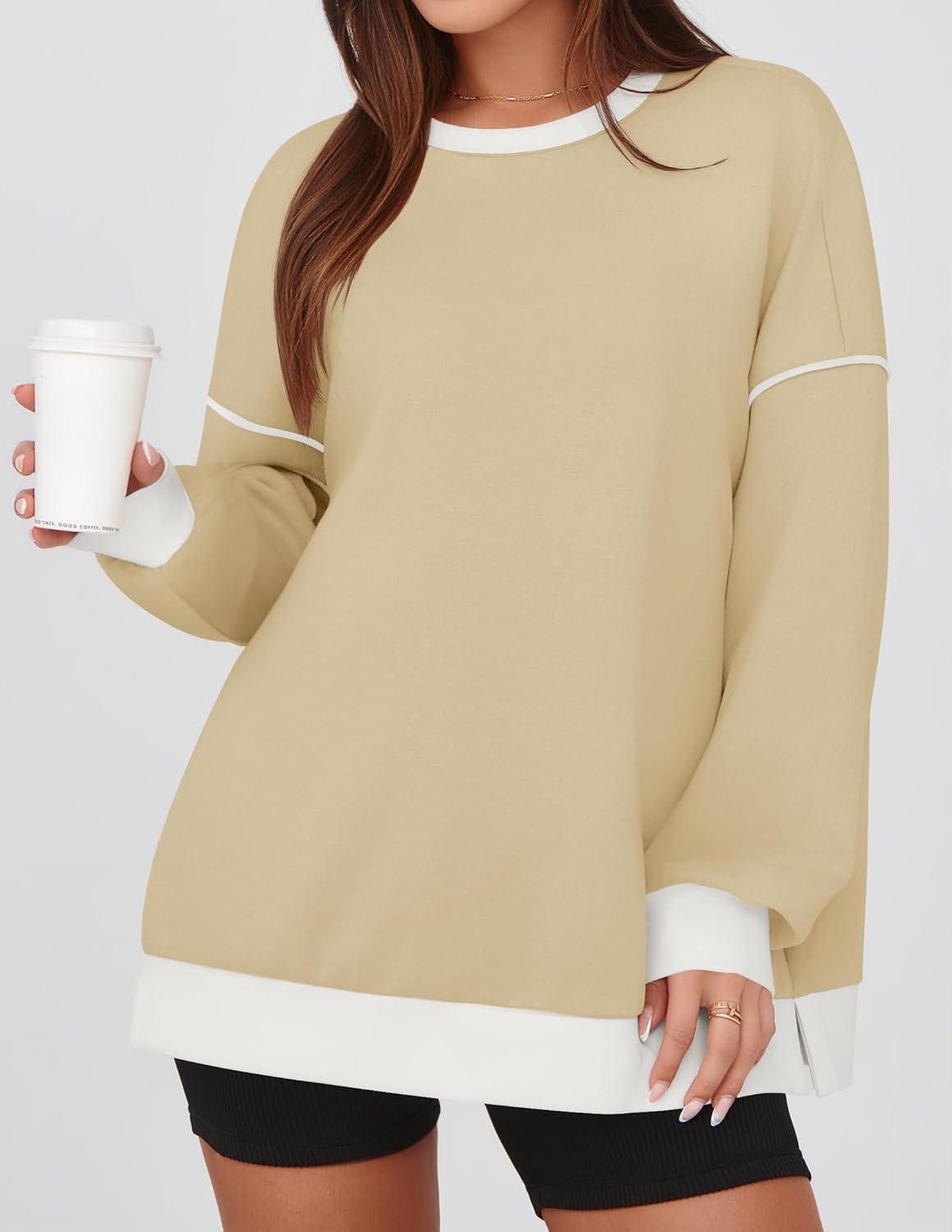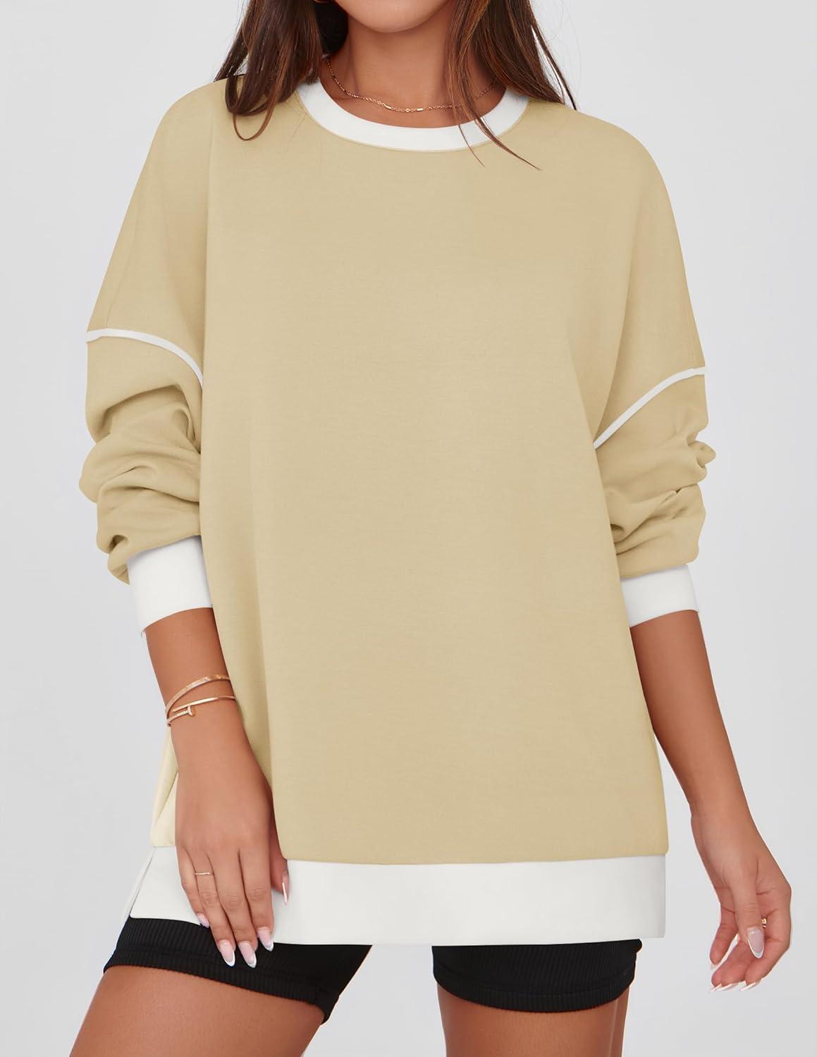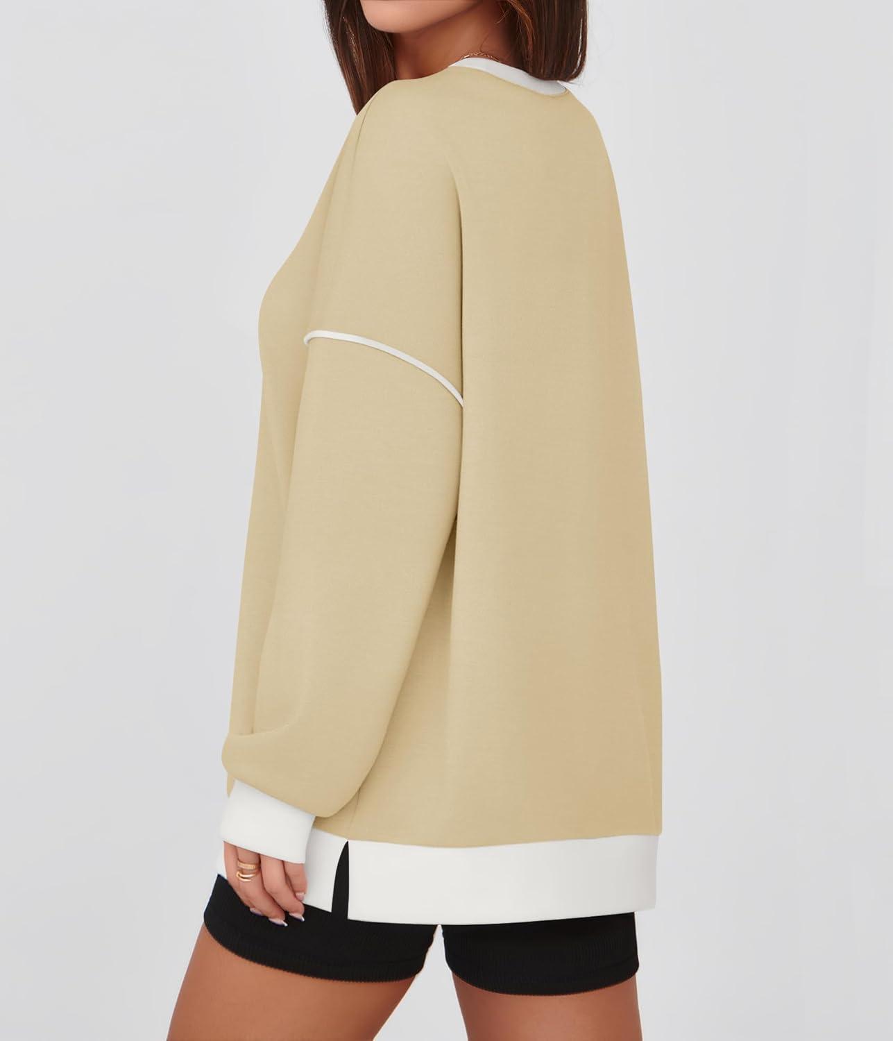 ZESICA Sweatshirts for Women Casual Long Sleeve Crewneck Contrast Color Oversized Pullover Tops Trendy Clothes(Light Khaki)