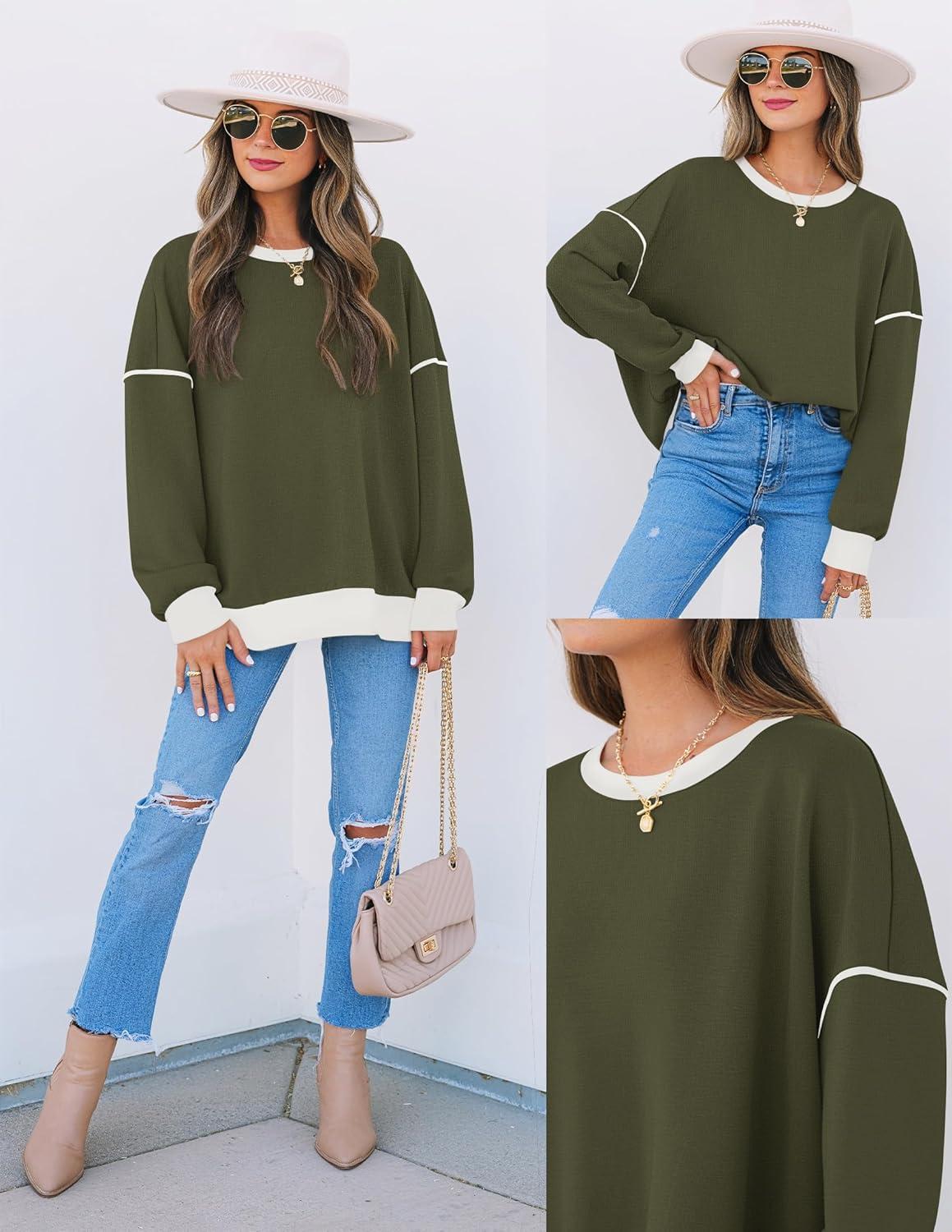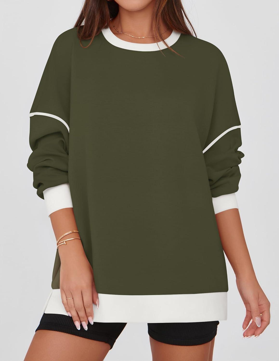 ZESICA Sweatshirts for Women Casual Long Sleeve Crewneck Contrast Color Oversized Pullover Tops Trendy Clothes(Army Green)