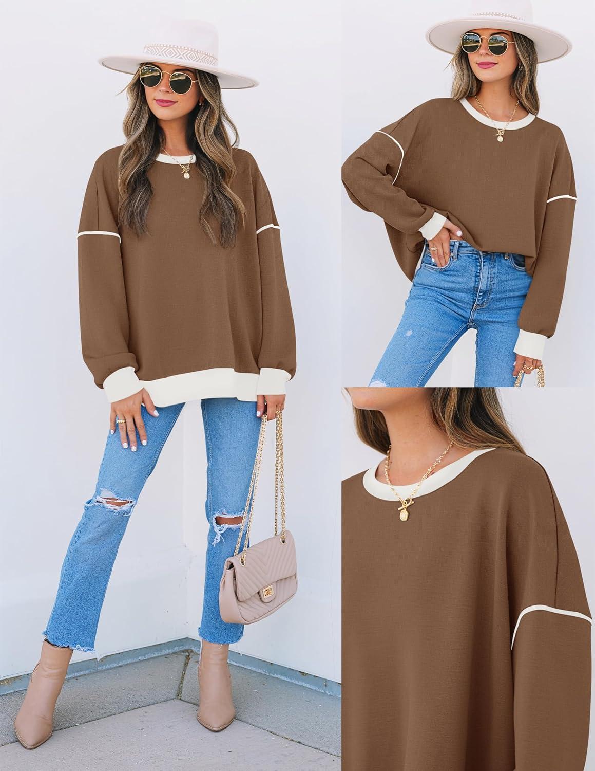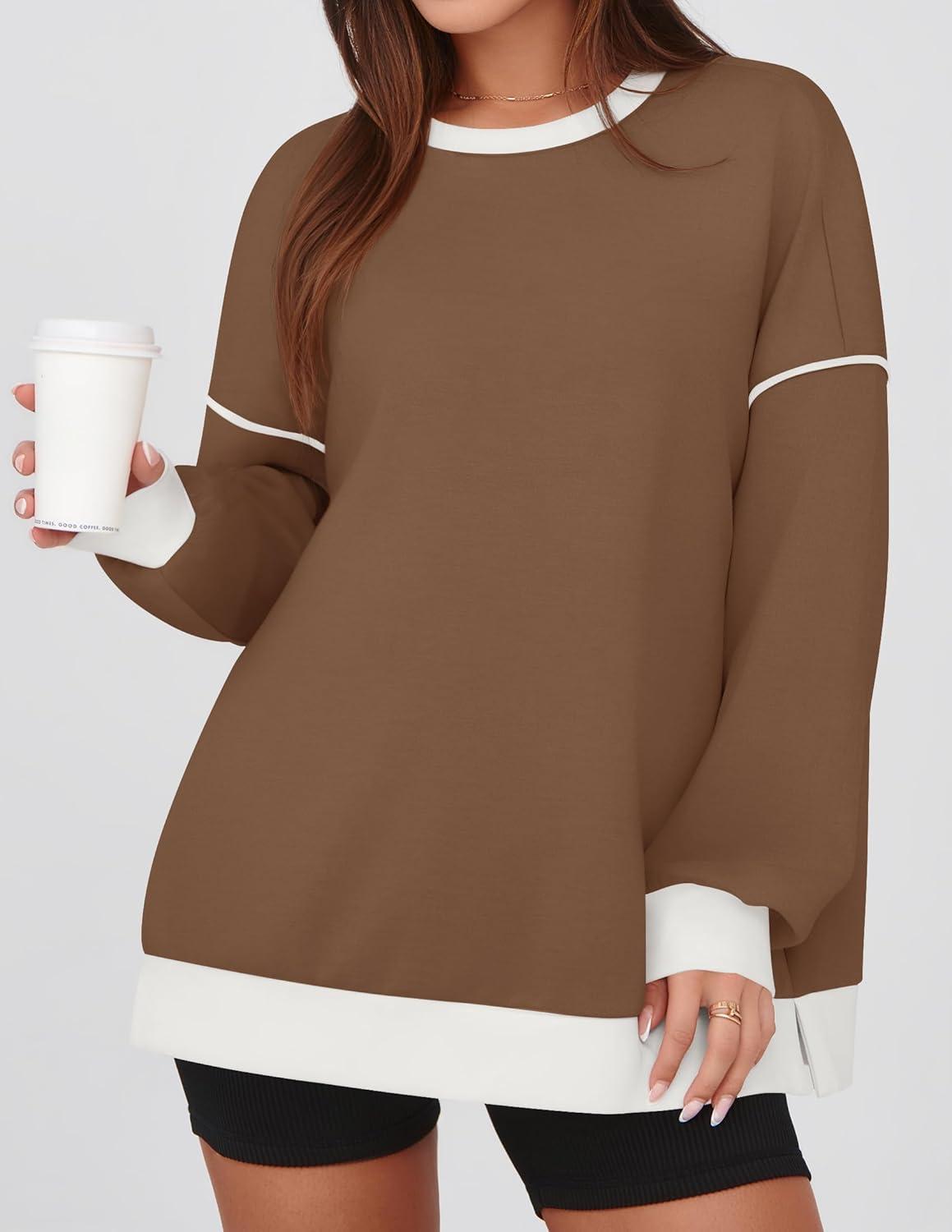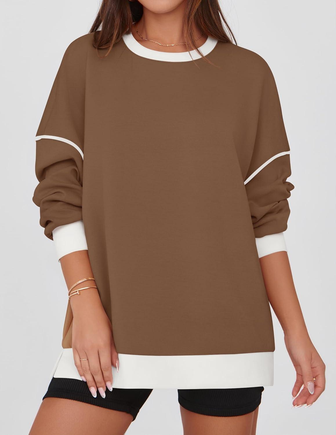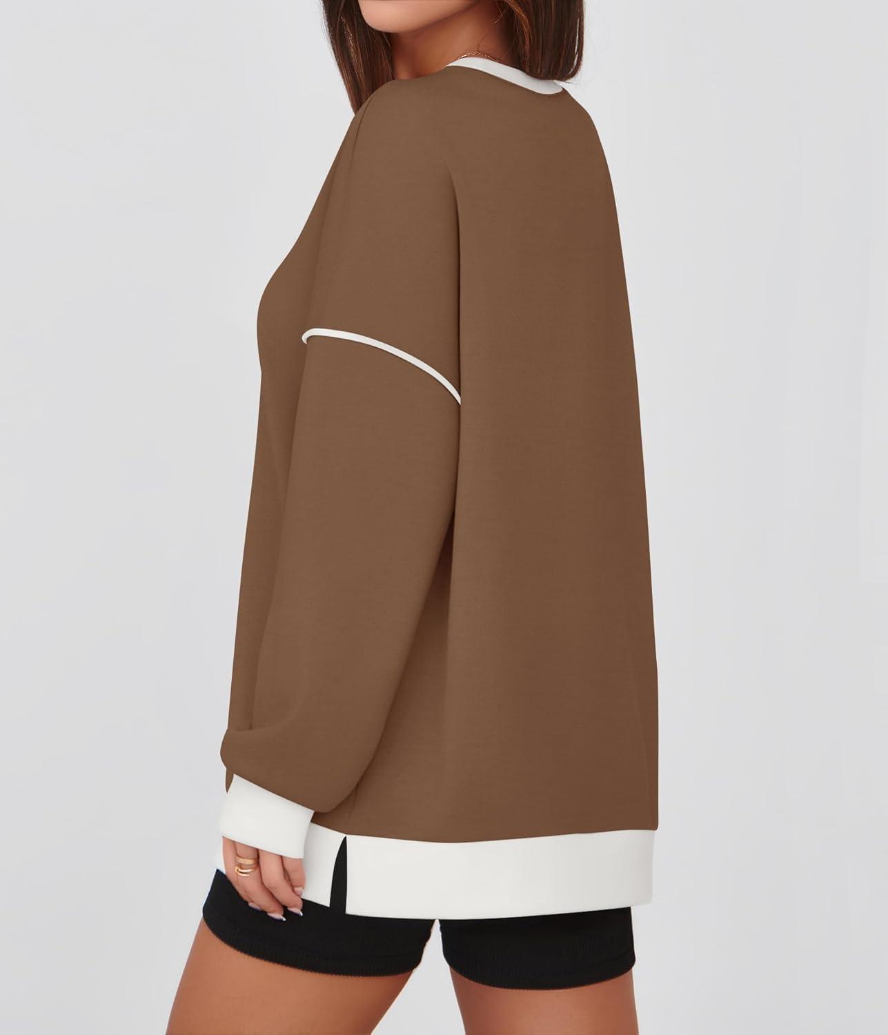 ZESICA Sweatshirts for Women Casual Long Sleeve Crewneck Contrast Color Oversized Pullover Tops Trendy Clothes(Brown)