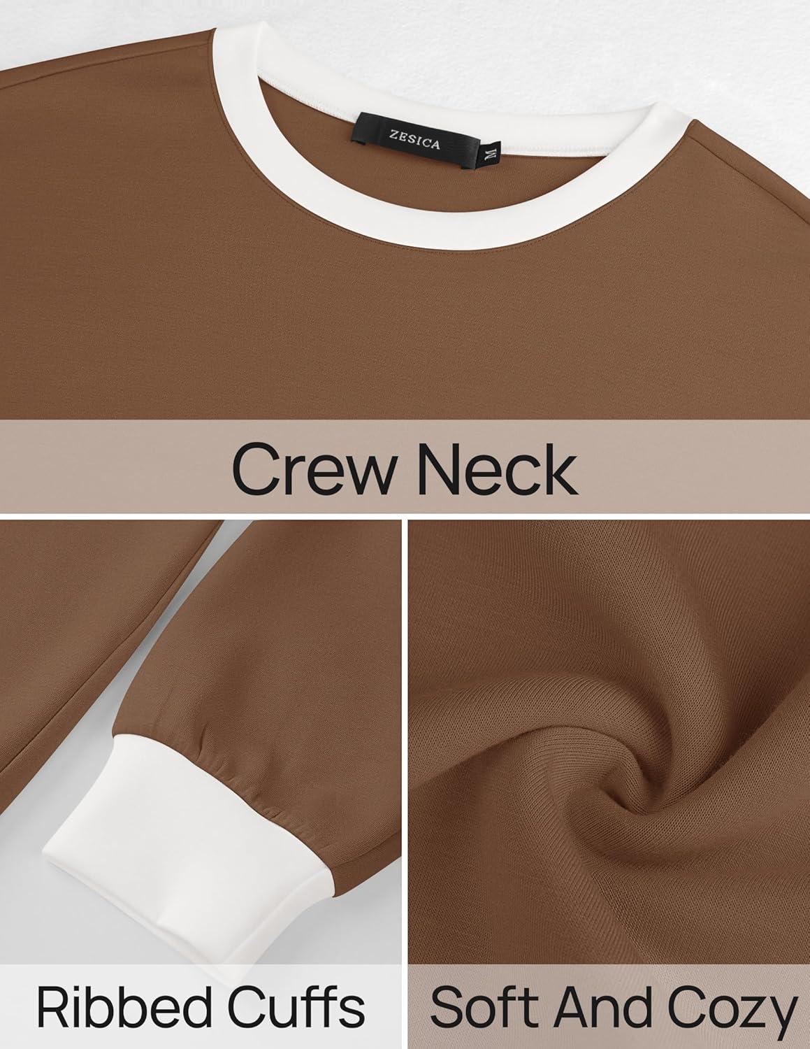 imageZESICA Sweatshirts for Women Casual Long Sleeve Crewneck Contrast Color Oversized Pullover Tops Trendy ClothesBrown