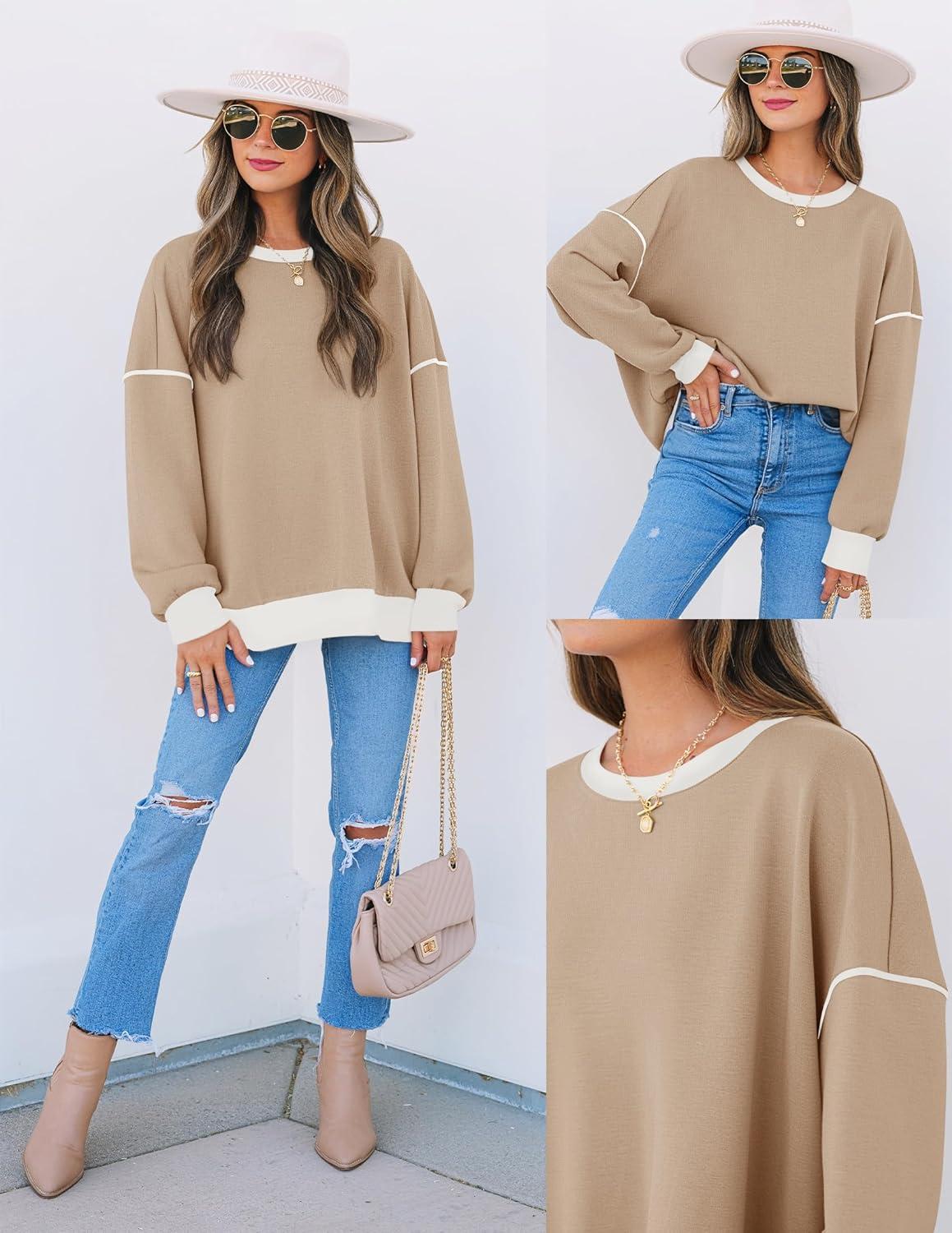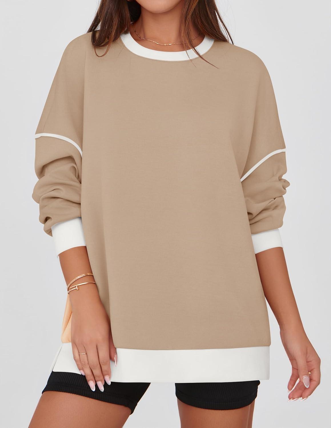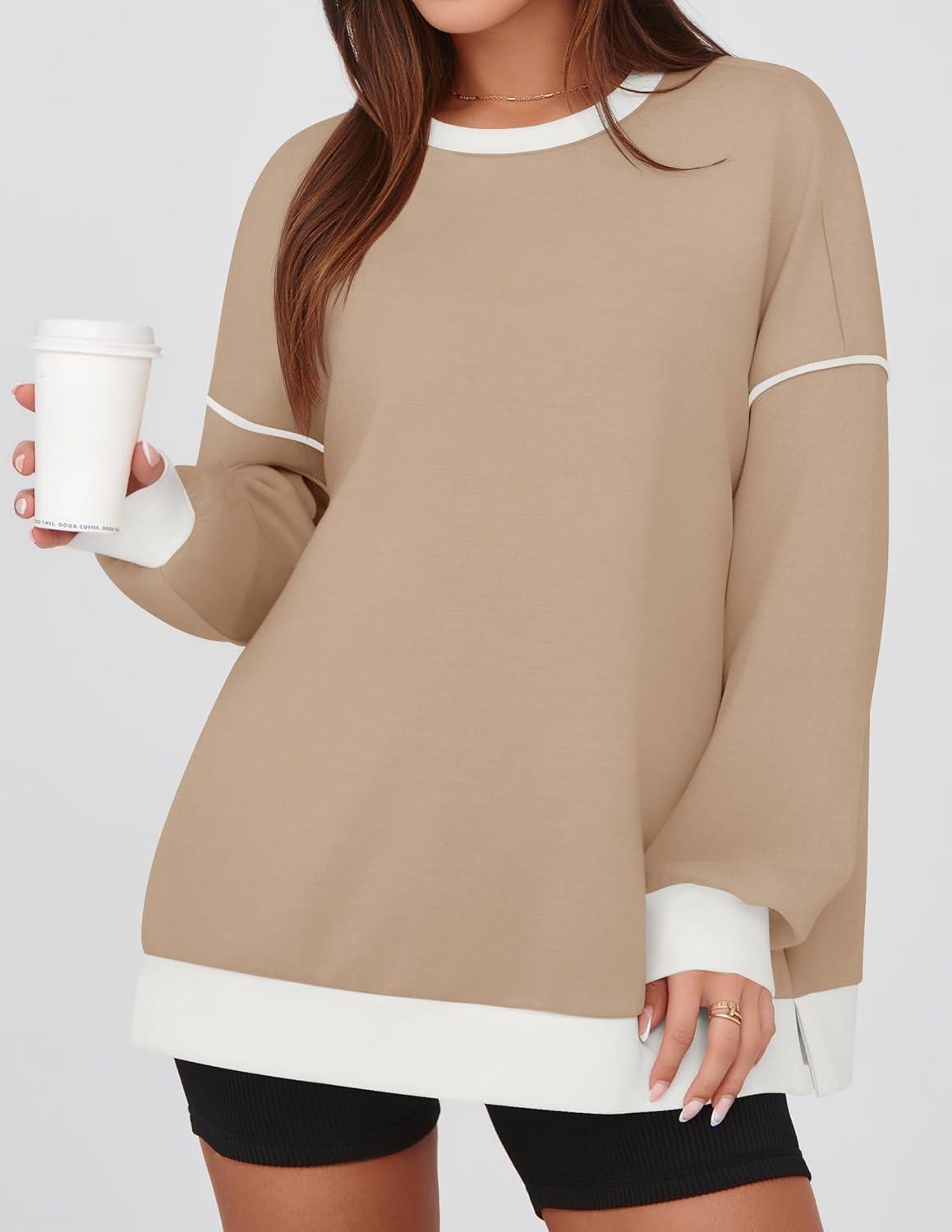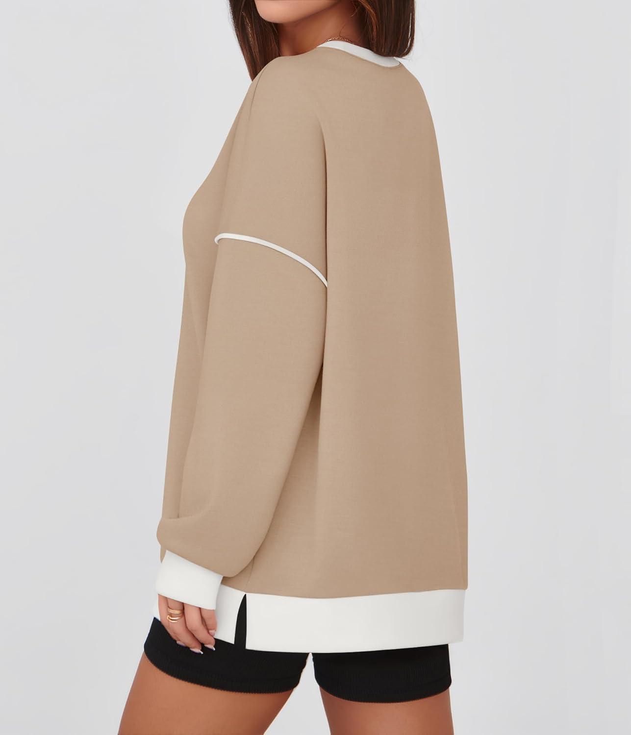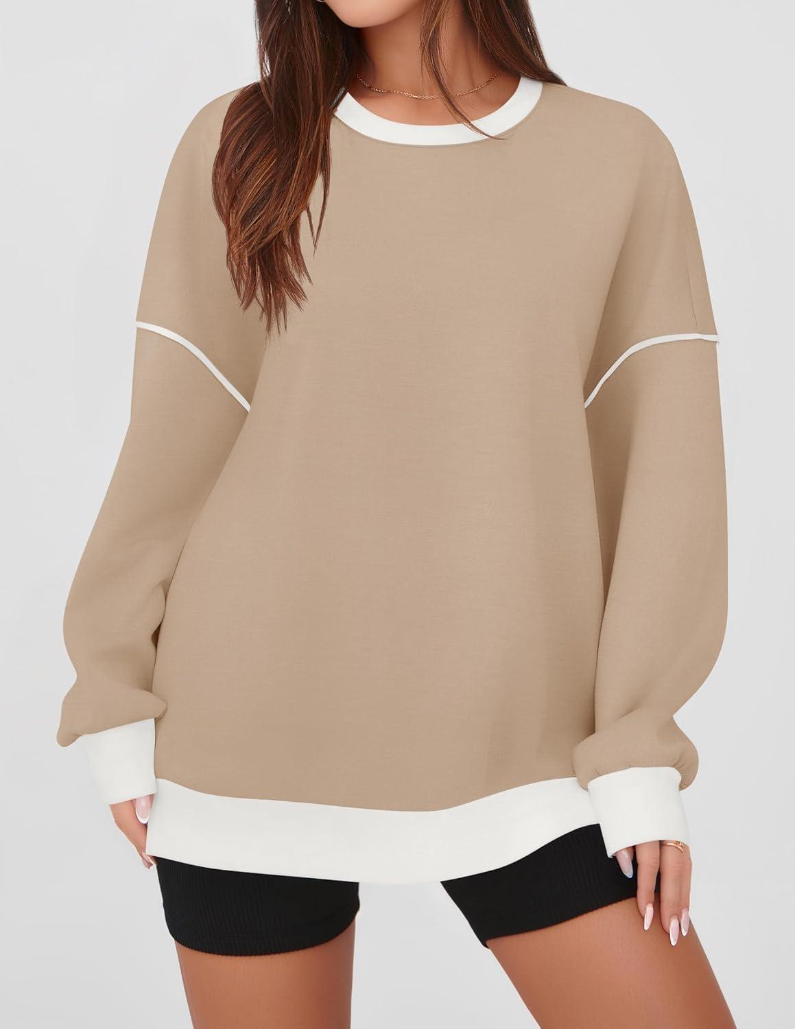 ZESICA Sweatshirts for Women Casual Long Sleeve Crewneck Contrast Color Oversized Pullover Tops Trendy Clothes(Light Khaki)