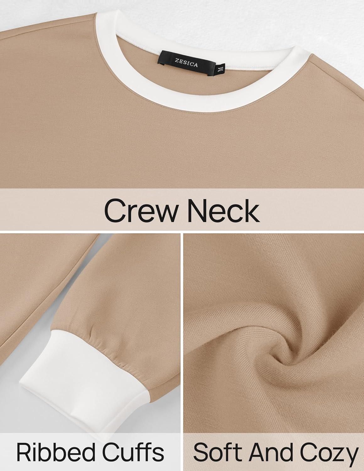 imageZESICA Sweatshirts for Women Casual Long Sleeve Crewneck Contrast Color Oversized Pullover Tops Trendy ClothesLight Khaki