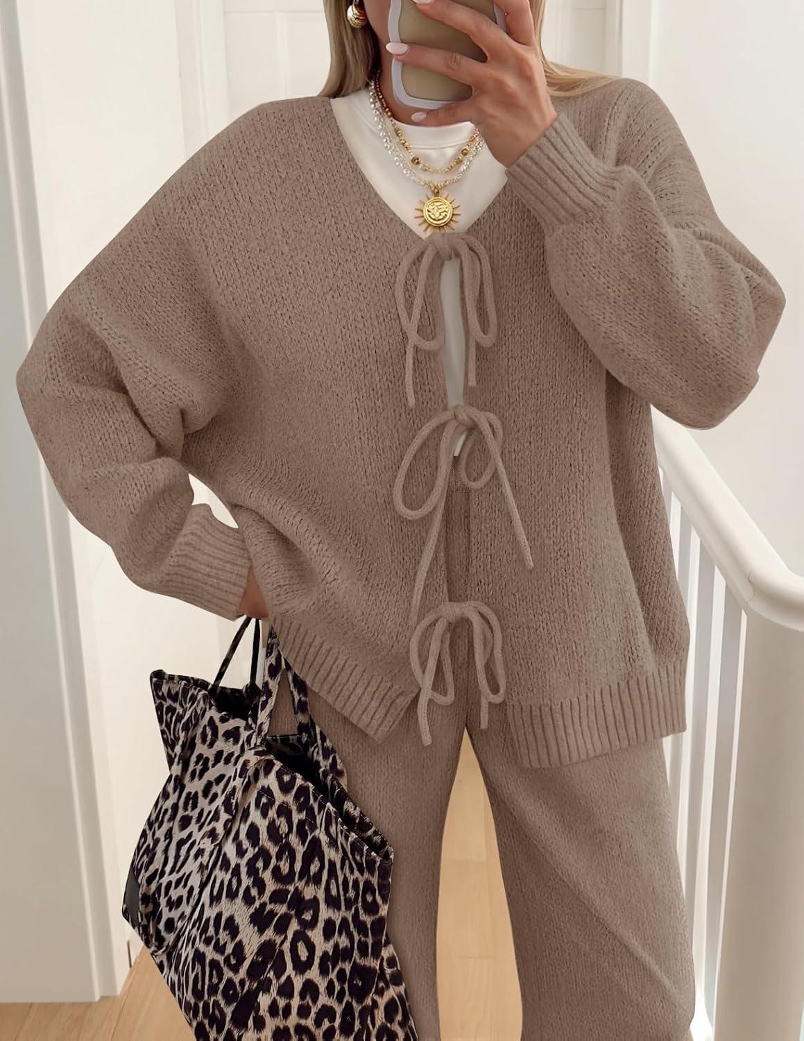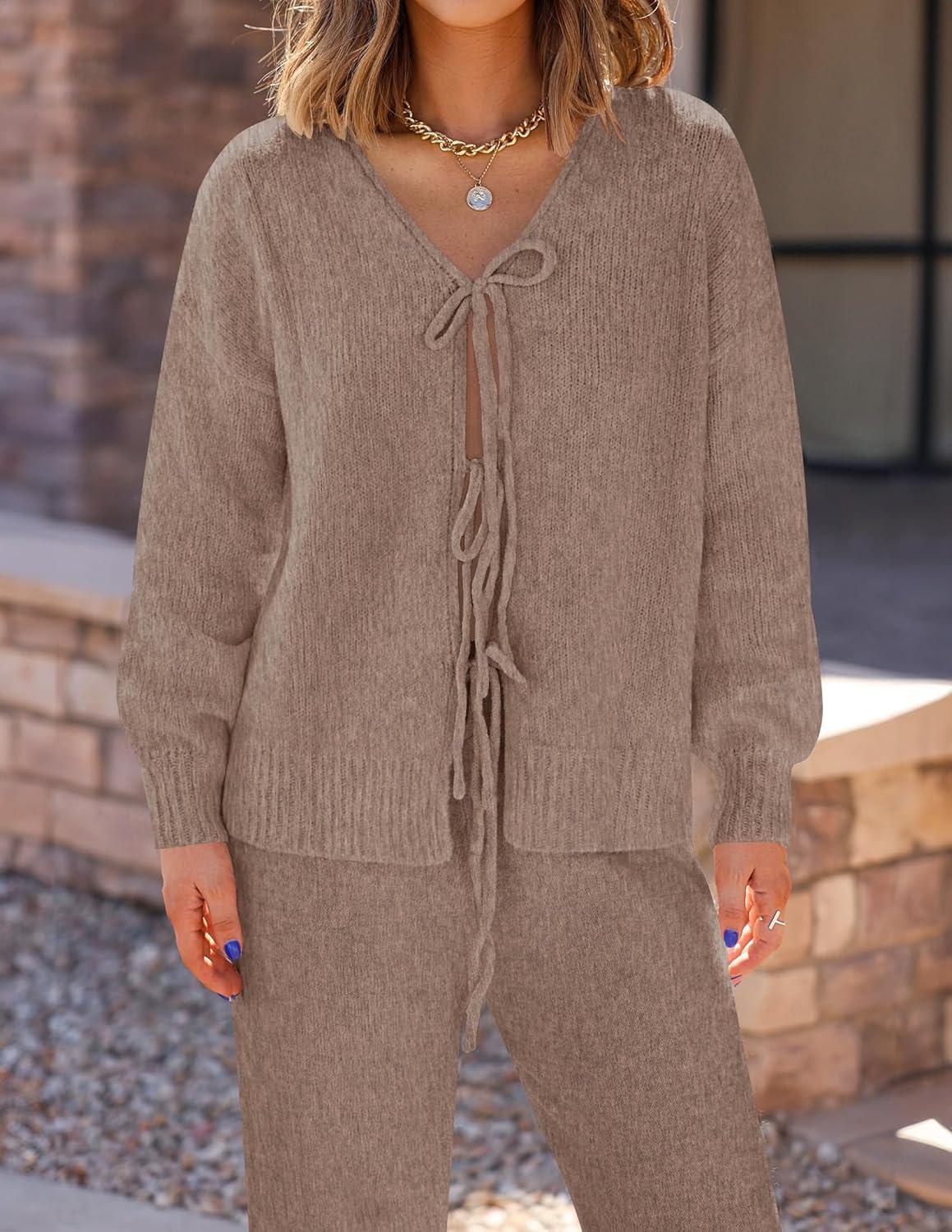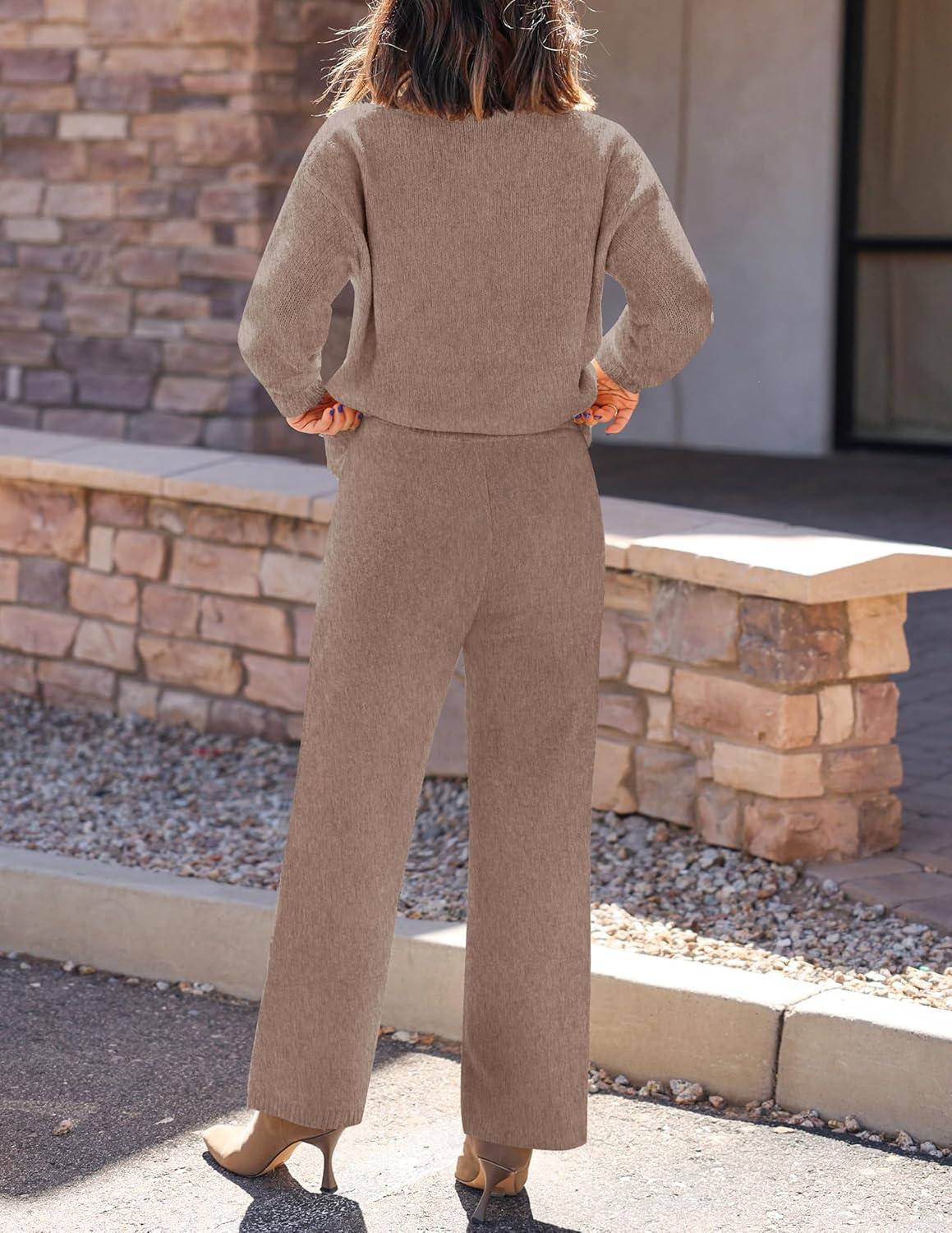 ZESICA Women’s 2 Piece Outfits Lounge Pajama Sets 2025 Fall Long Sleeve Cardigans Wide Leg Pants Matching Winter Clothes(Khaki)