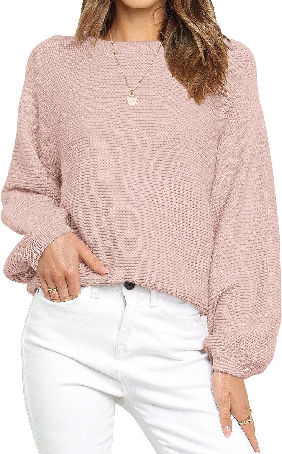 ZESICA Women’s 2023 Crew Neck Long Lantern Sleeve Casual Loose Ribbed Knit Solid Soft Pullover Sweater Tops(Dustypink)
