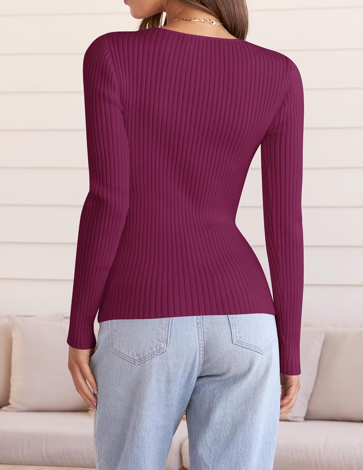 ZESICA Women’s 2024 Fall Long Sleeve V Neck T Shirts Ribbed Knit Sweater Slim Fit Solid Basic Casual Tee Tops(Eggplant)