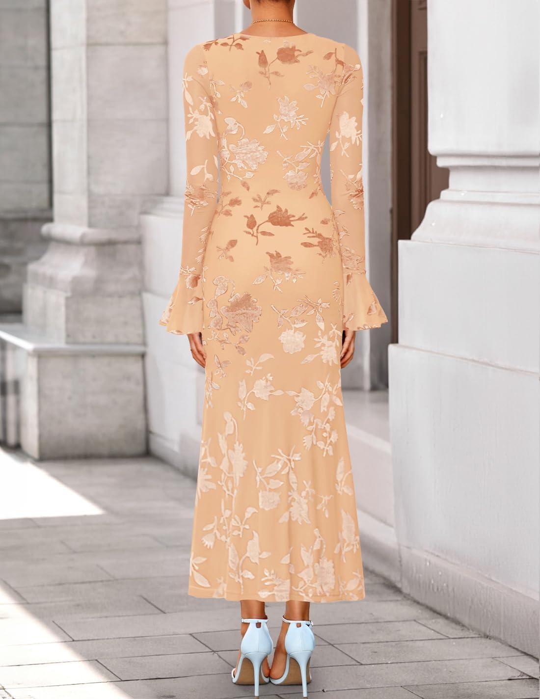 ZESICA Women’s 2025 Bell Long Sleeve Floral Maxi Dress Fall Fashion Bodycon Mesh Wedding Guest Cocktail Party Dresses(Redapricot)
