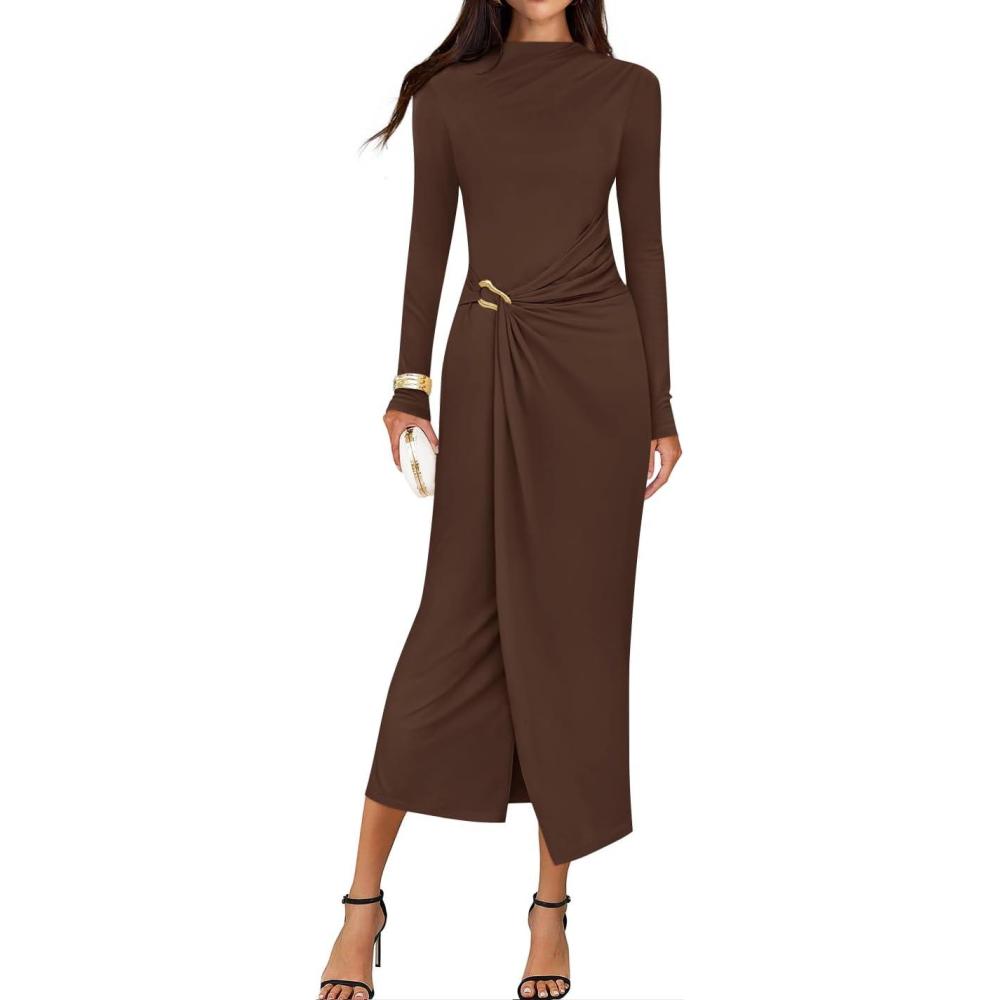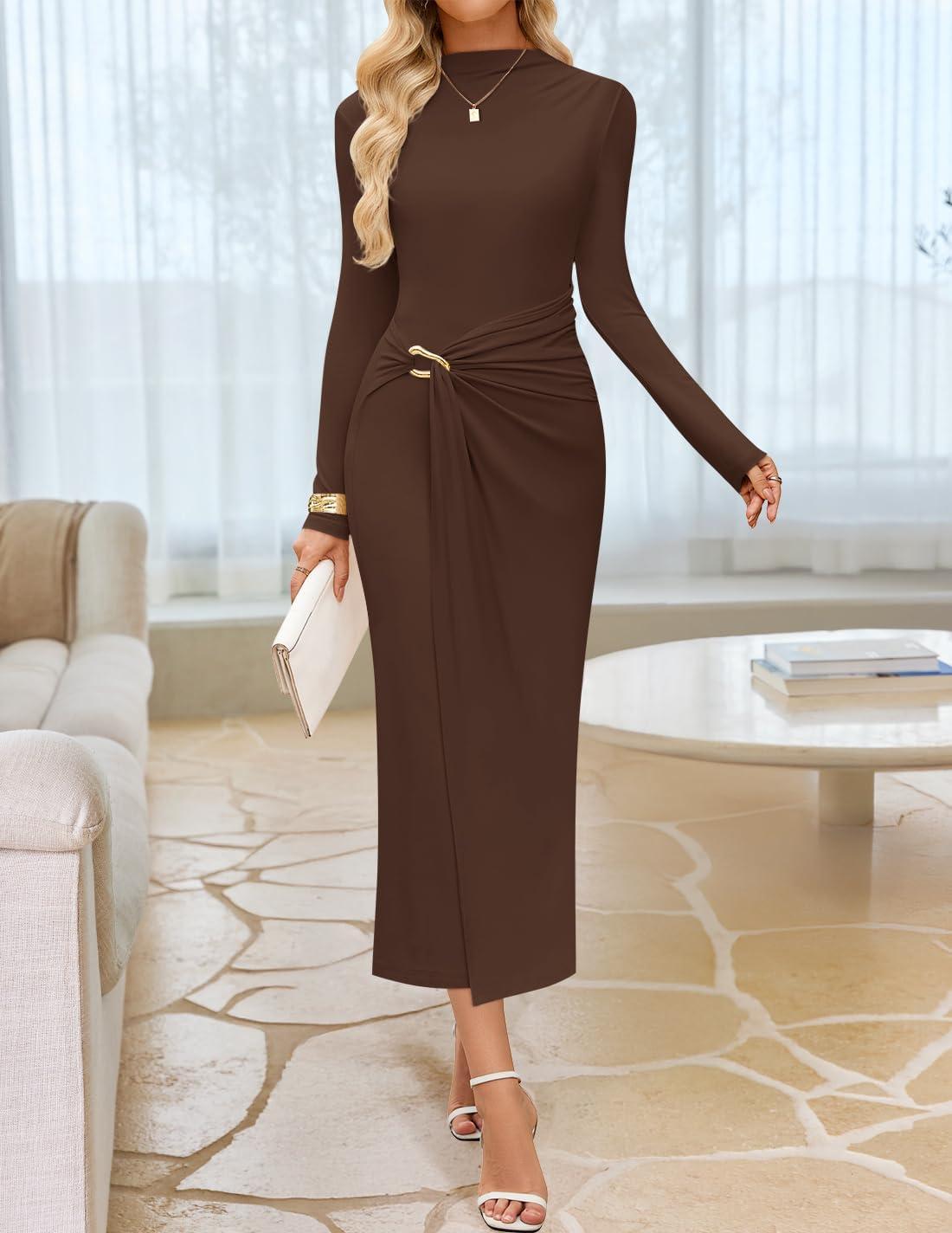 ZESICA Women’s 2025 Fall Long Sleeve Bodycon Dress Mock Neck Wedding Guest Cocktail Party Long Midi Dresses(Brown)