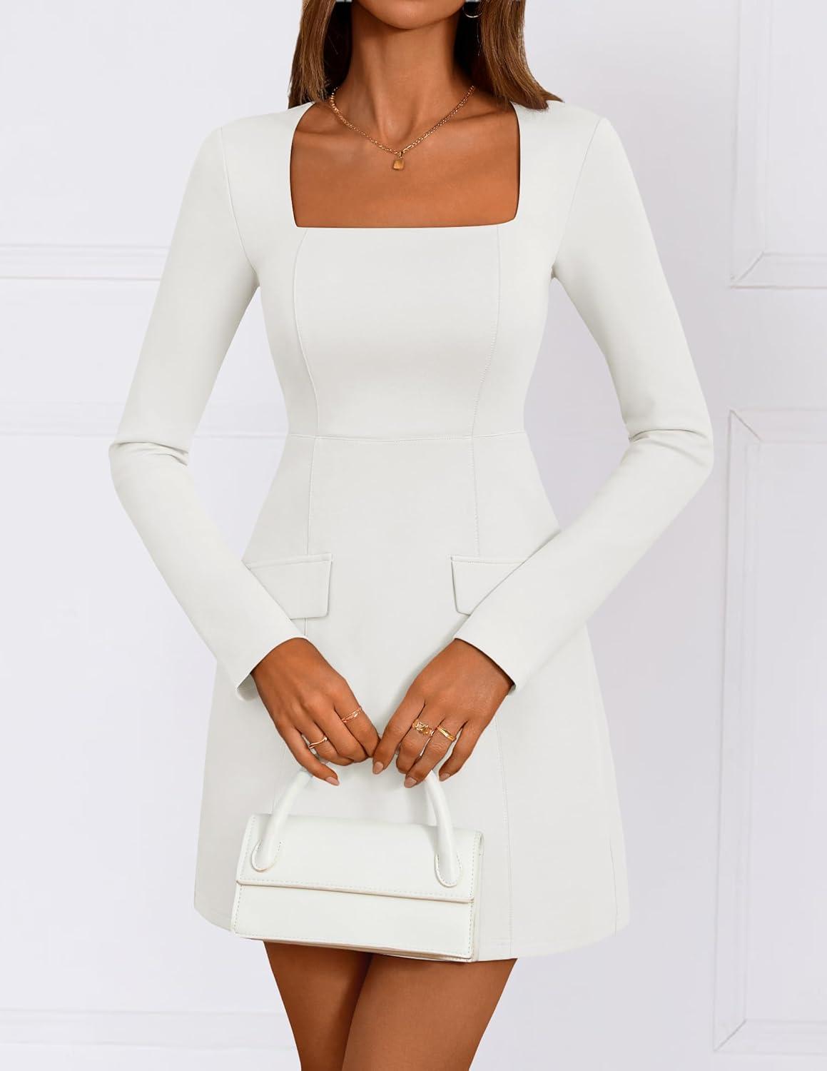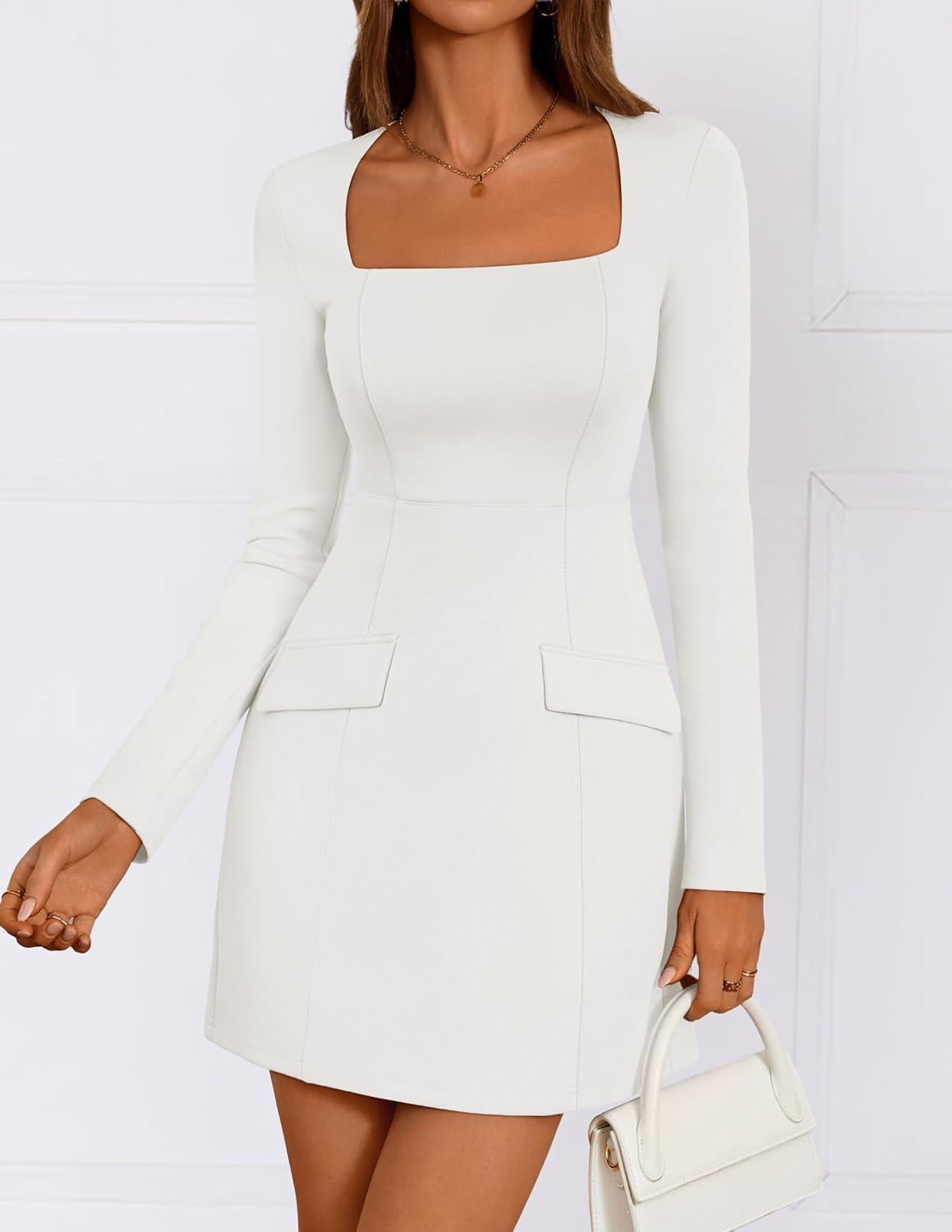ZESICA Women's 2025 Fall Long Sleeve Bodycon Mini Dress Casual Square Neck Slim Fit Cocktail Party Short Dresses(White)