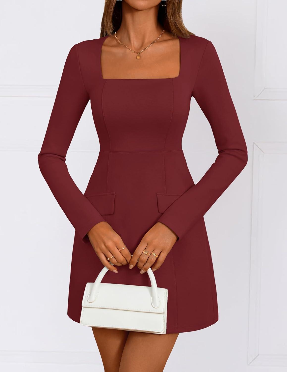 ZESICA Women’s 2025 Fall Long Sleeve Bodycon Mini Dress Casual Square Neck Slim Fit Cocktail Party Short Dresses(Wine)