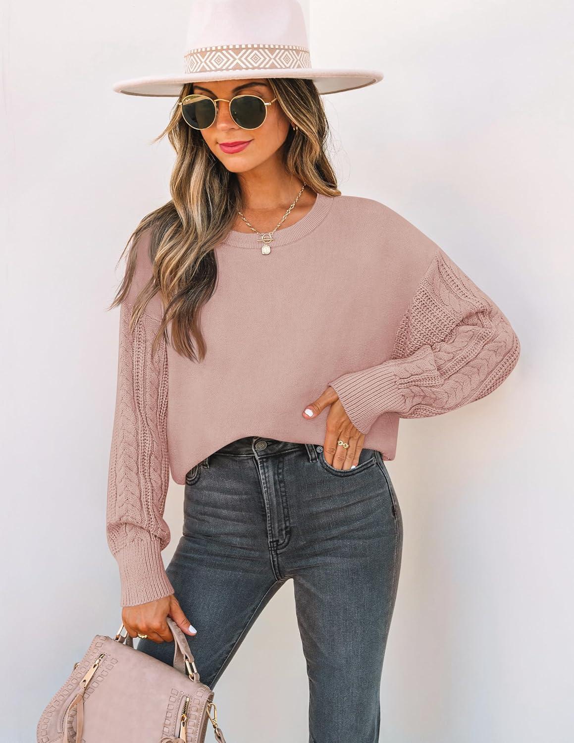 ZESICA Women’s 2025 Fall Long Sleeve Crew Neck Solid Color Cable Knit Chunky Casual Oversized Pullover Sweater Tops(Greypink)