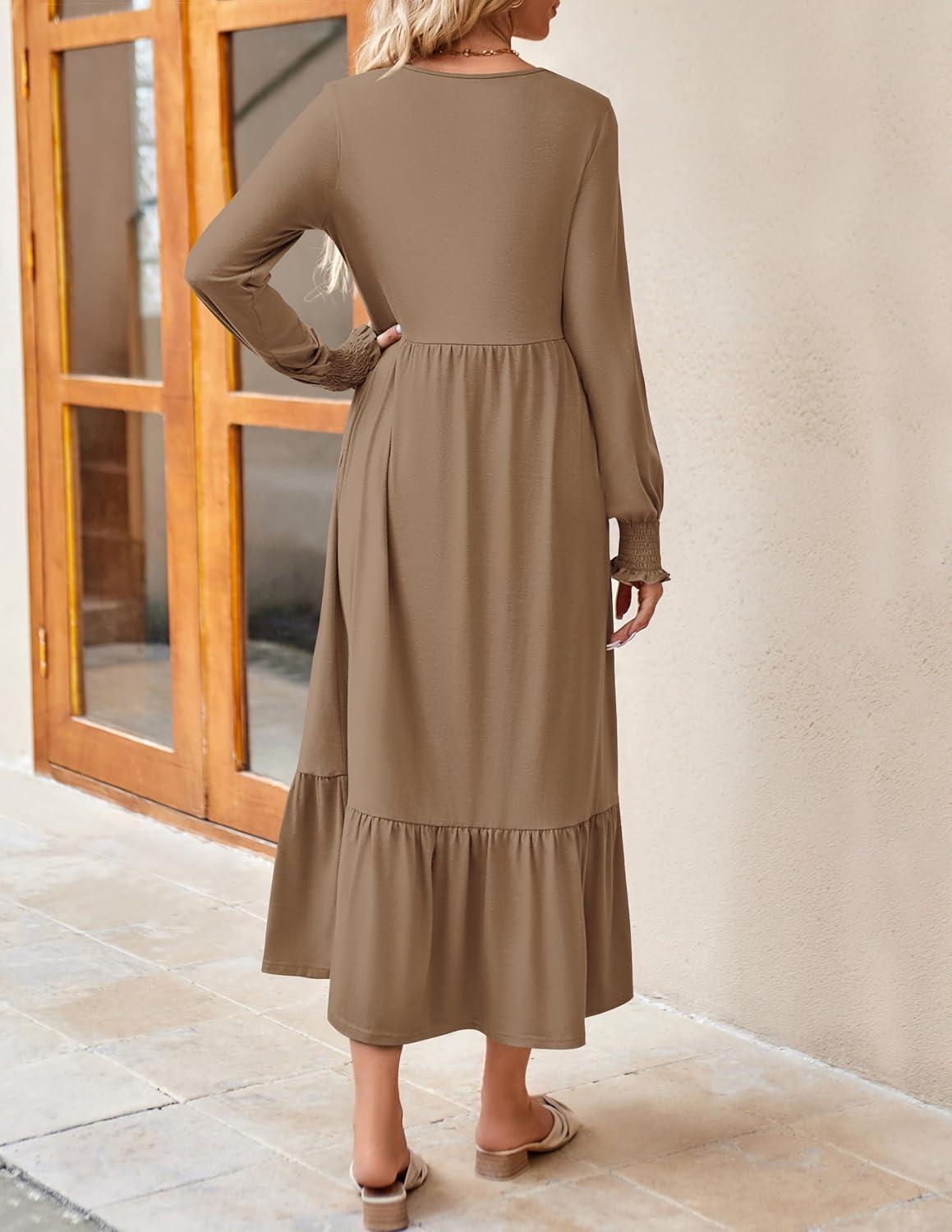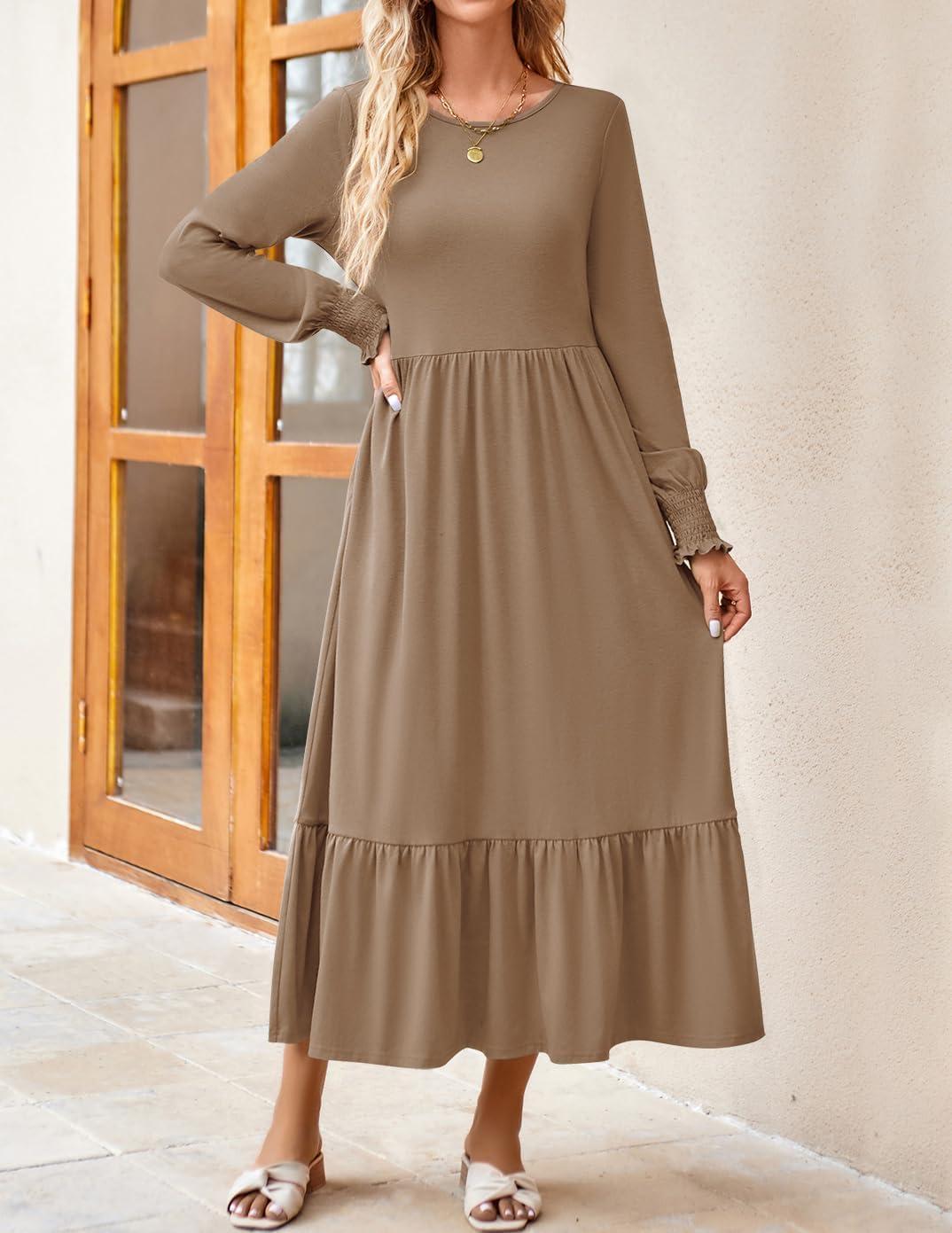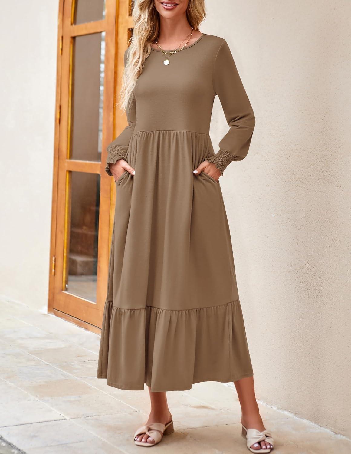 ZESICA Women's 2025 Fall Long Sleeve Dress Crewneck Casual Loose Pleated Tiered Swing Midi Dresses with Pockets(Khaki)