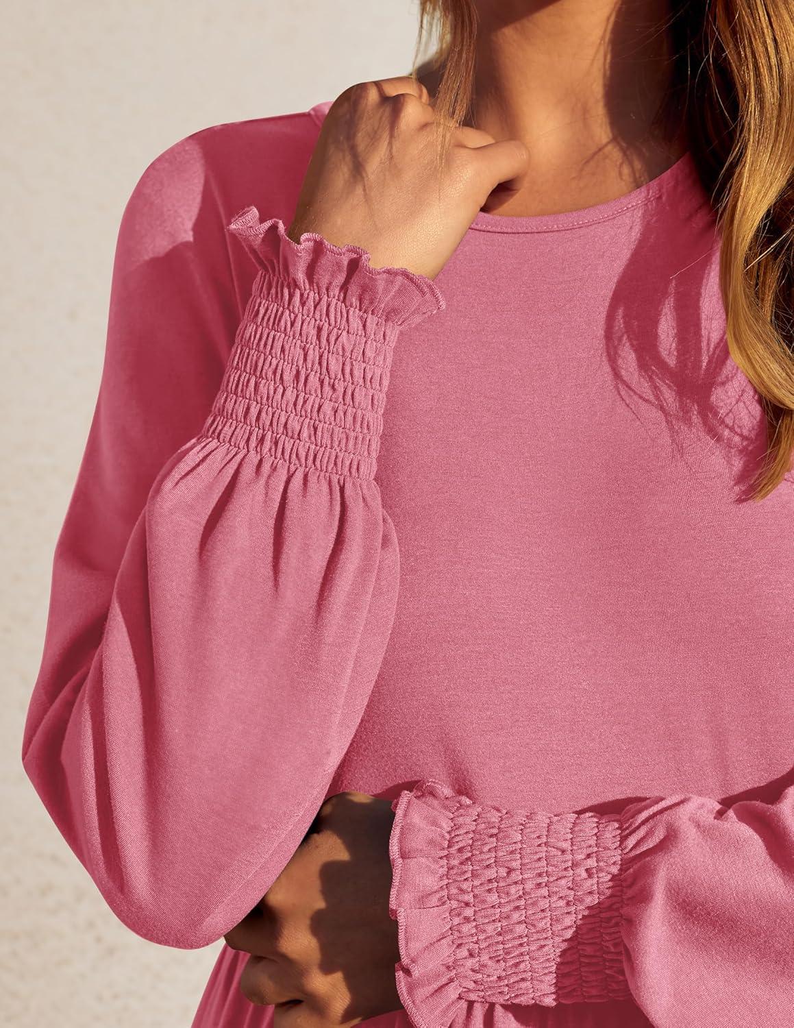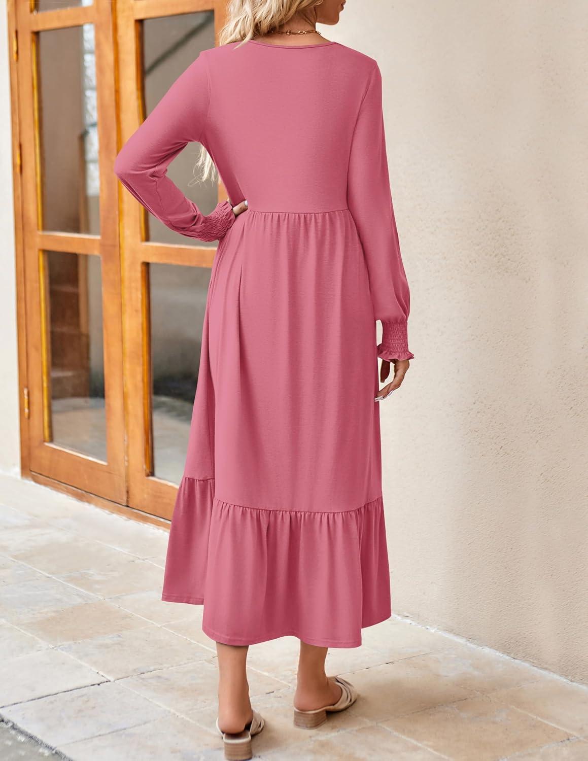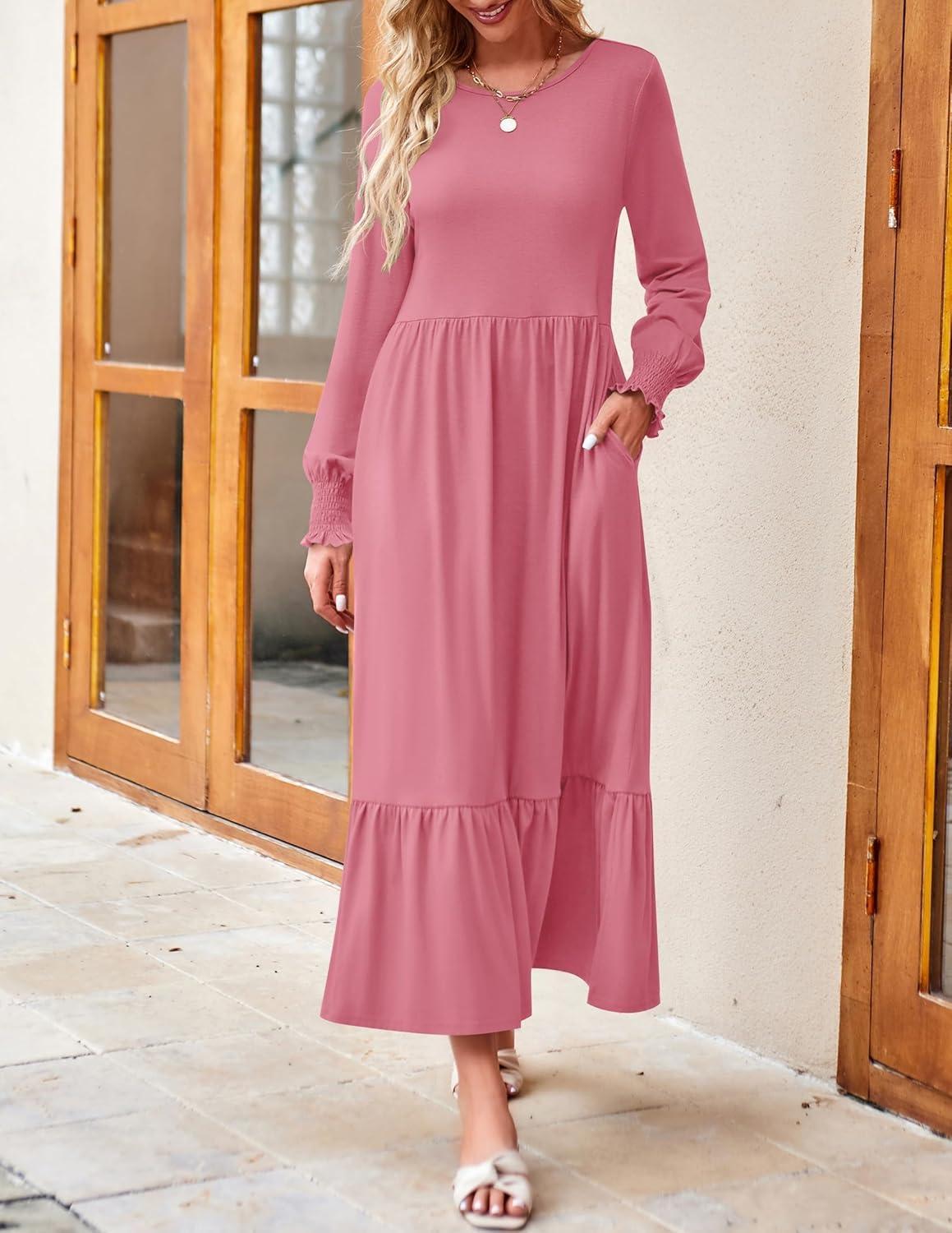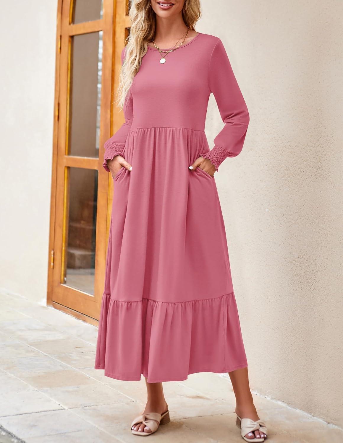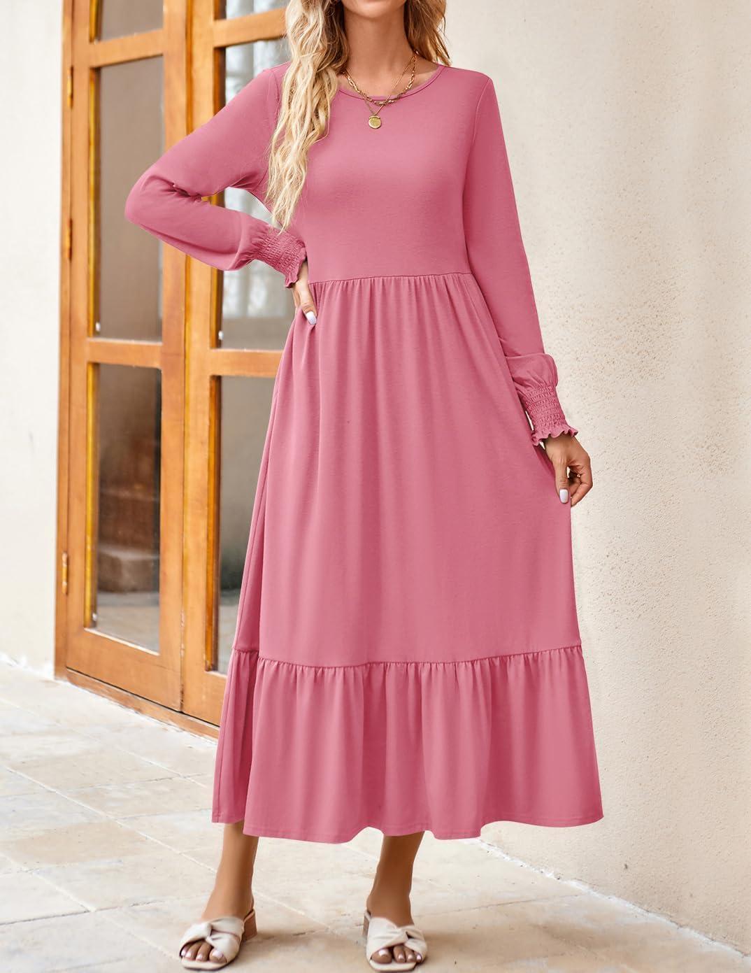 ZESICA Women’s 2025 Fall Long Sleeve Dress Crewneck Casual Loose Pleated Tiered Swing Midi Dresses with Pockets(Pink)